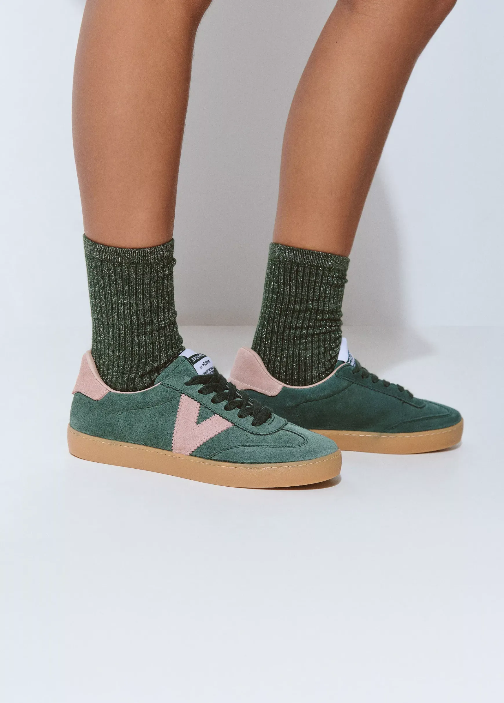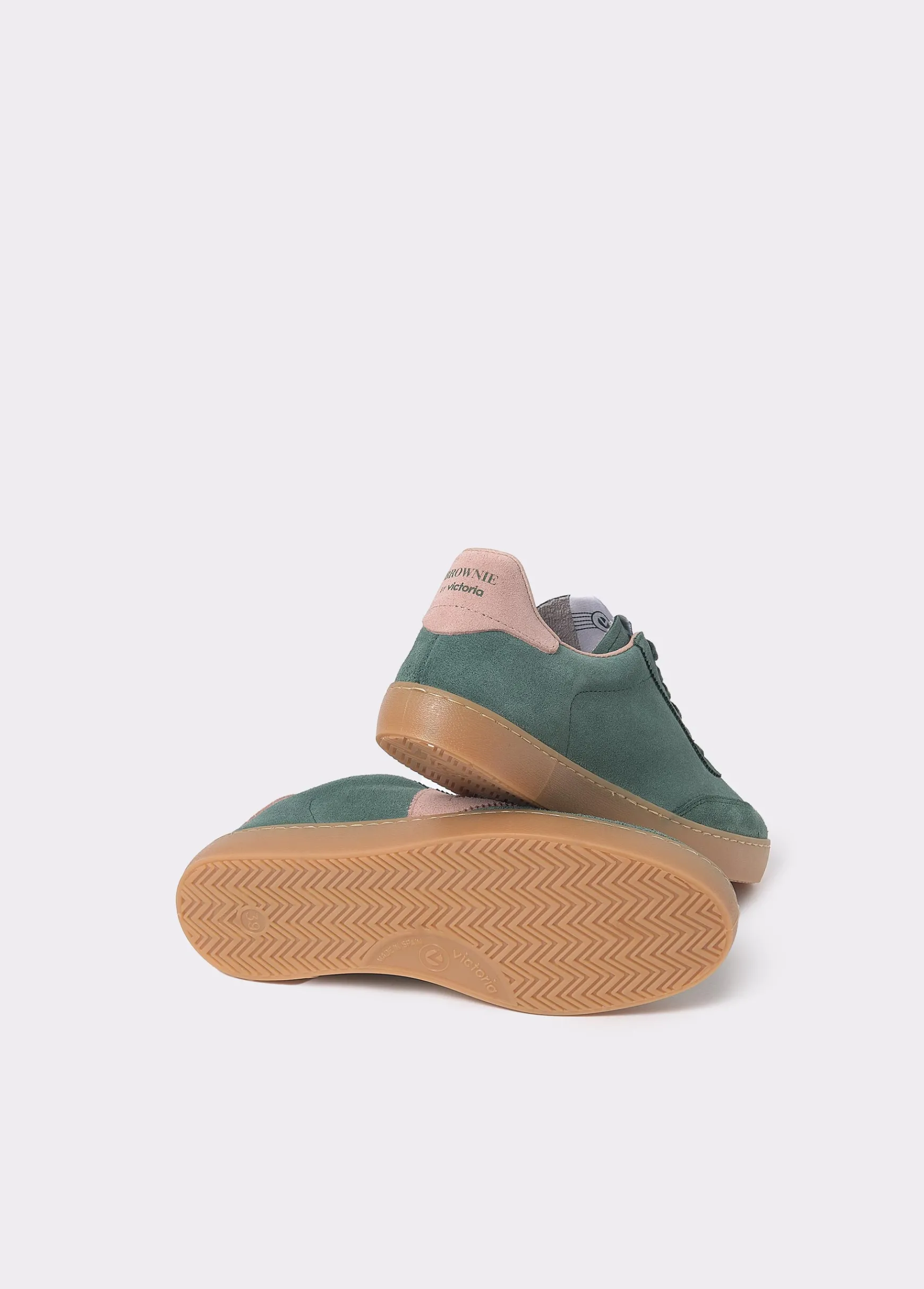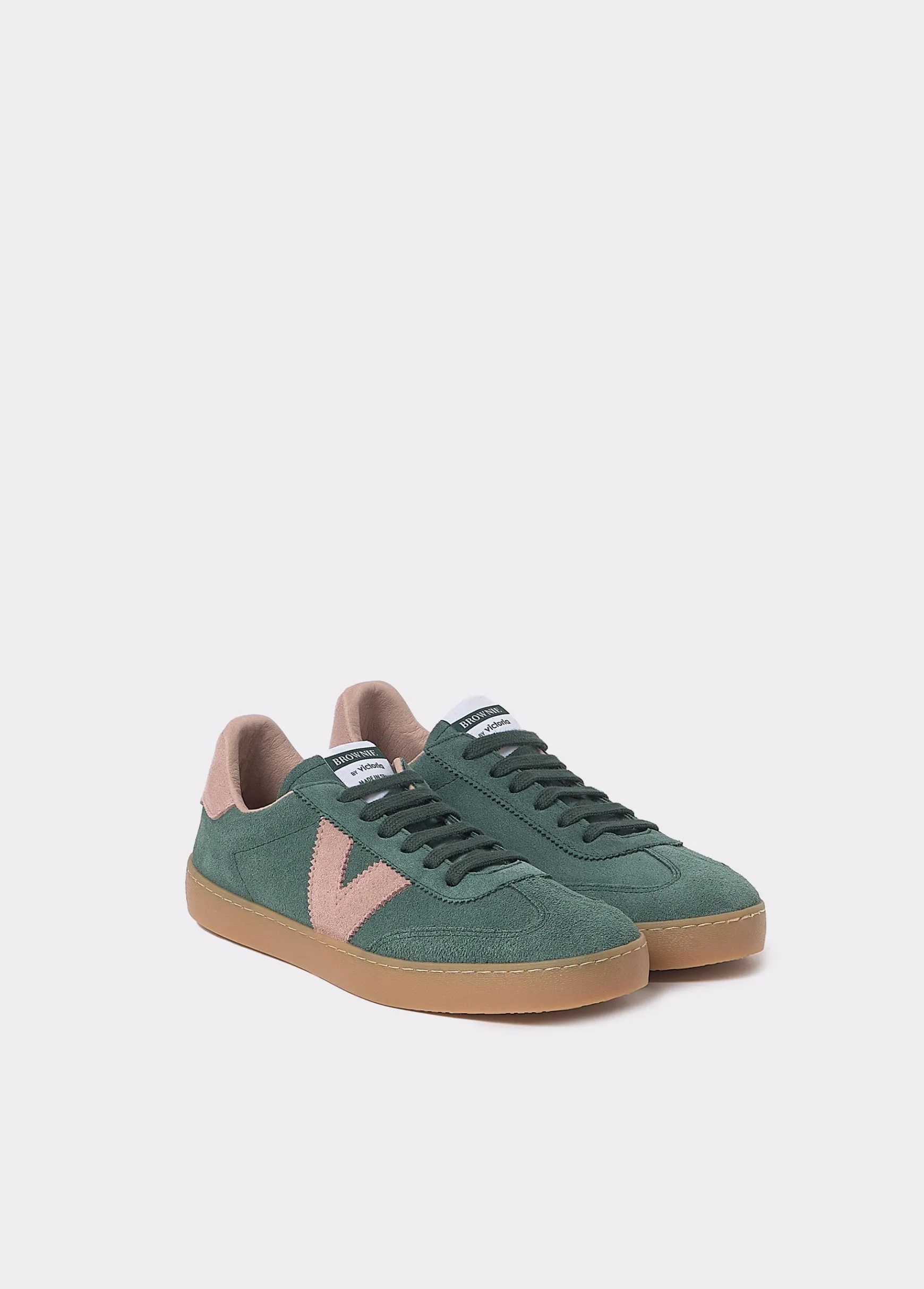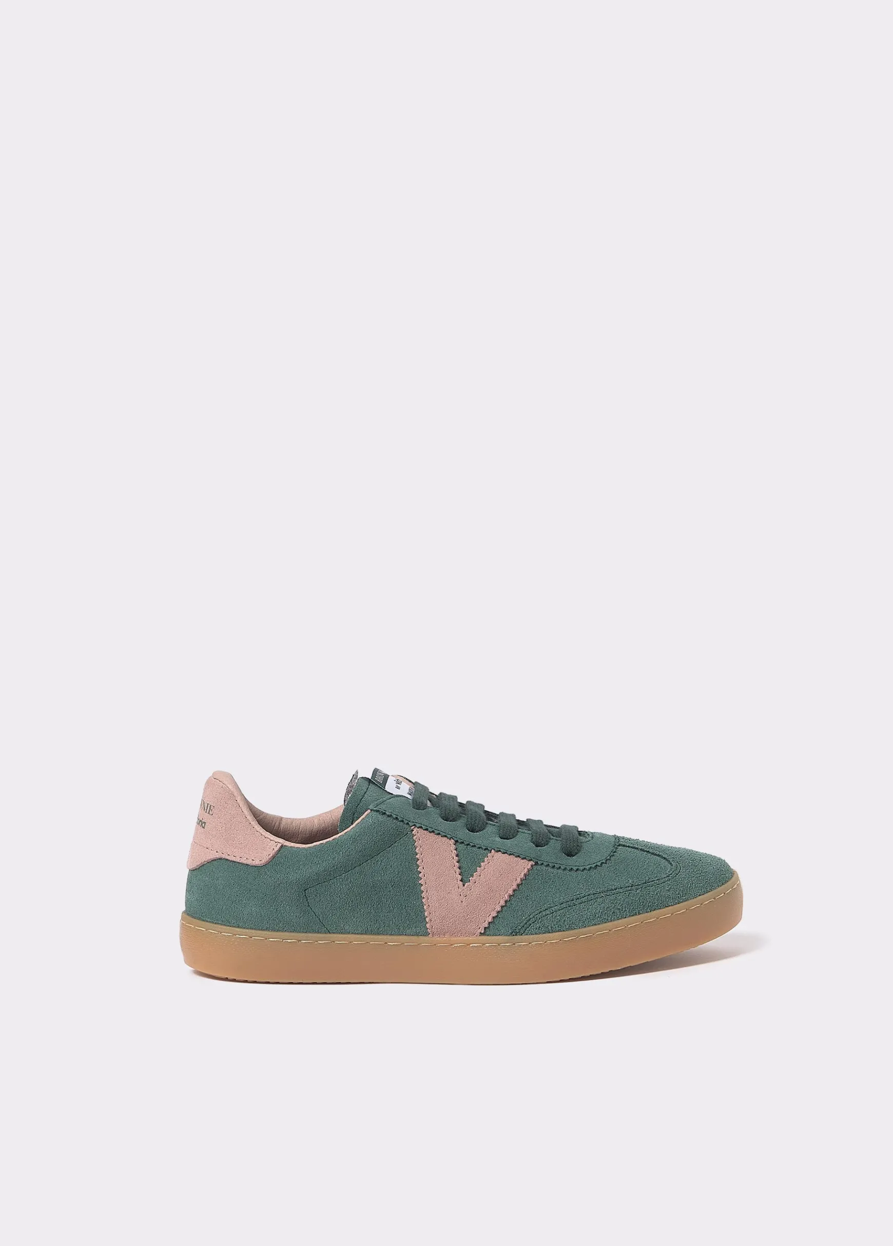 Bamba verde de piel en colaboración con Victoria con detalles en color rosa en los laterales y en la parte trasera.