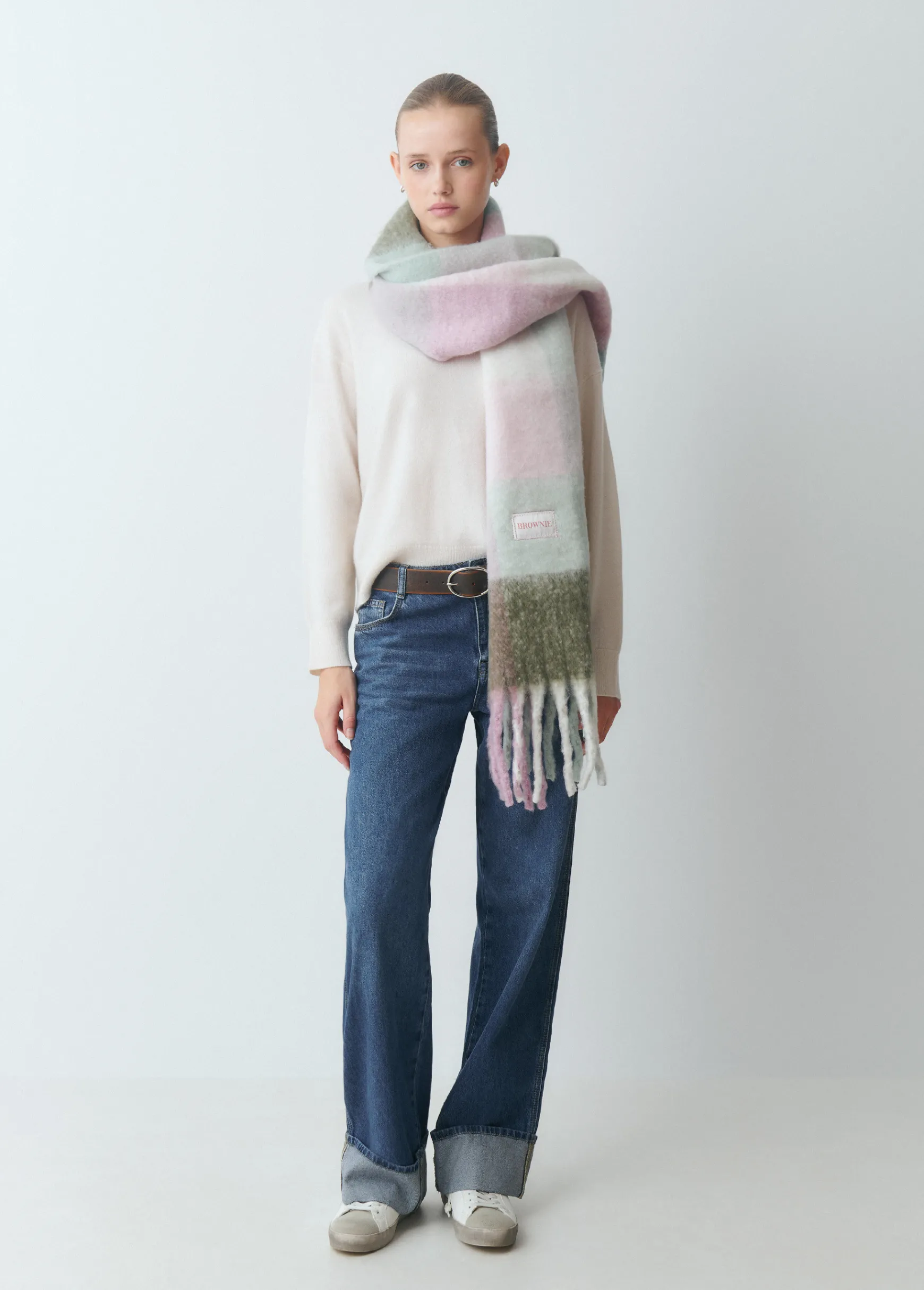 Bufanda gruesa de cuadros con flecos en color rosa.