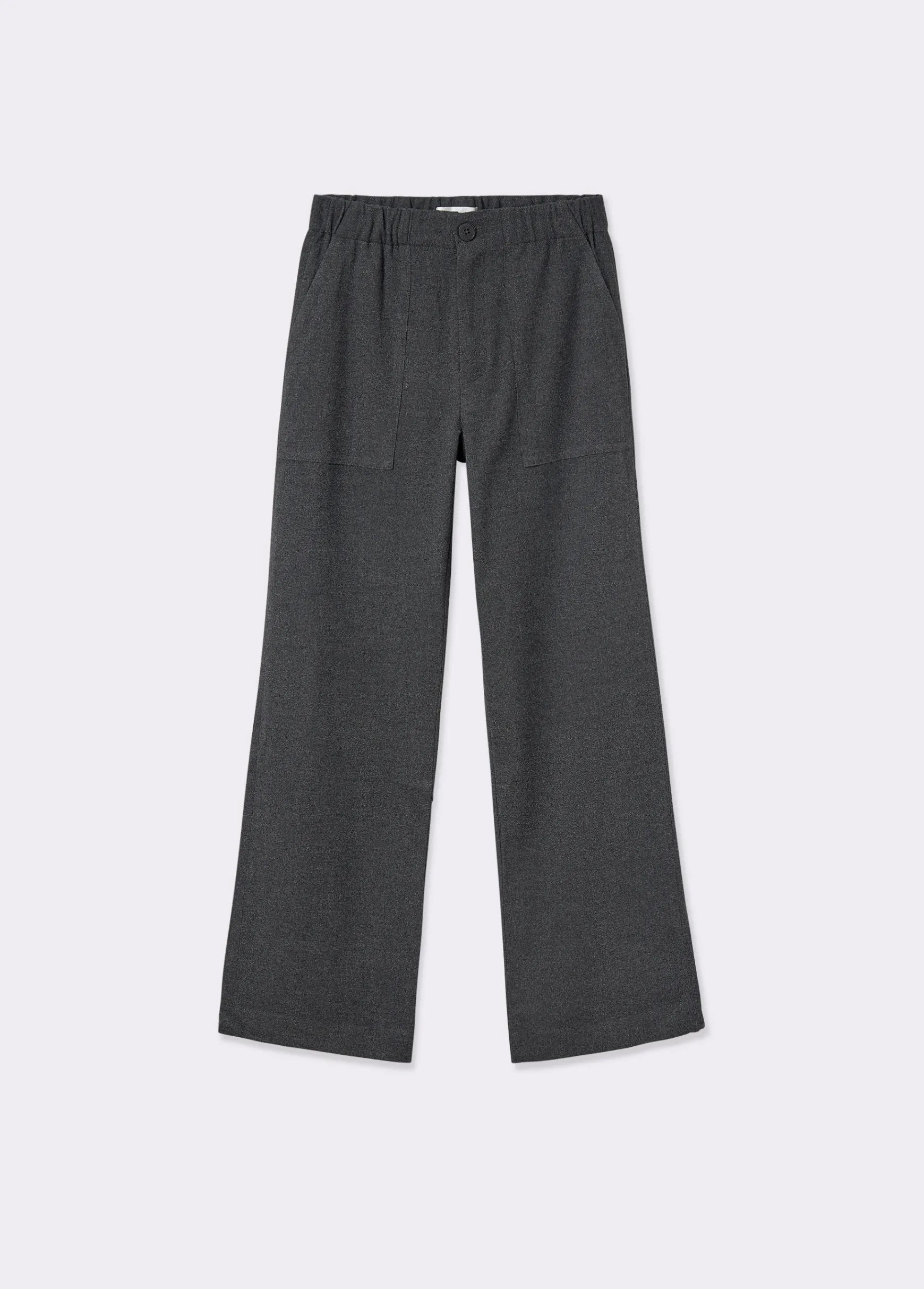 Pantalón recto con goma en la cintura y bolsillos. Cierre mediante cremallera y botón en el frontal.