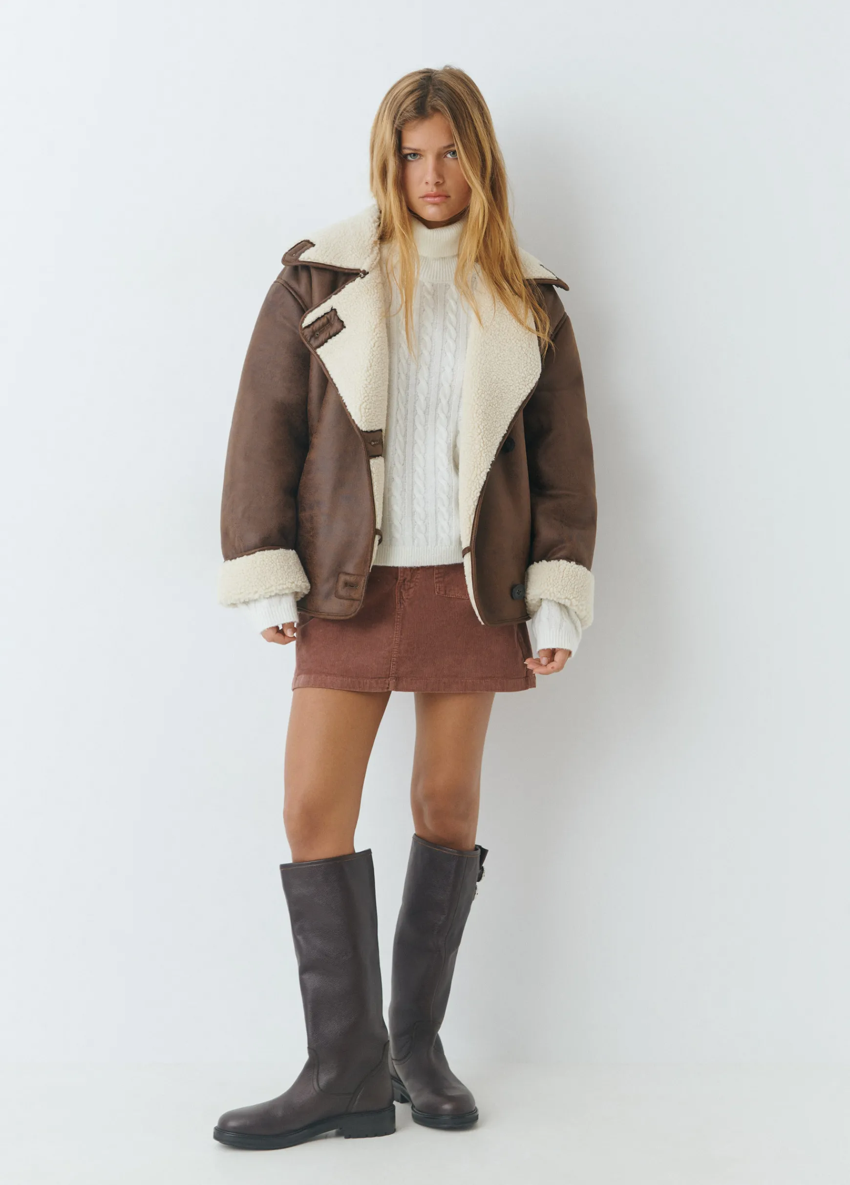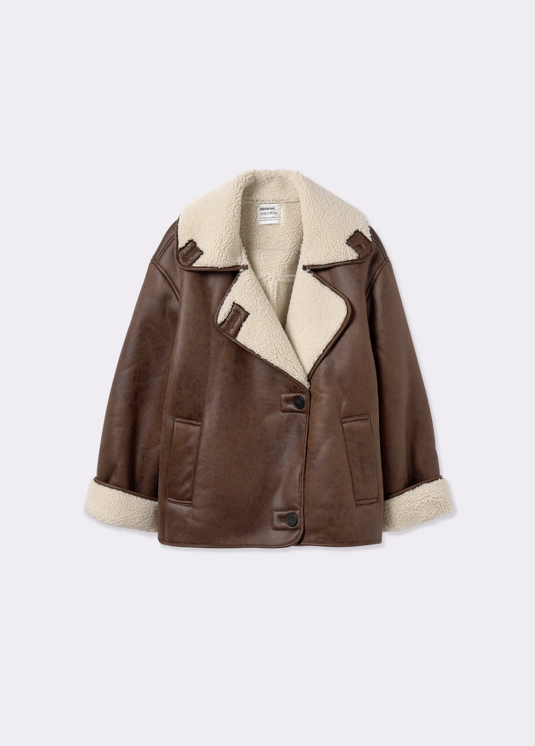 Abrigo doble faz efecto piel con solapas y bolsillos. Cierre mediante botones en la parte frontal.