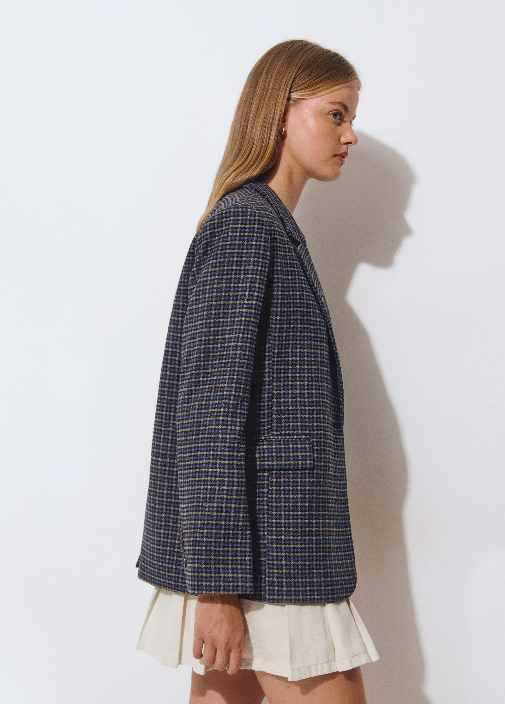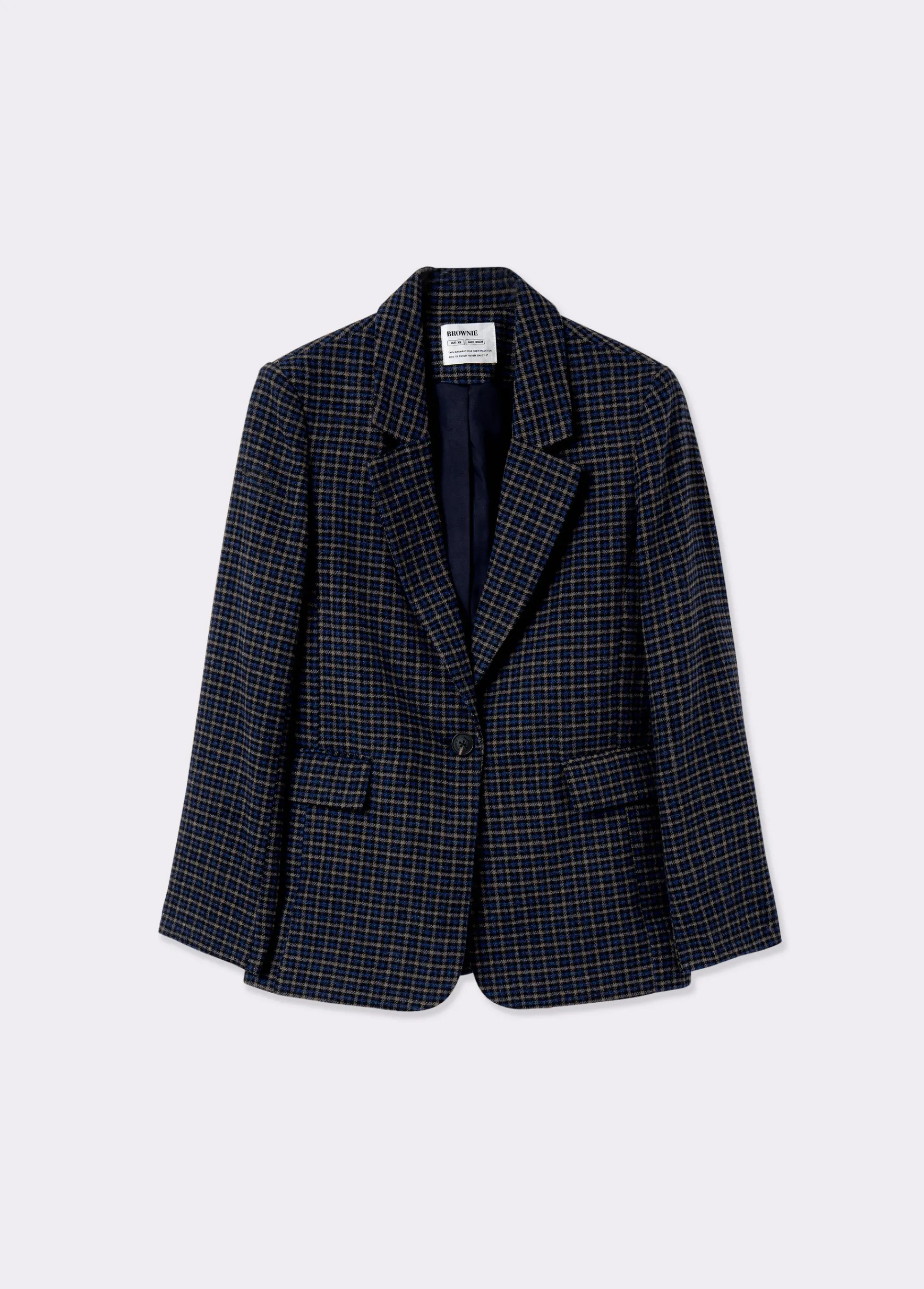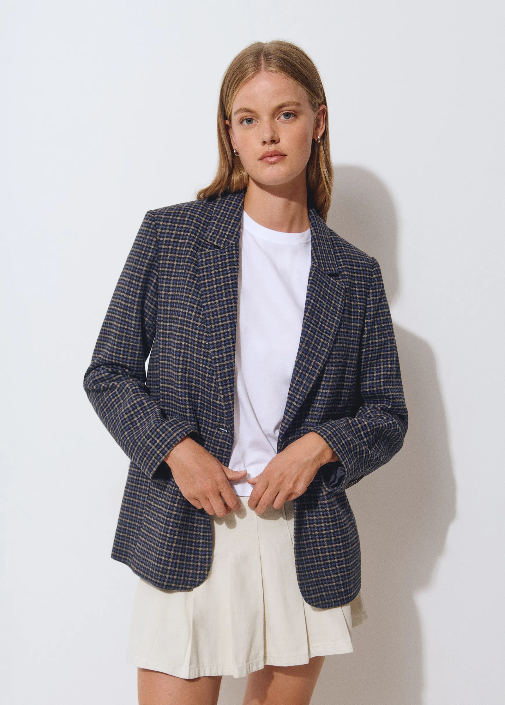 Americana de cuadros de manga larga, cuello con solapas, bolsillos y cierre mediante botón en el frontal.