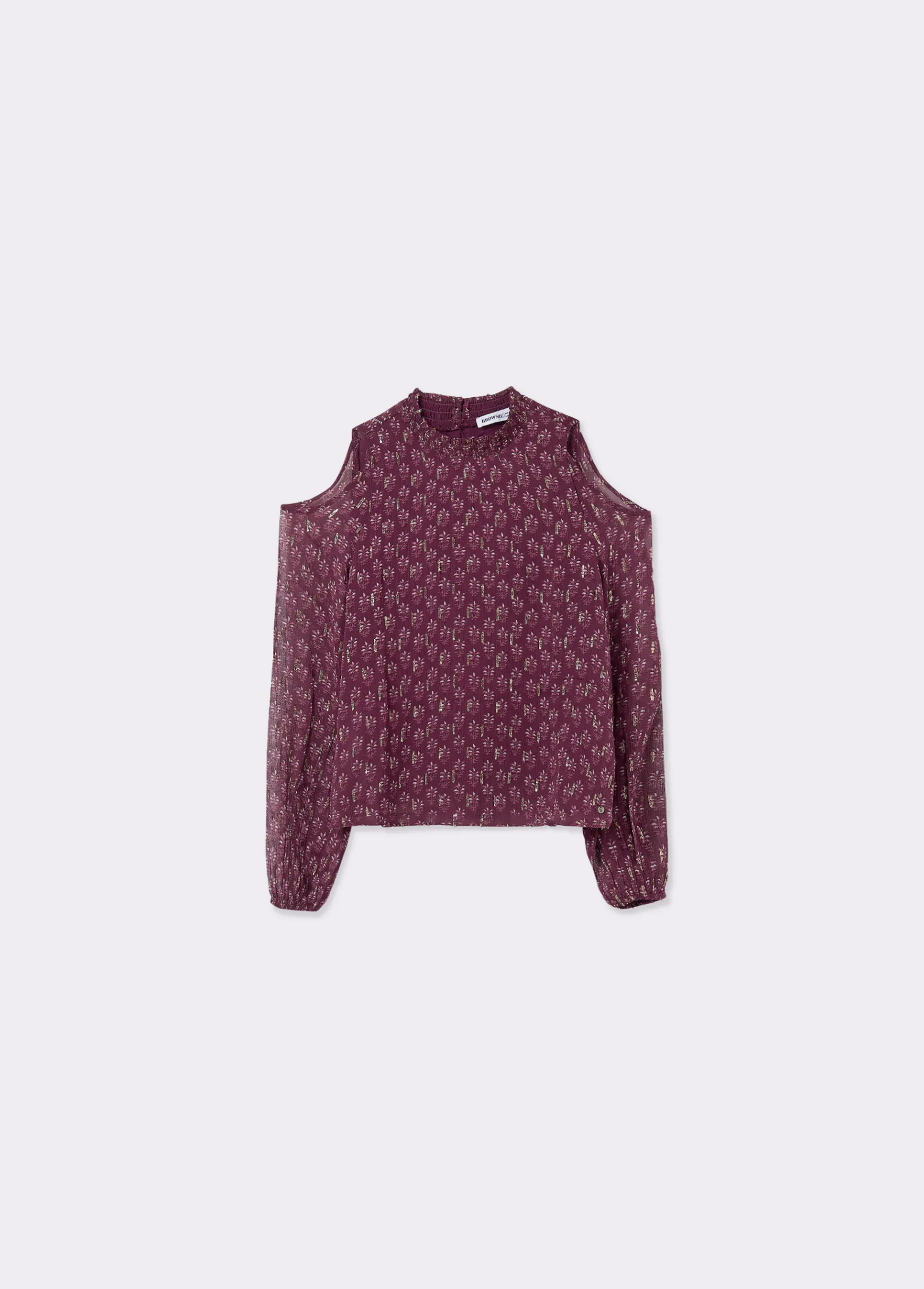 Blusa con estampado sello indio de manga larga abullonada, cuello redondo y hombros descubiertos.