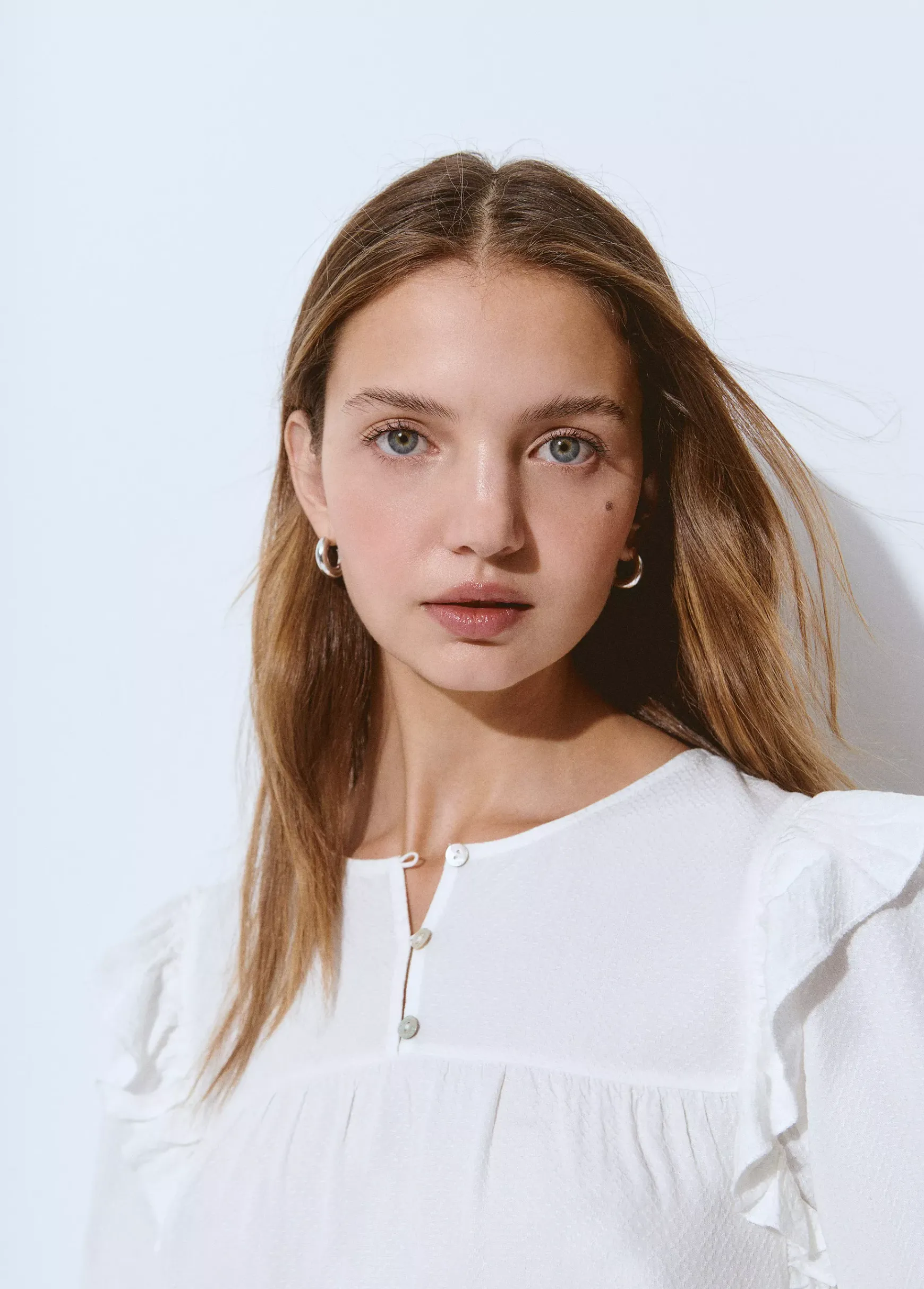 Blusa lisa de manga larga abullonada con detalle de volantes.