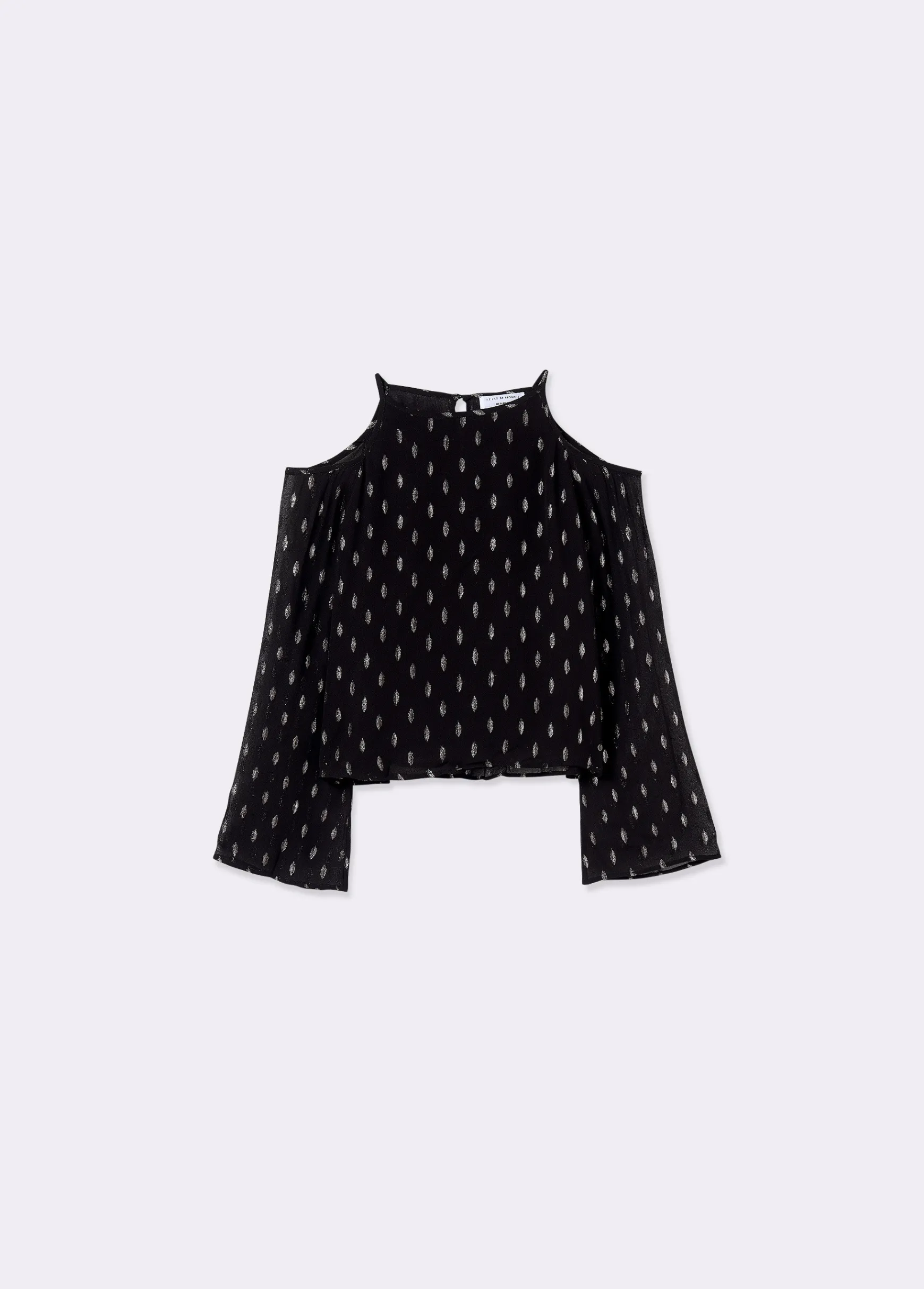 Blusa estampada de manga larga abullonada, hombros descubiertos y detalles con lurex.
