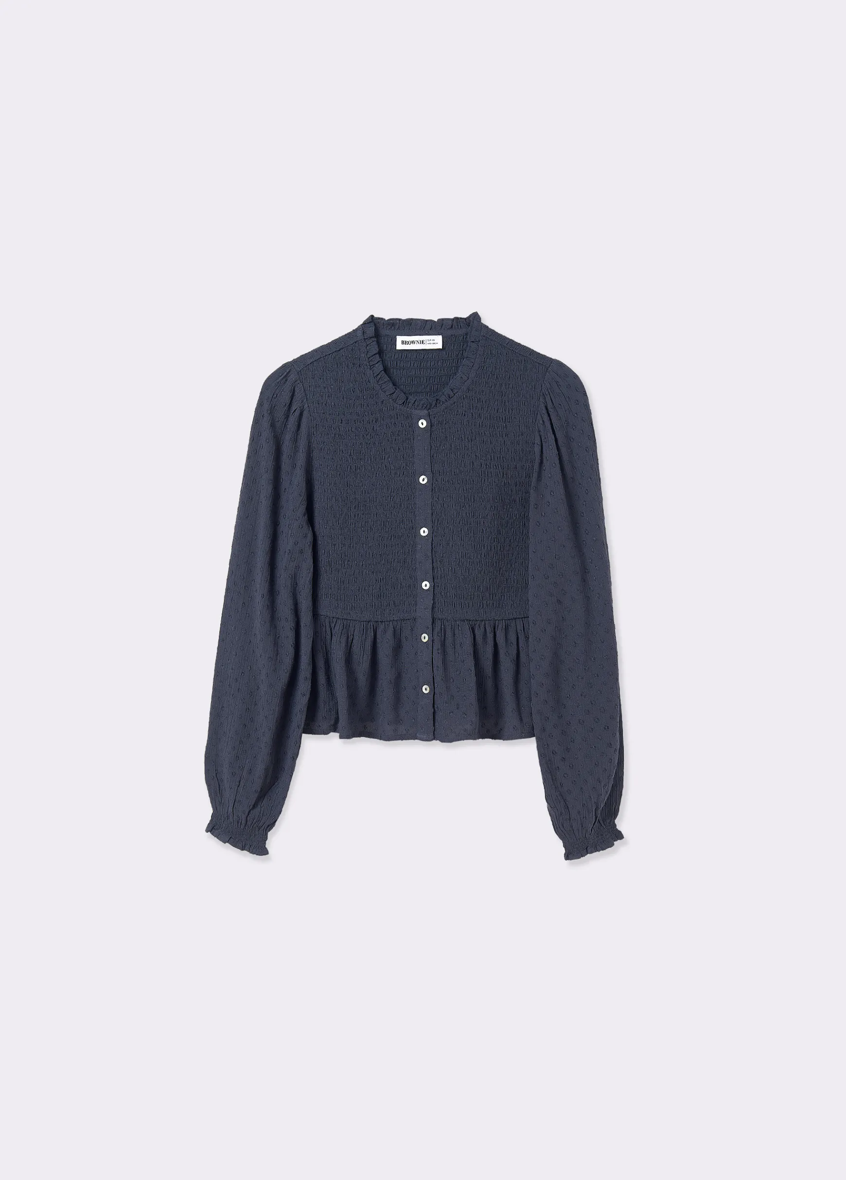 Blusa de manga larga abullonada y cuello redondo con smock. Cierre mediante botones en el frontal.