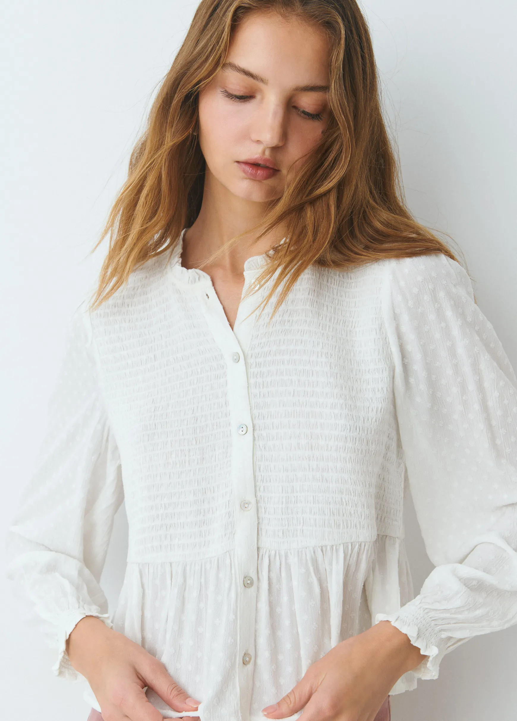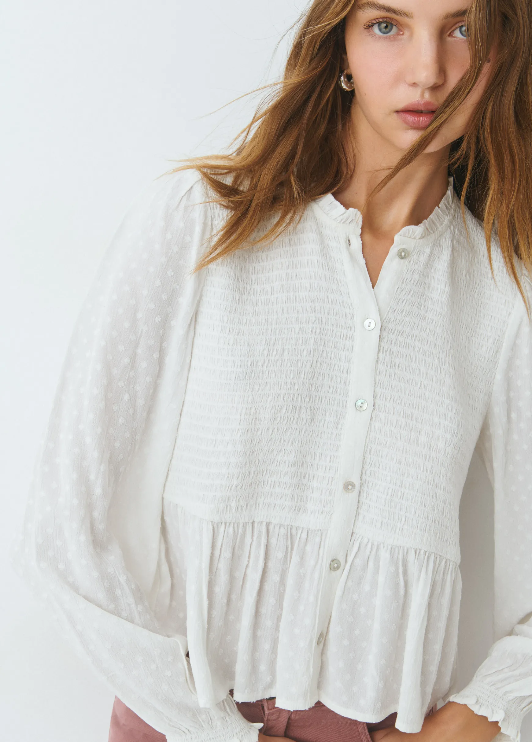 Blusa de manga larga abullonada y cuello redondo con smock. Cierre mediante botones en el frontal.