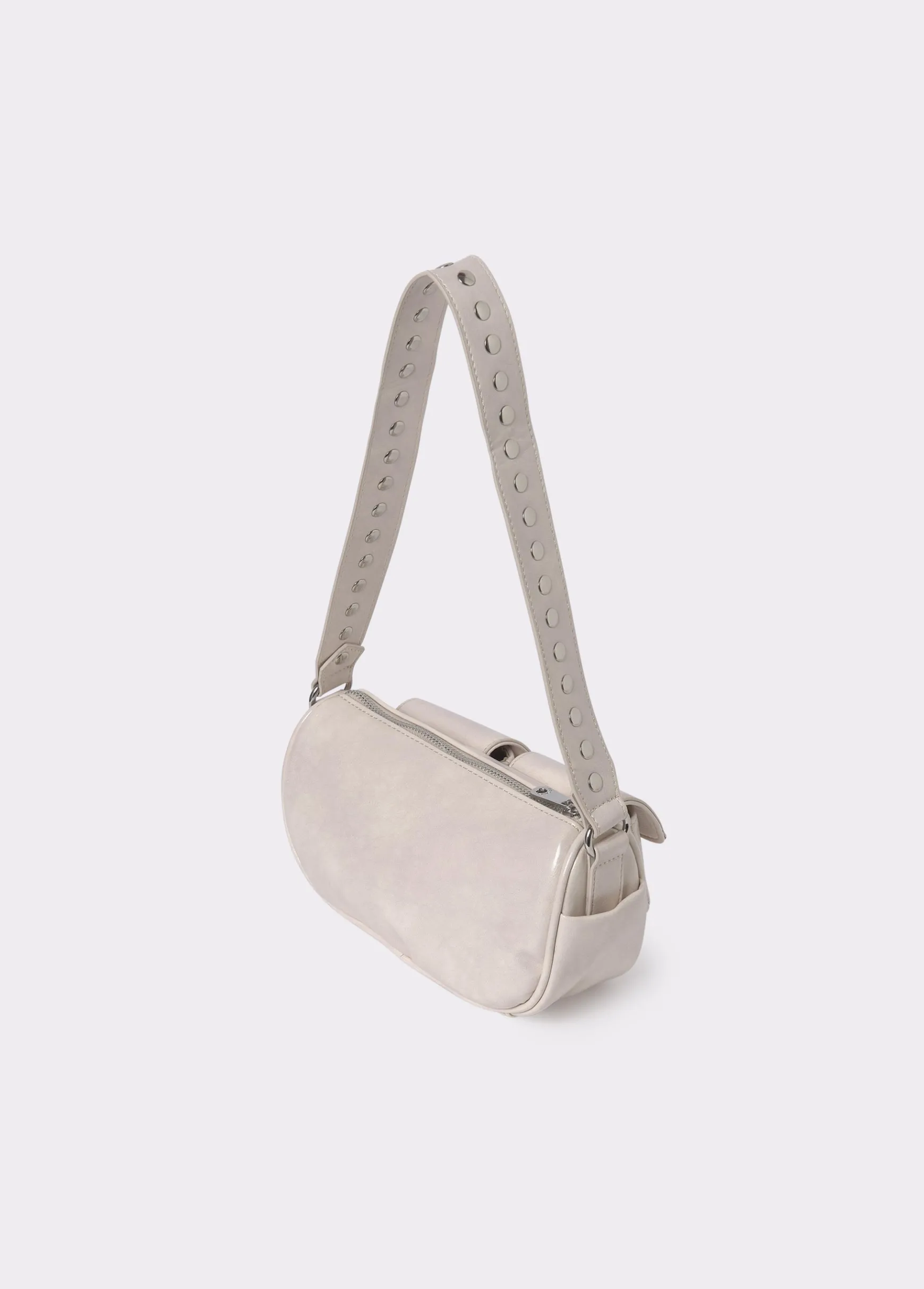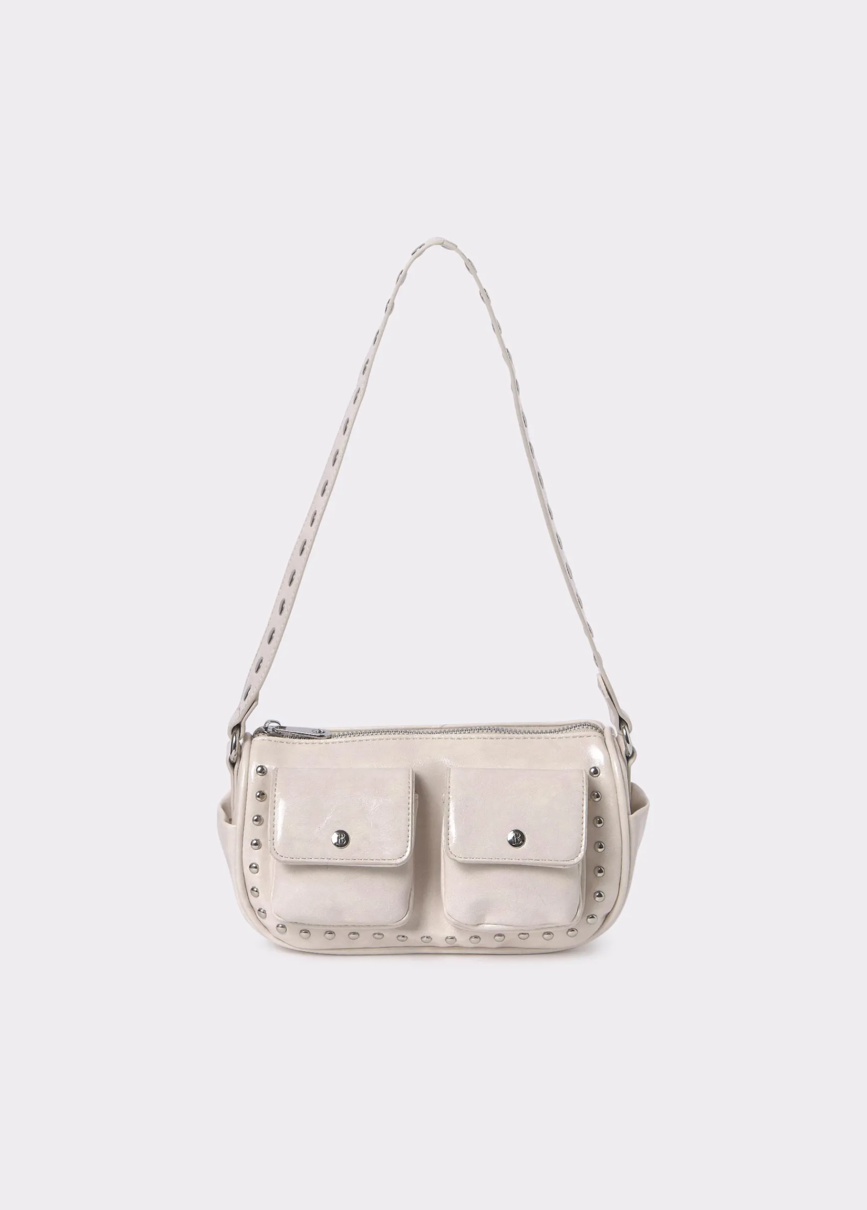 Bolso de hombro liso con asa ancha corta y bolsillos en el frontal con detalle de tachas. Cierre mediante cremallera.