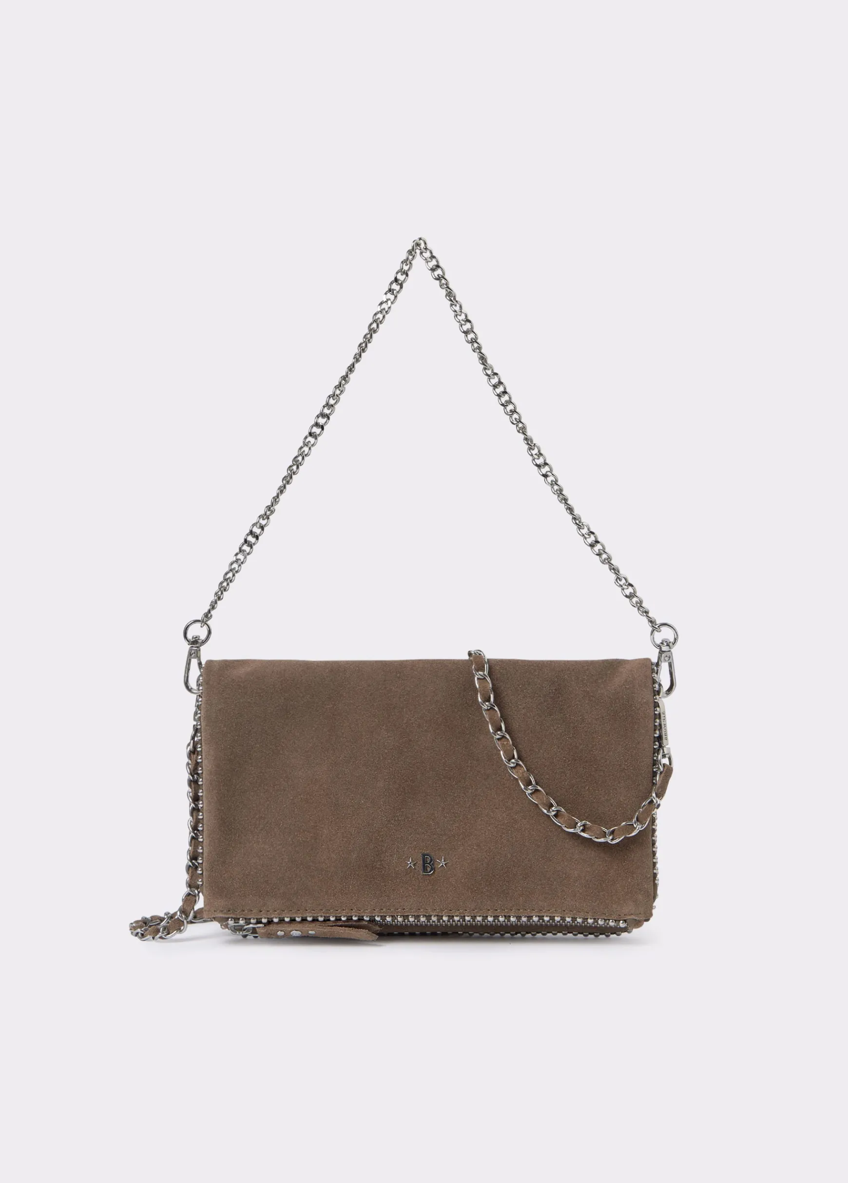 Bolso de hombro de piel de color taupe oscuro con sopala y detalle de bolitas en los laterales. Dispone de doble correa.