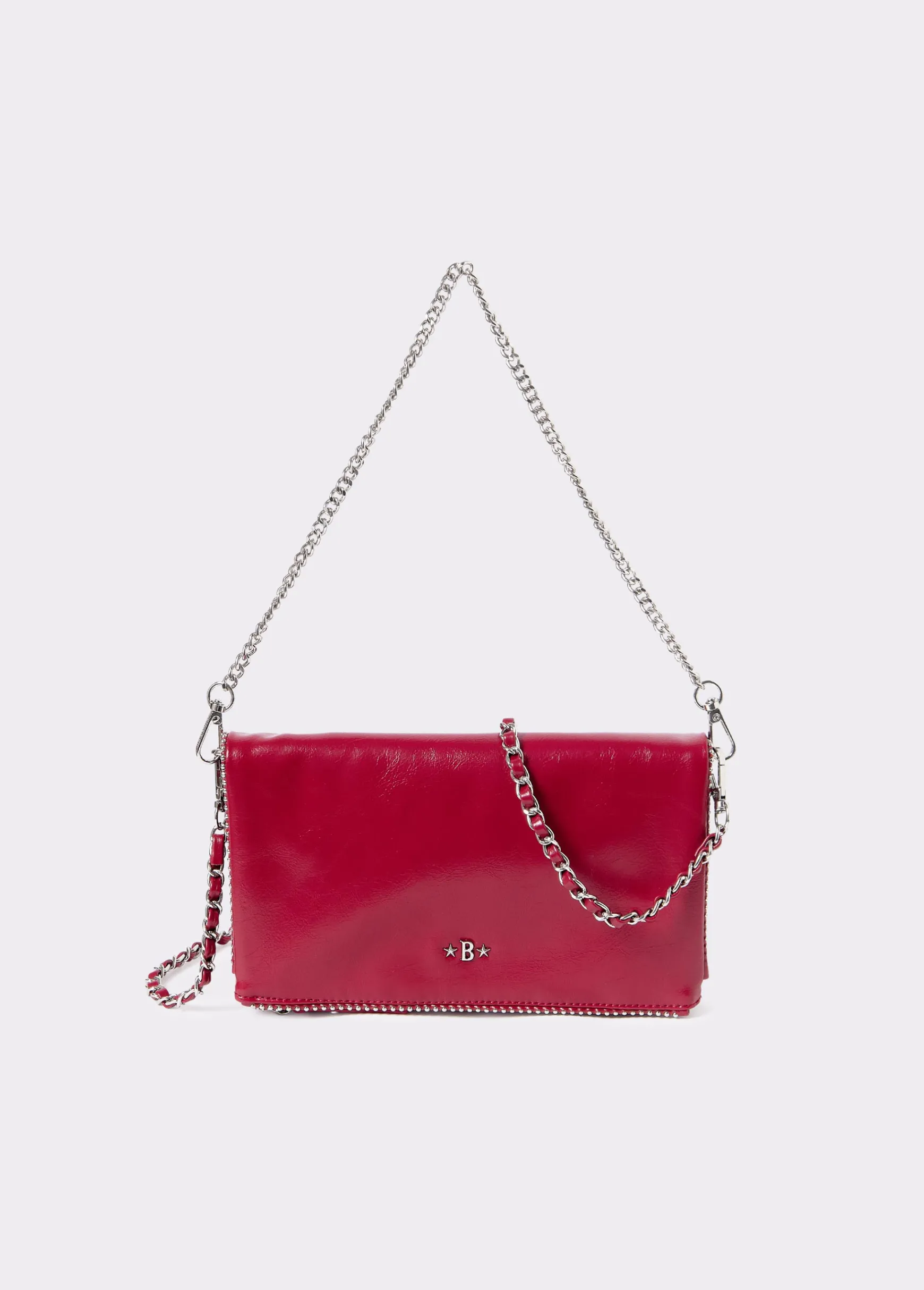 Bolso de hombro en color rojo con detalle de bolitas plateadas en la parte delantera. Dispone de doble correa, ambas extraíbles; una más corta para colgar del hombro y otra más larga para llevar de bandolera.