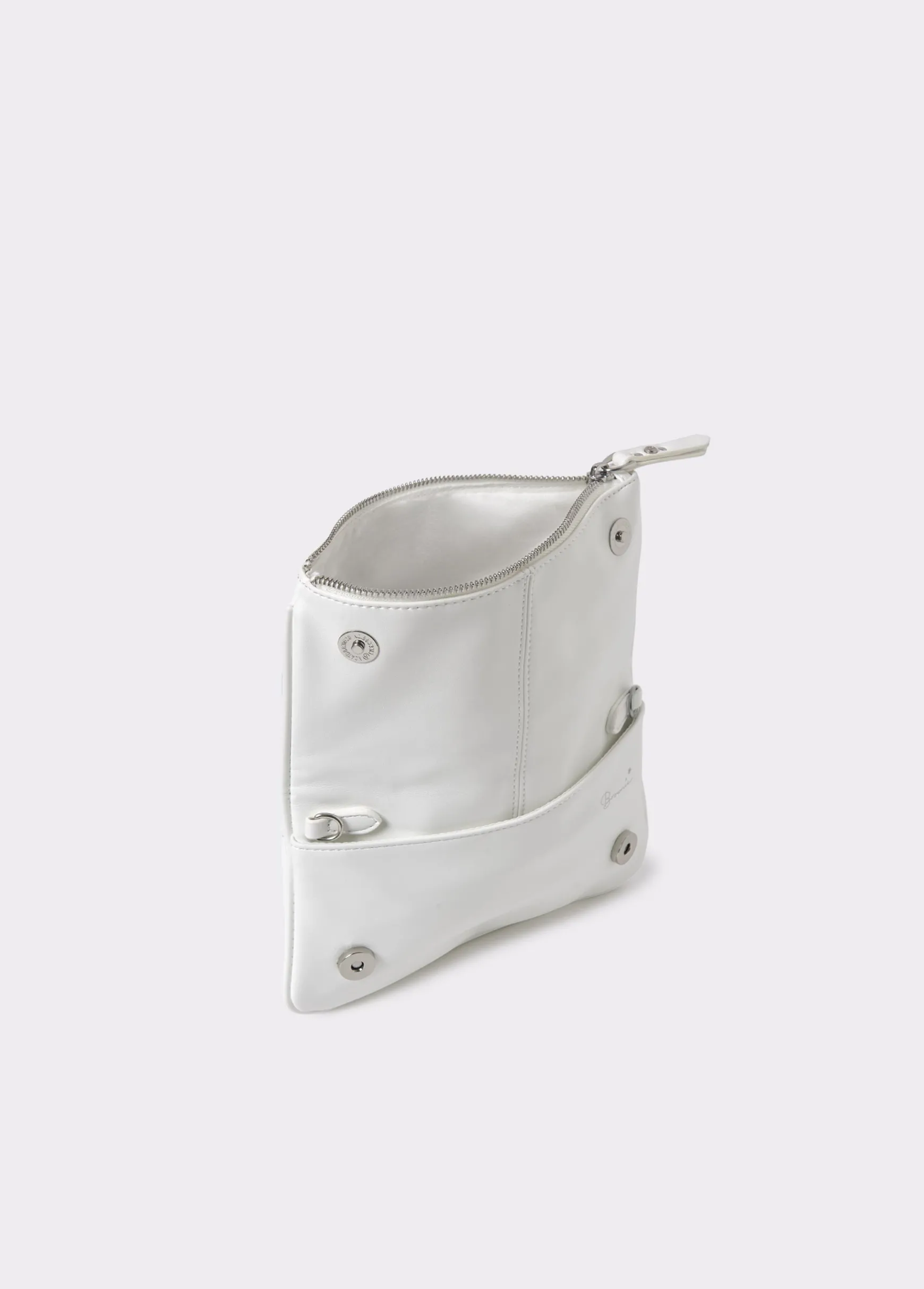 Bolso de hombro color blanco con solapa y cadena gruesa. Dispone de doble correa, ambas extraíbles; una más corta para colgar del hombro y otra más larga para llevar de bandolera.