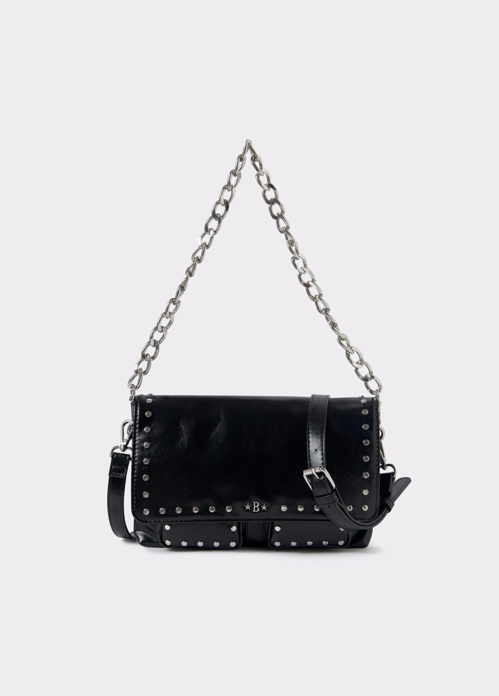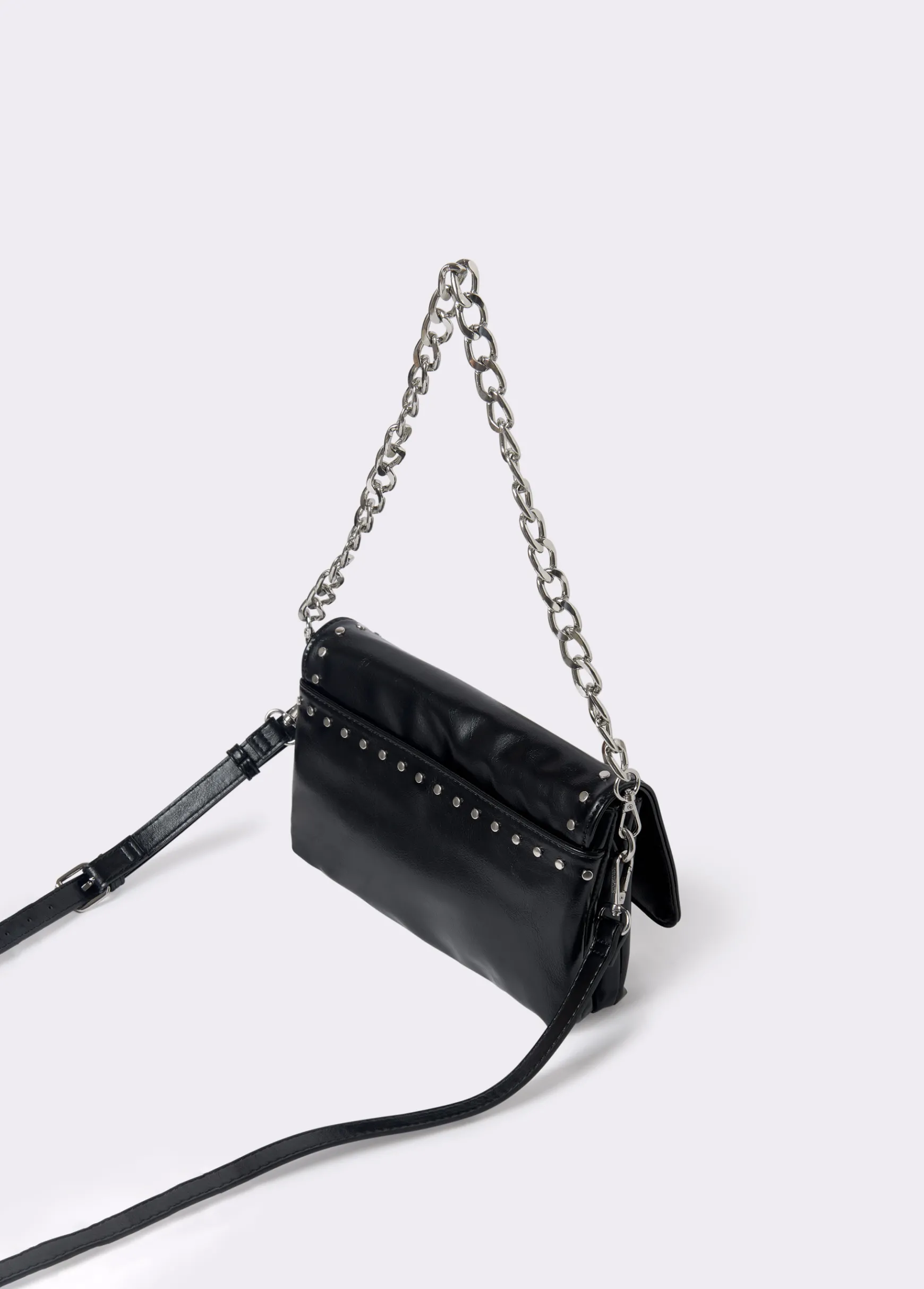 Bolso de hombro en color negro con solapa, bolsillos y detalle de tachas en la parte delantera. Dispone de doble correa, ambas extraíbles; una más corta para colgar del hombro y otra más larga para llevar de bandolera.