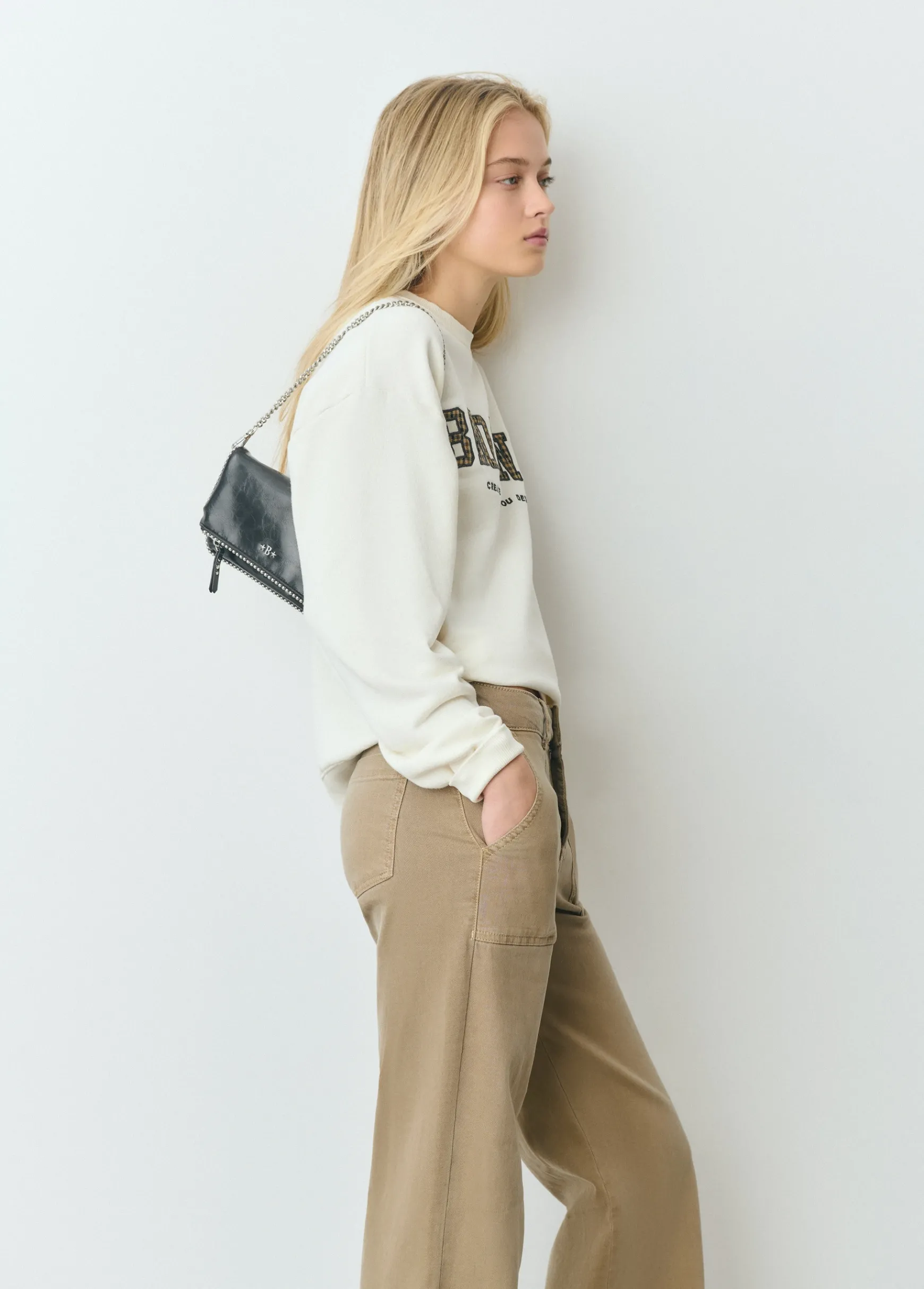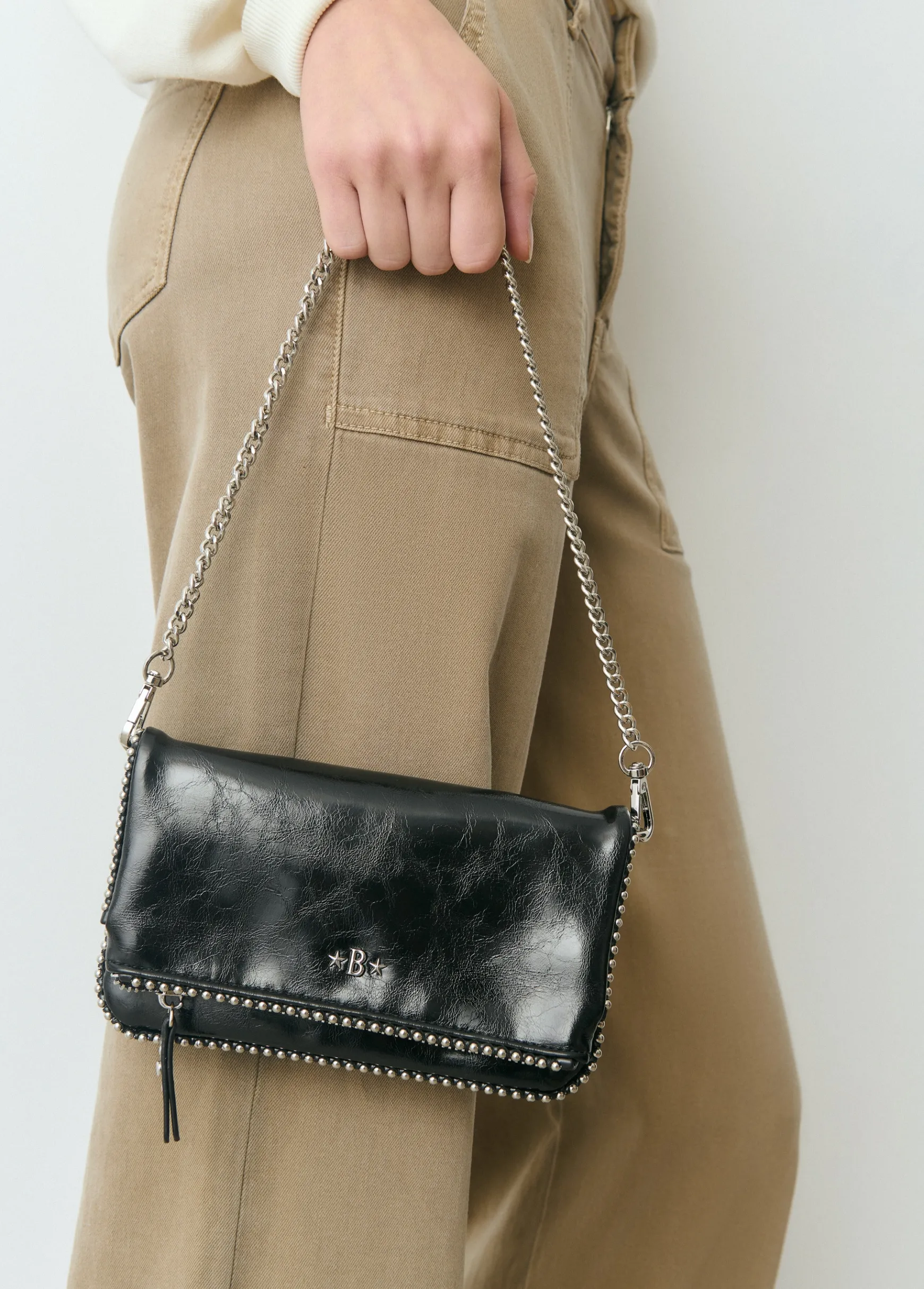 Bolso de hombro en color negro con detalle de bolitas plateadas en la parte delantera. Dispone de doble correa, ambas extraíbles; una más corta para colgar del hombro y otra más larga para llevar de bandolera.