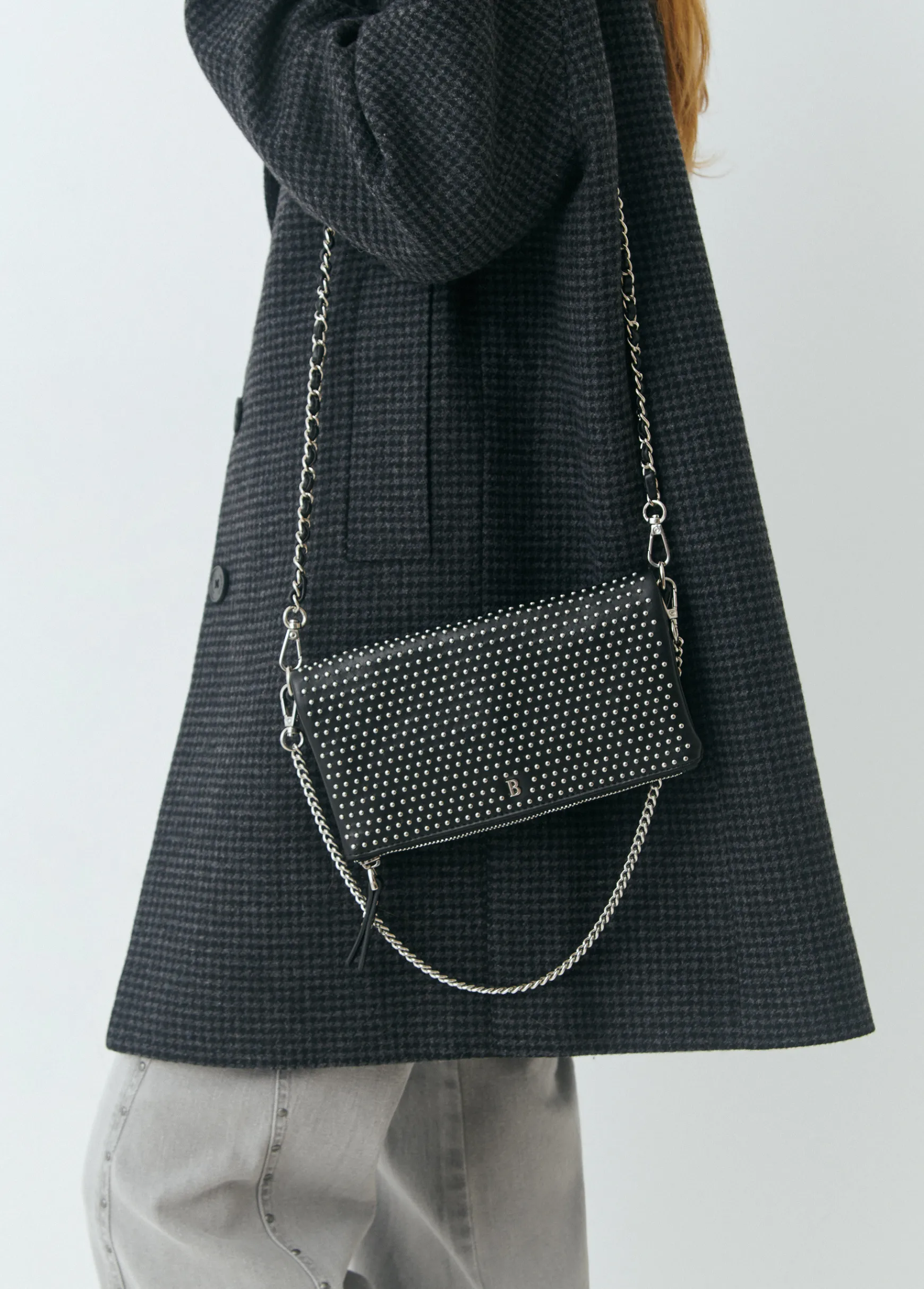 Bolso de hombro en color negro con detalle de tachitas en la parte delantera. Dispone de doble correa, ambas extraíbles; una más corta para colgar del hombro y otra más larga para llevar de bandolera.