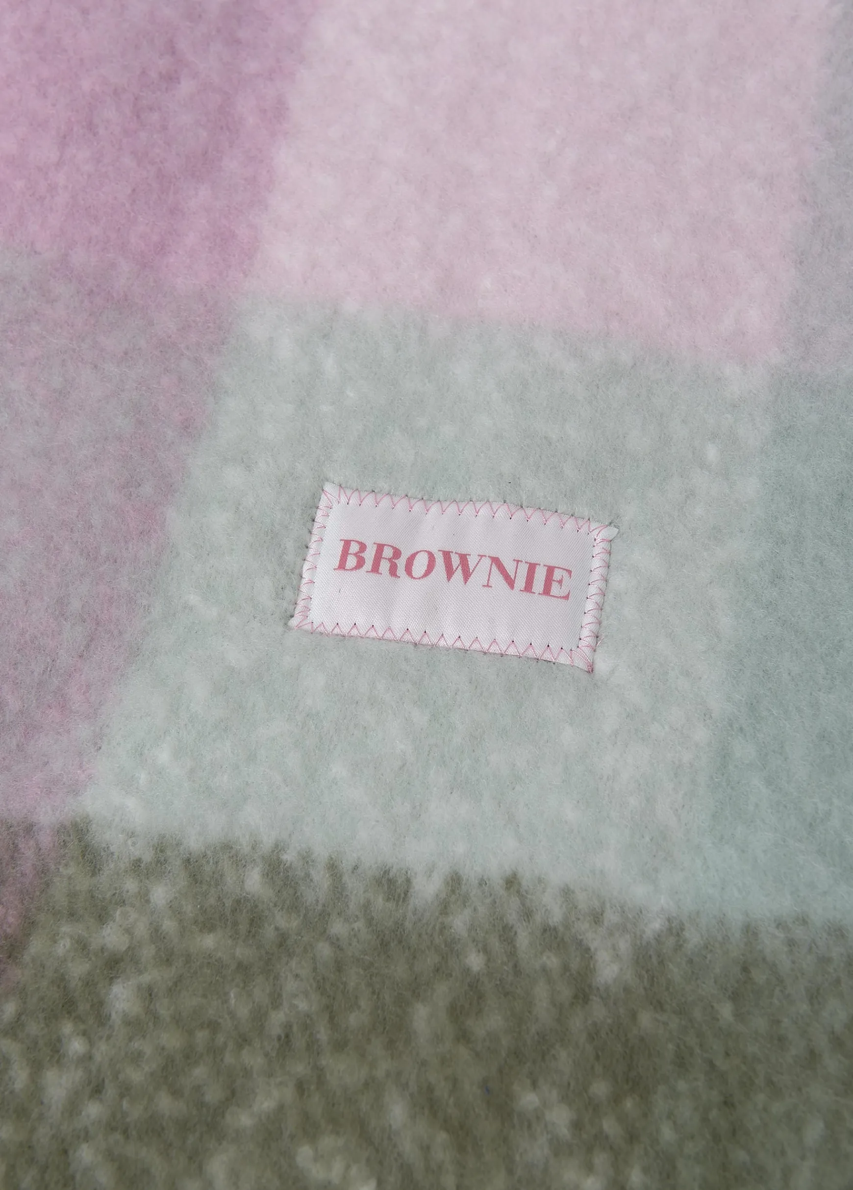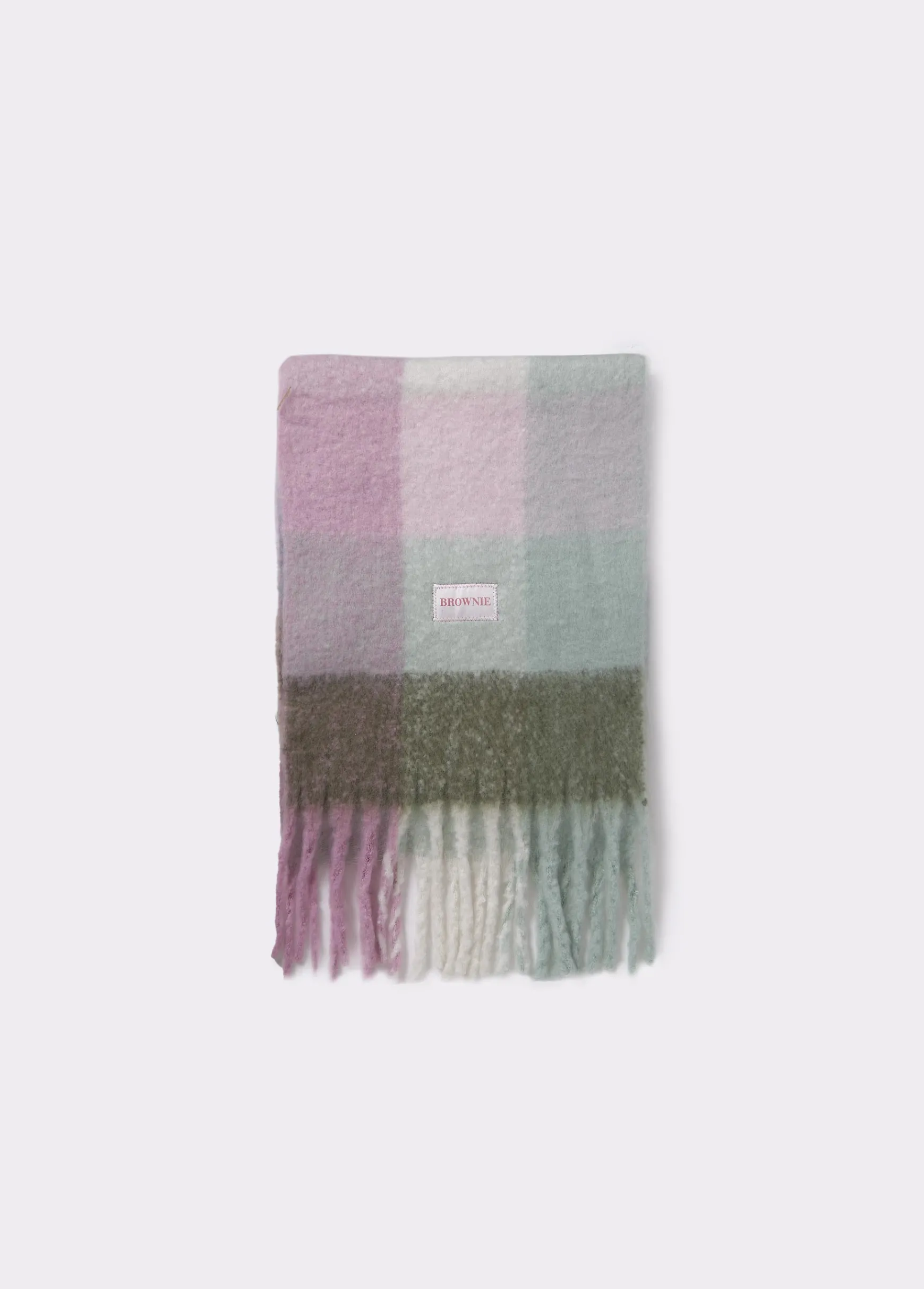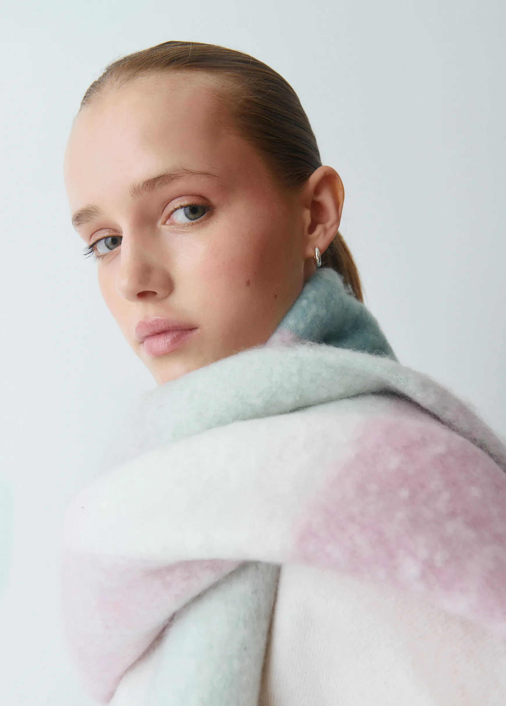Bufanda gruesa de cuadros con flecos en color rosa.