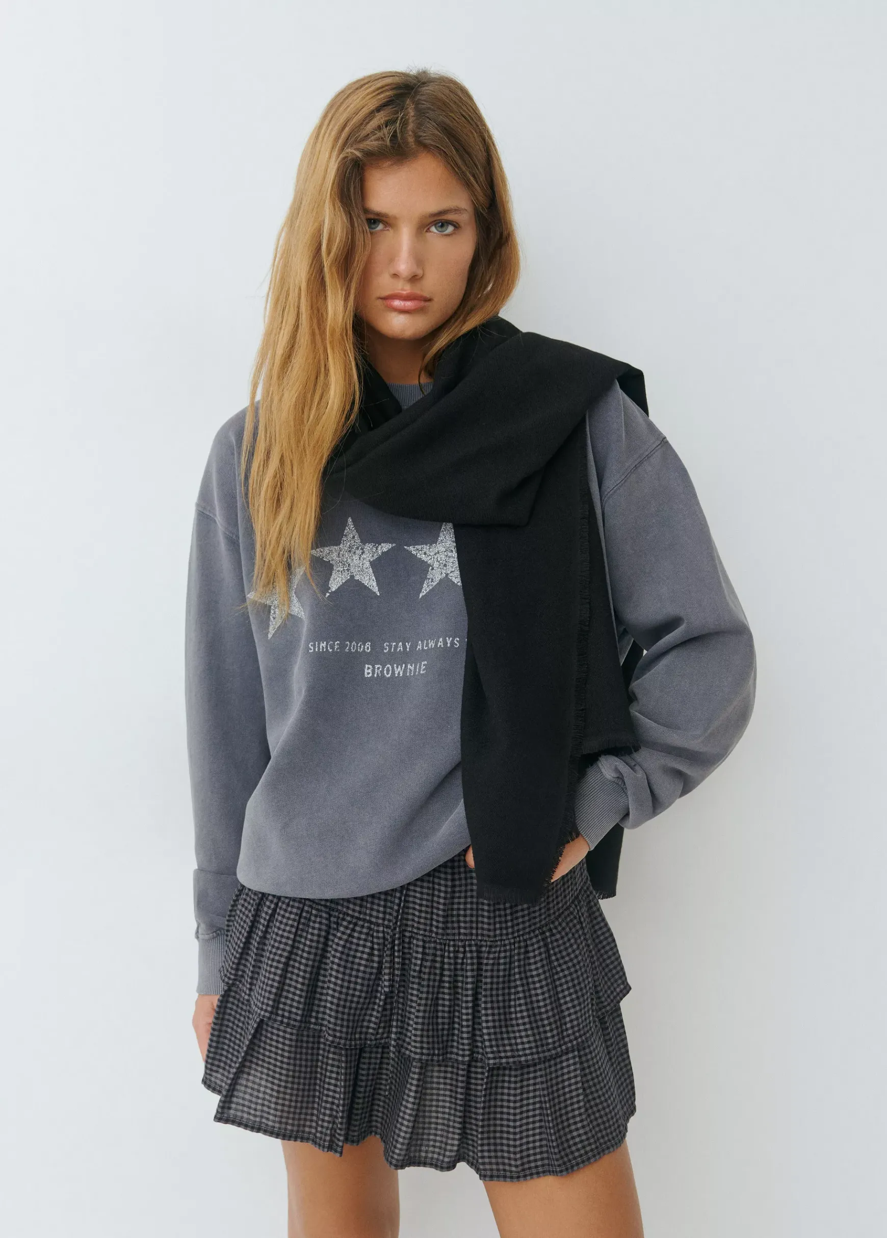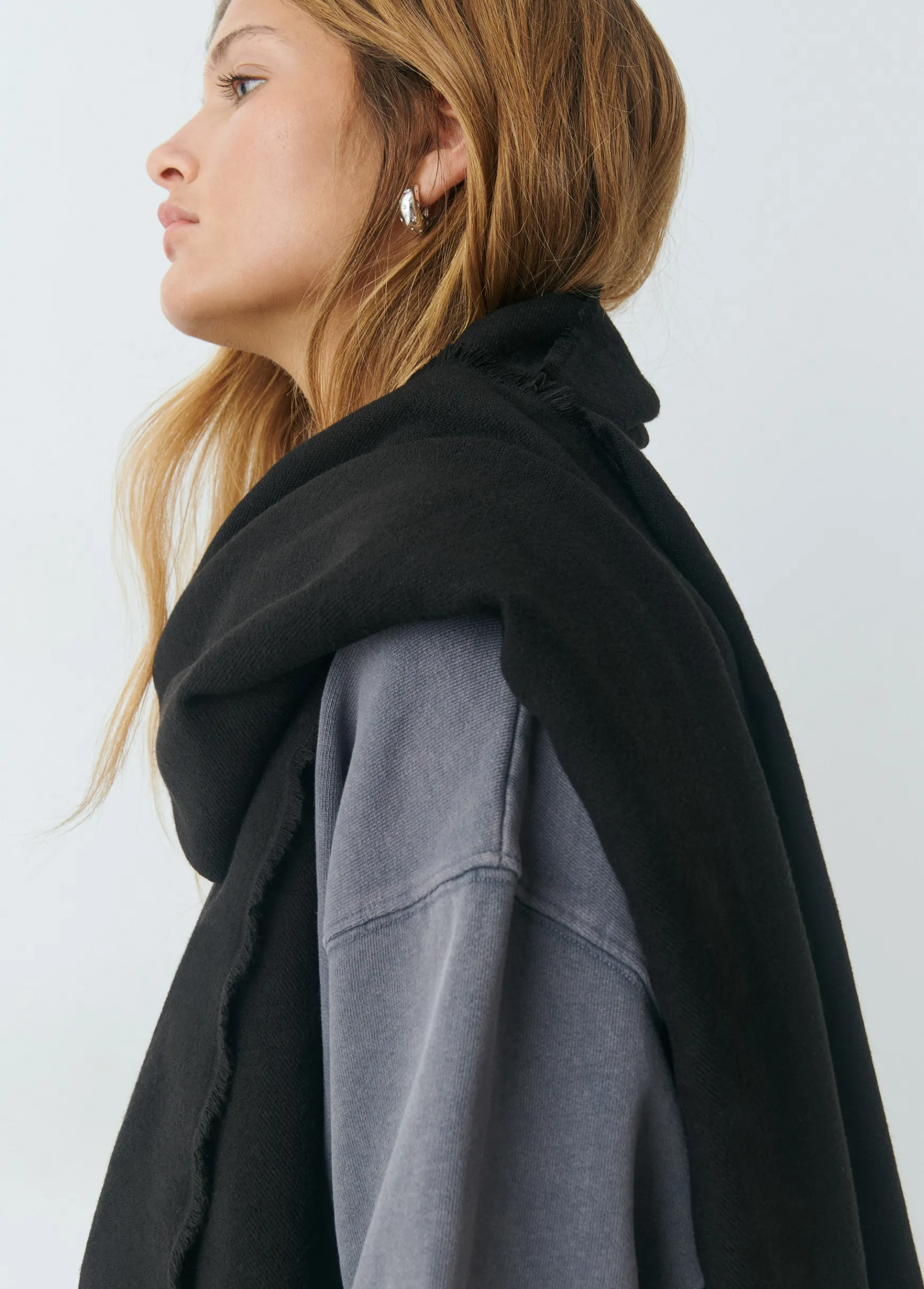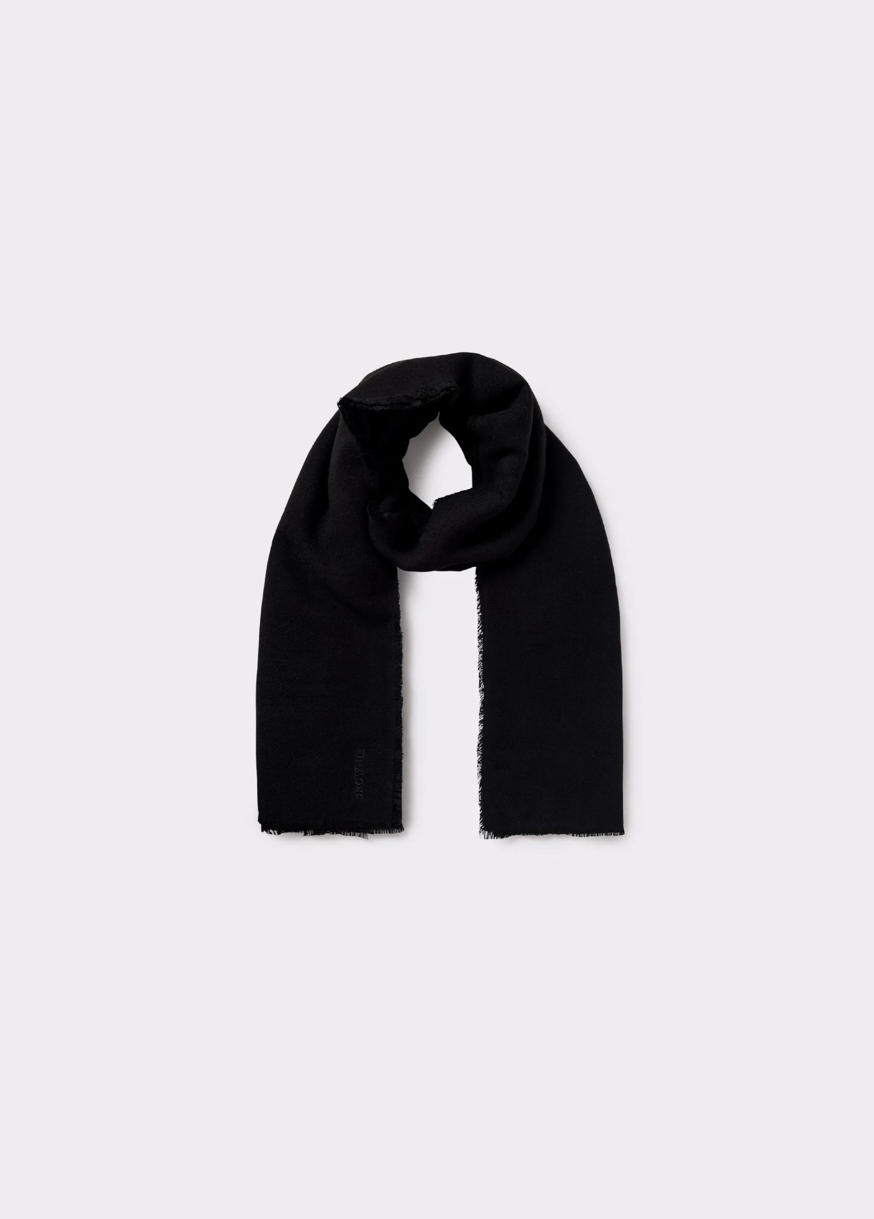 Bufanda fina lisa con tacto suave y acabado en flecos.