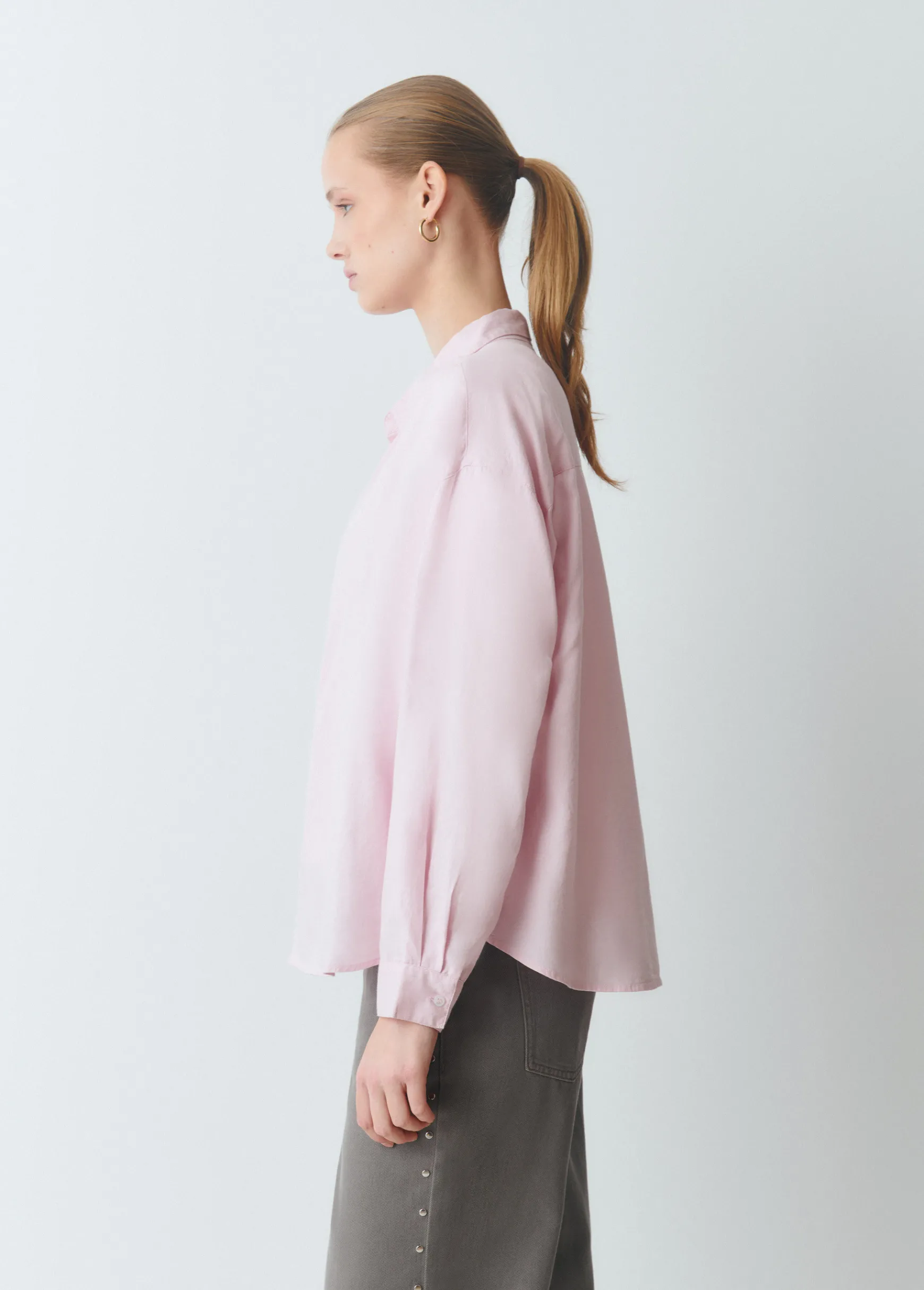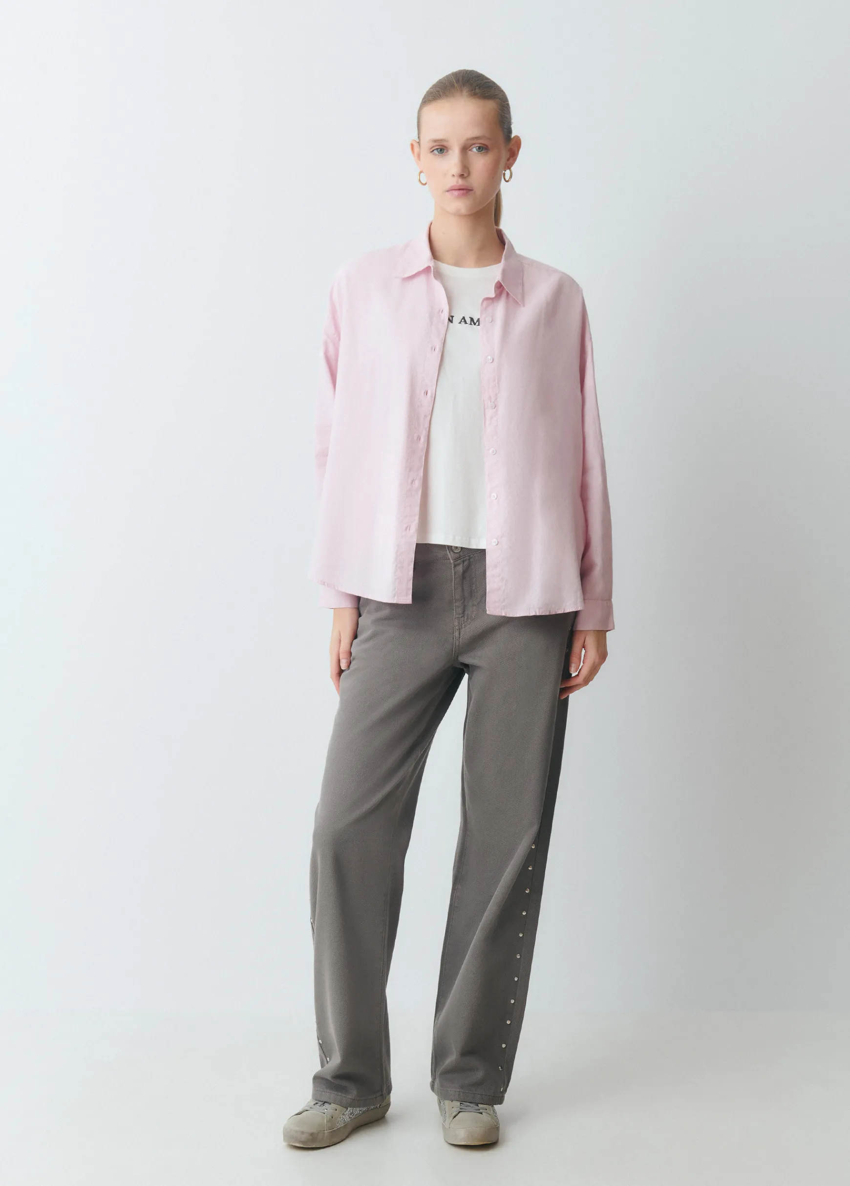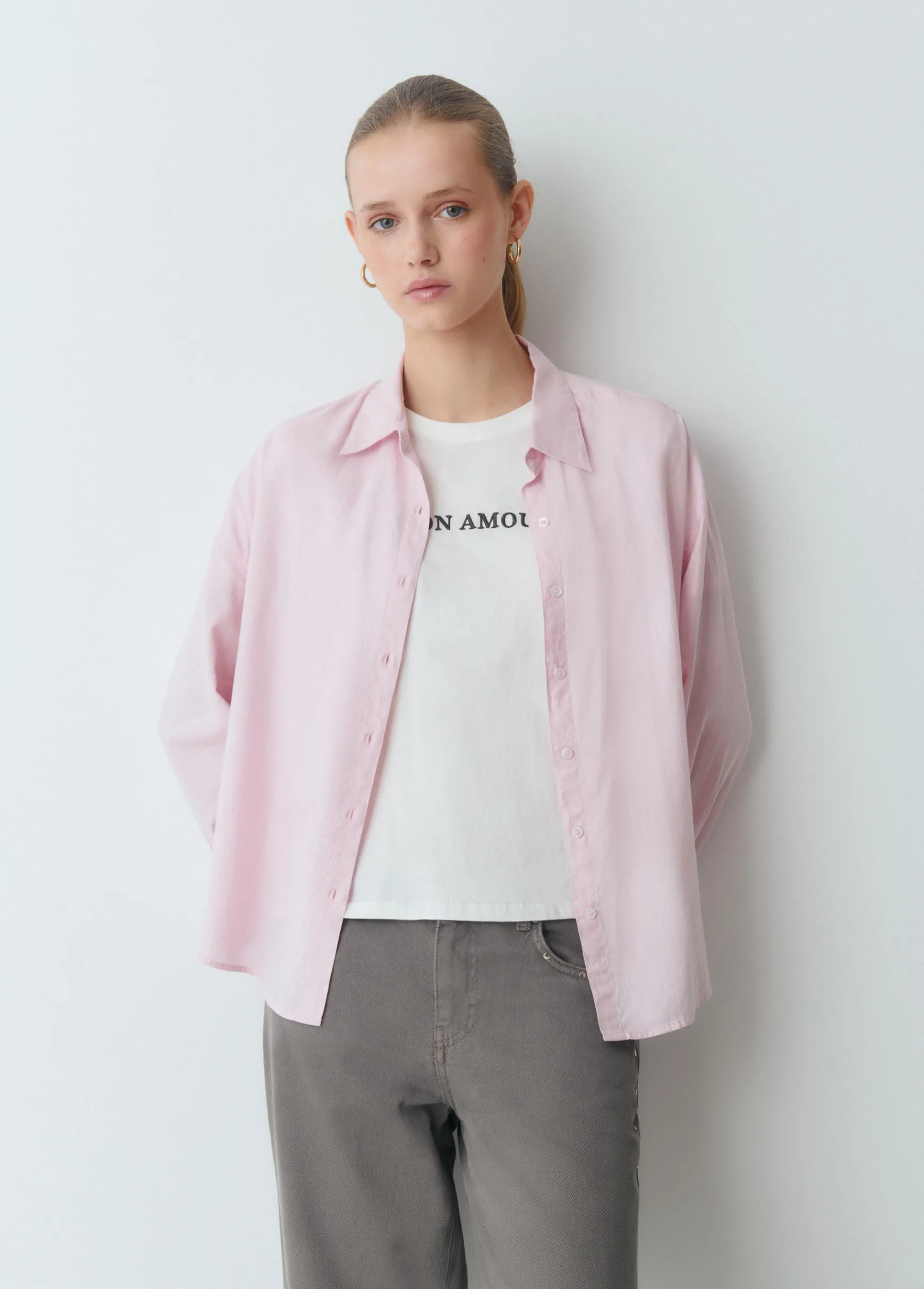Camisa básica lisa de manga larga, cuello con solapas y cierre mediante botones en el frontal.