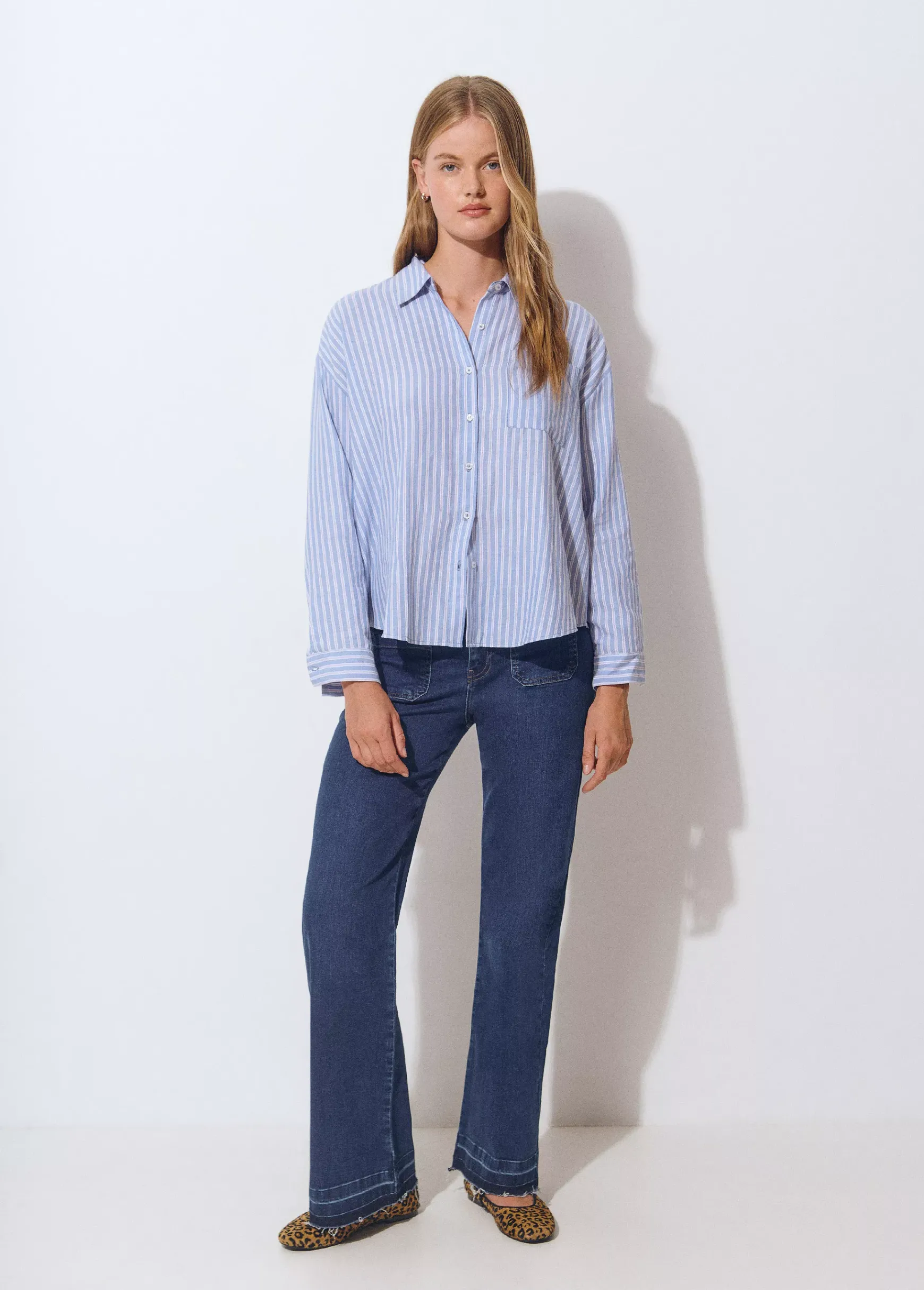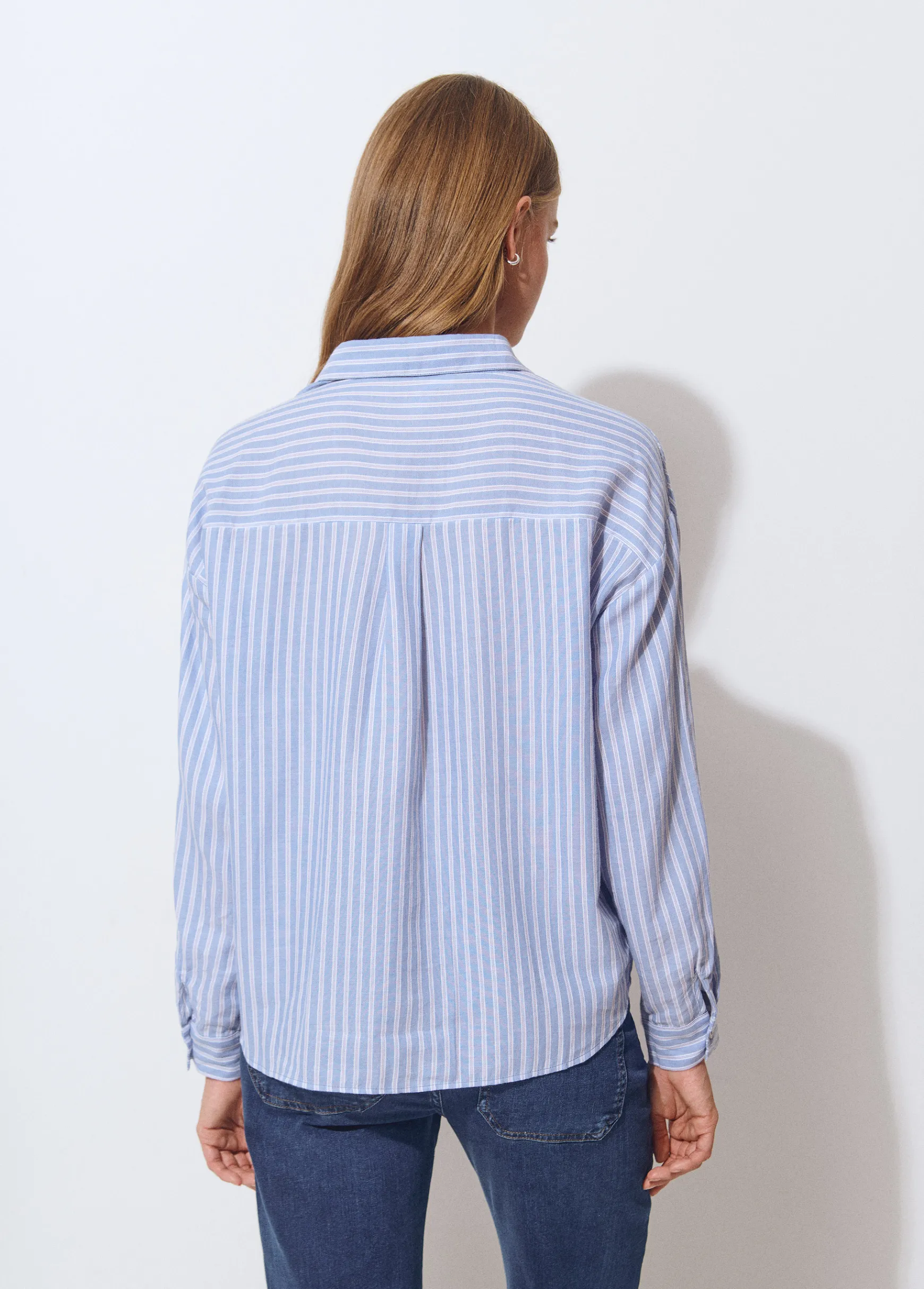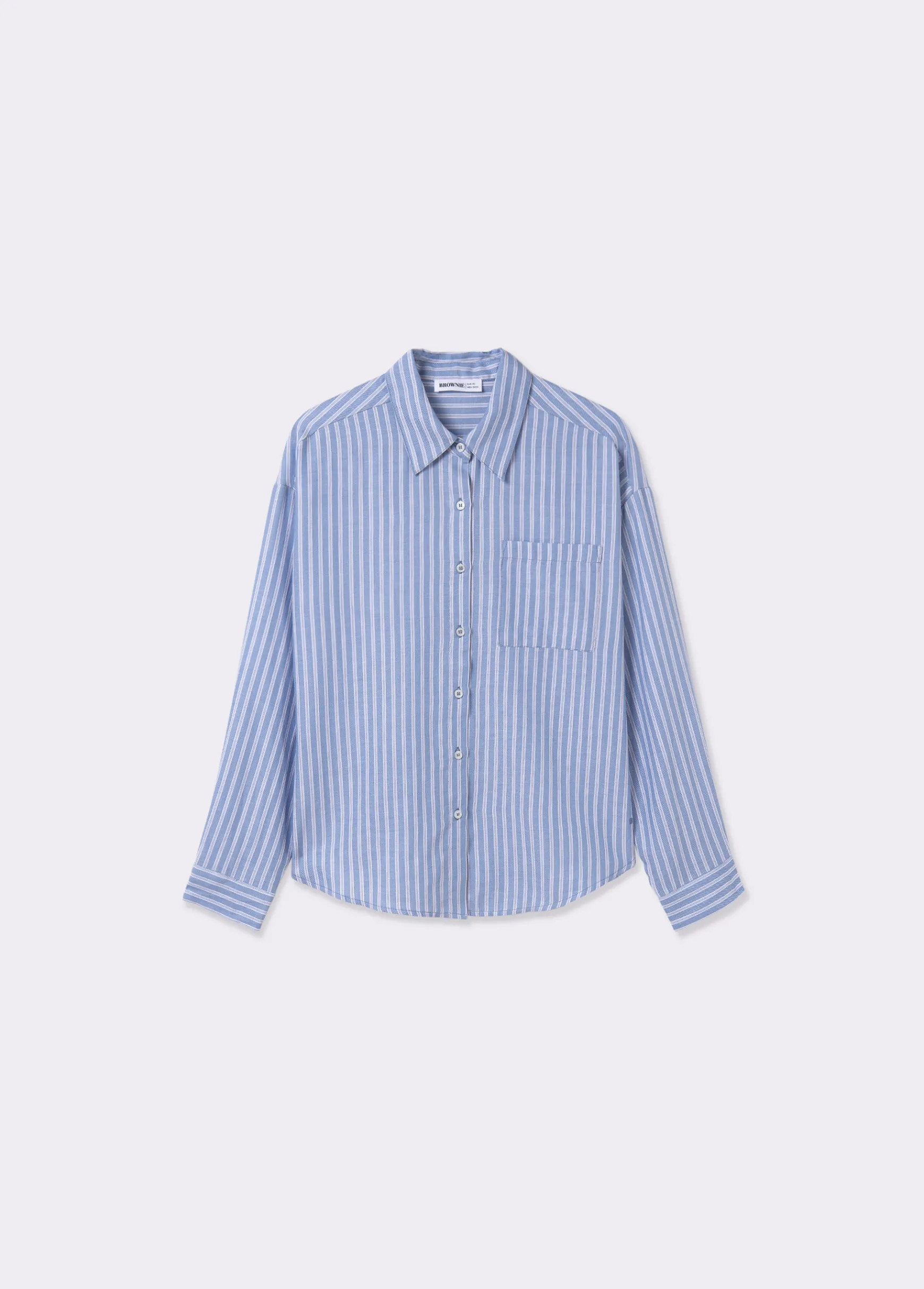 Camisa de rayas de manga larga, cuello con solapas y cierre con botones en el frontal.