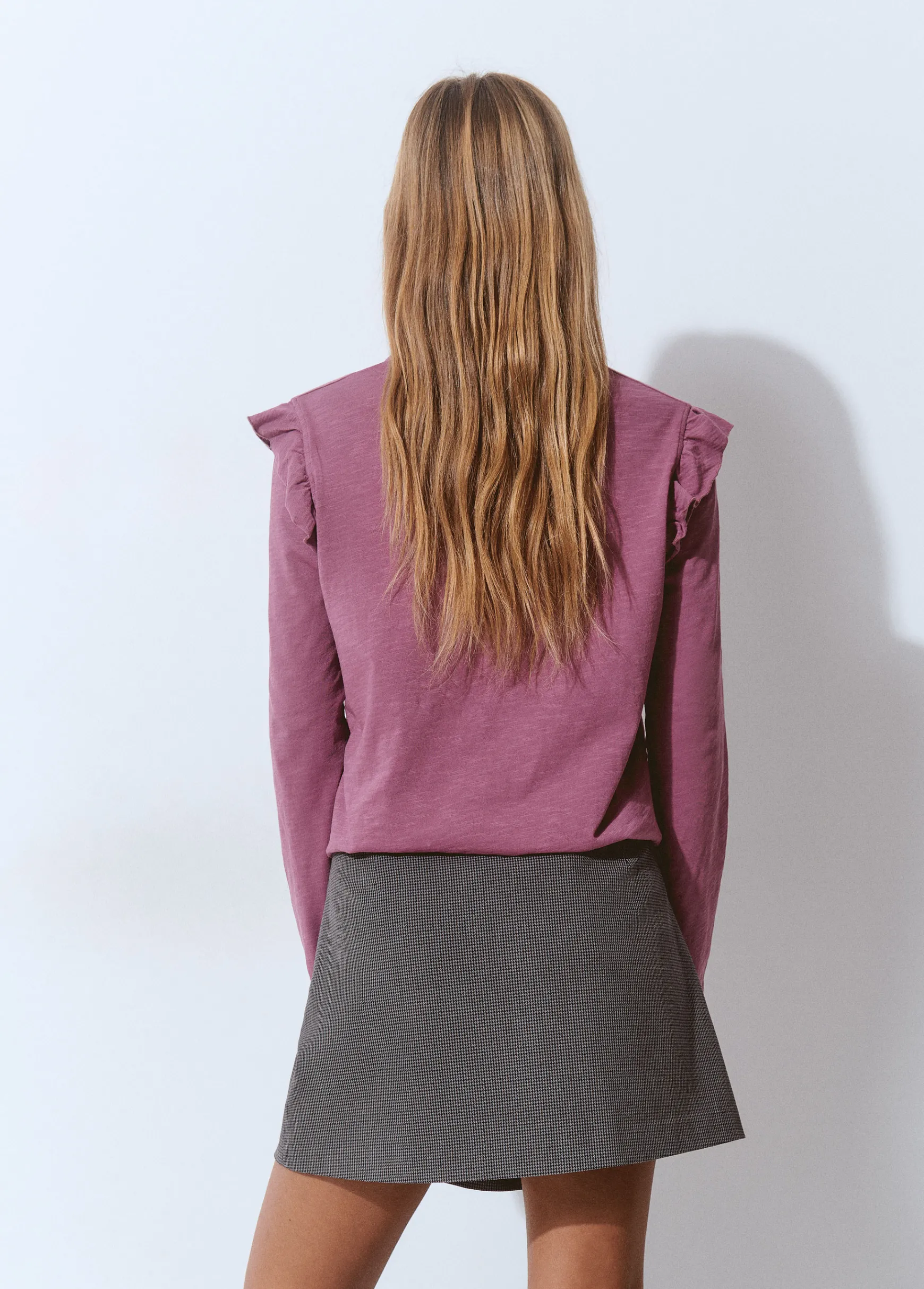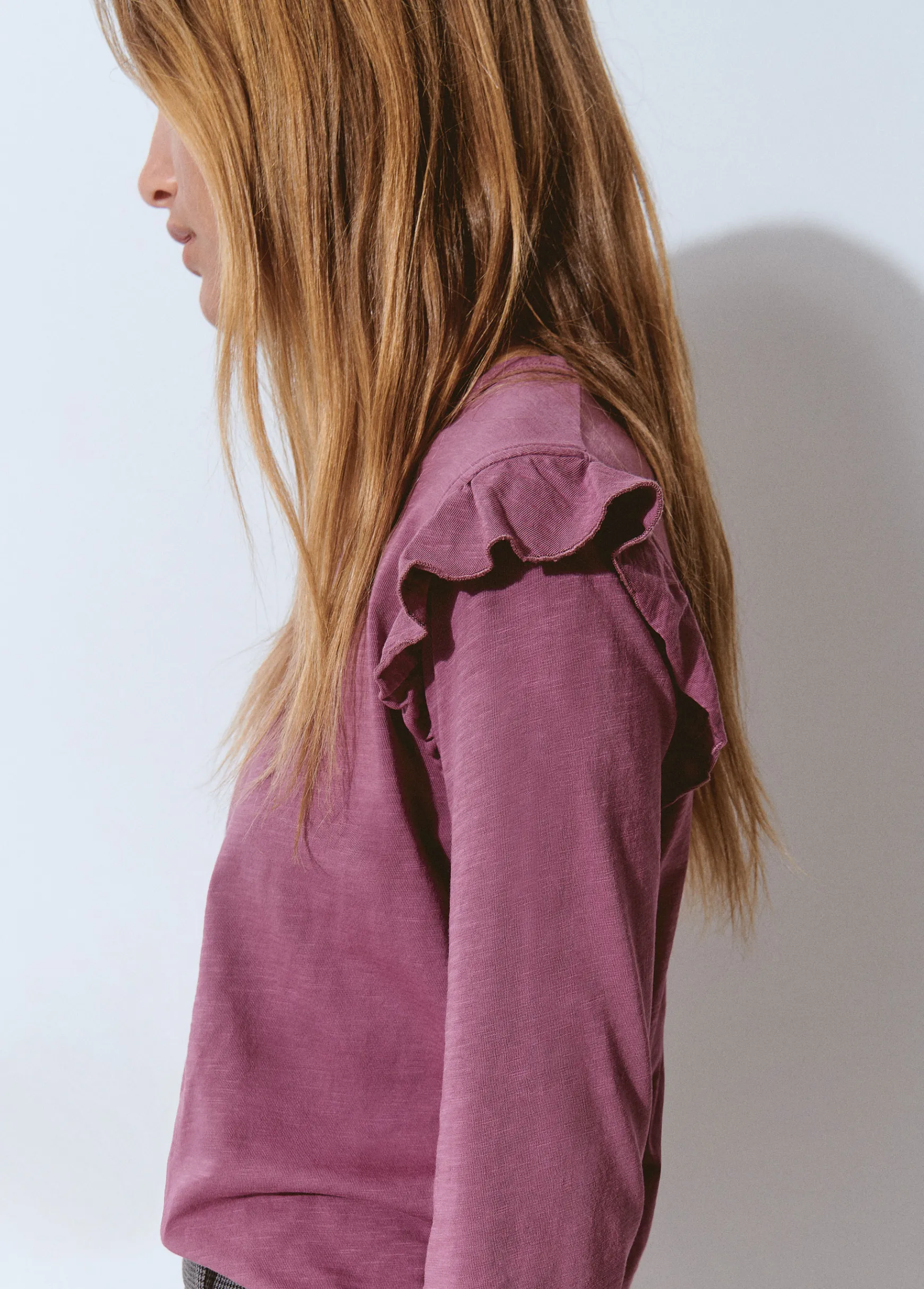 Camiseta de manga larga, cuello redondo y detalle de volantes.