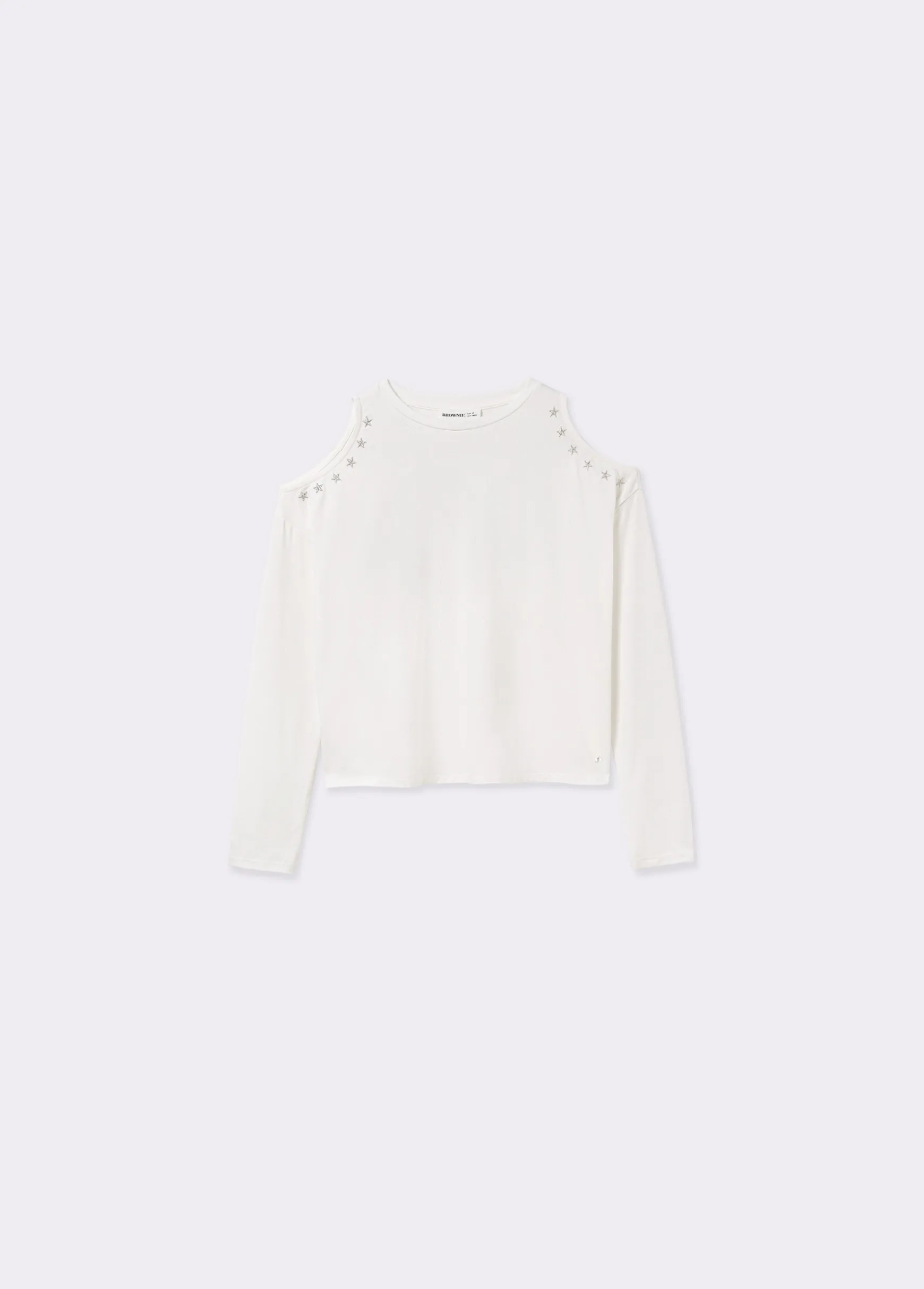 Camiseta de manga larga, cuello redondo, hombros descubiertos y detalle de estrellas bordadas.