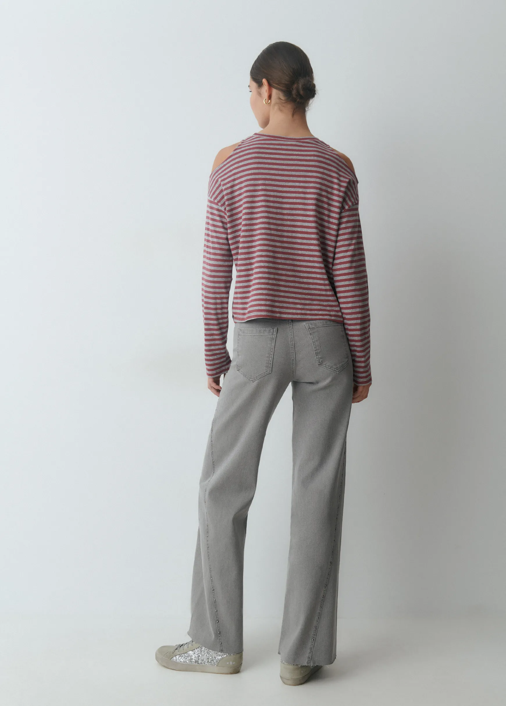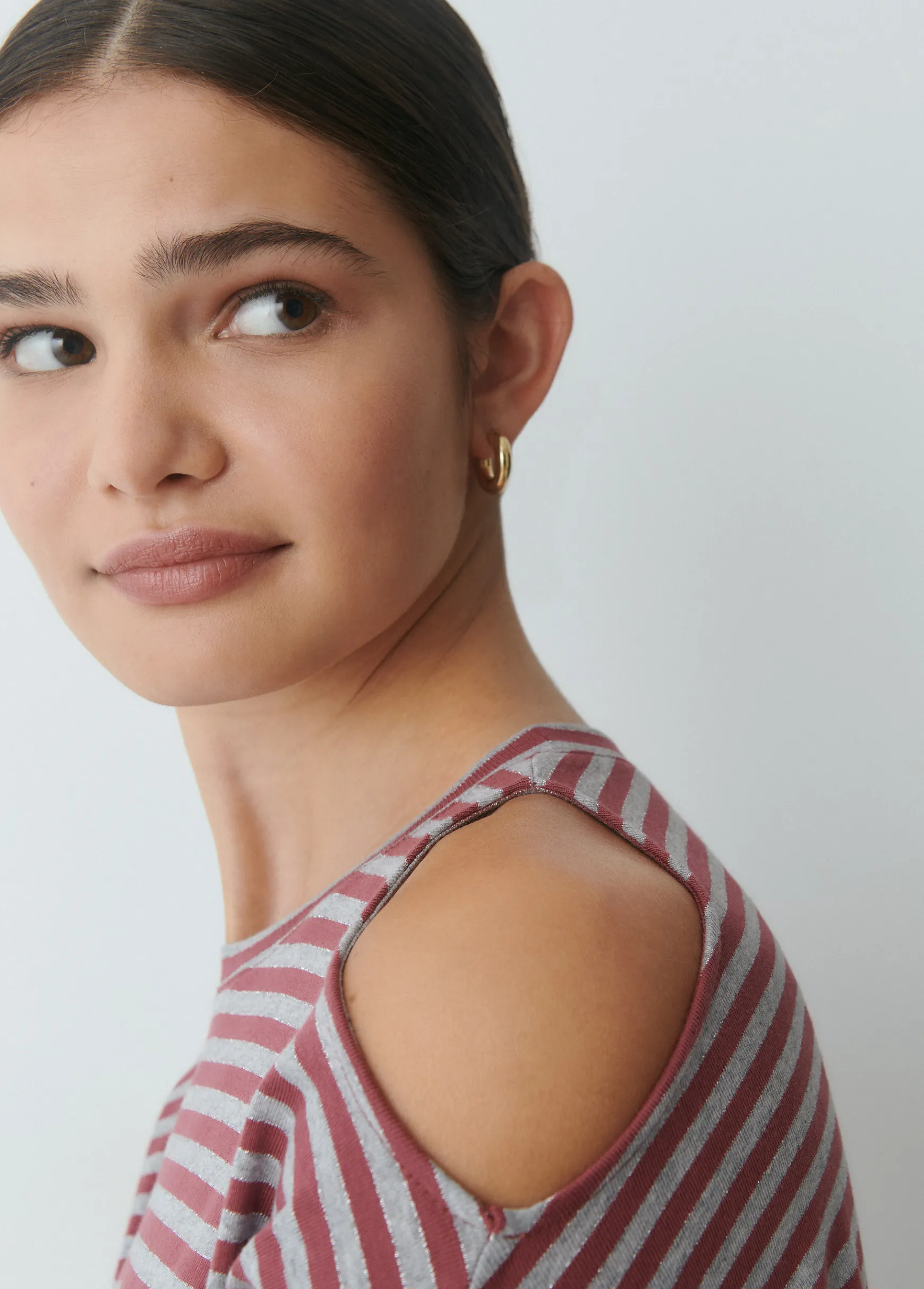 Camiseta de rayas de manga larga, cuello redondo y hombros descubiertos con detalle de lurex.