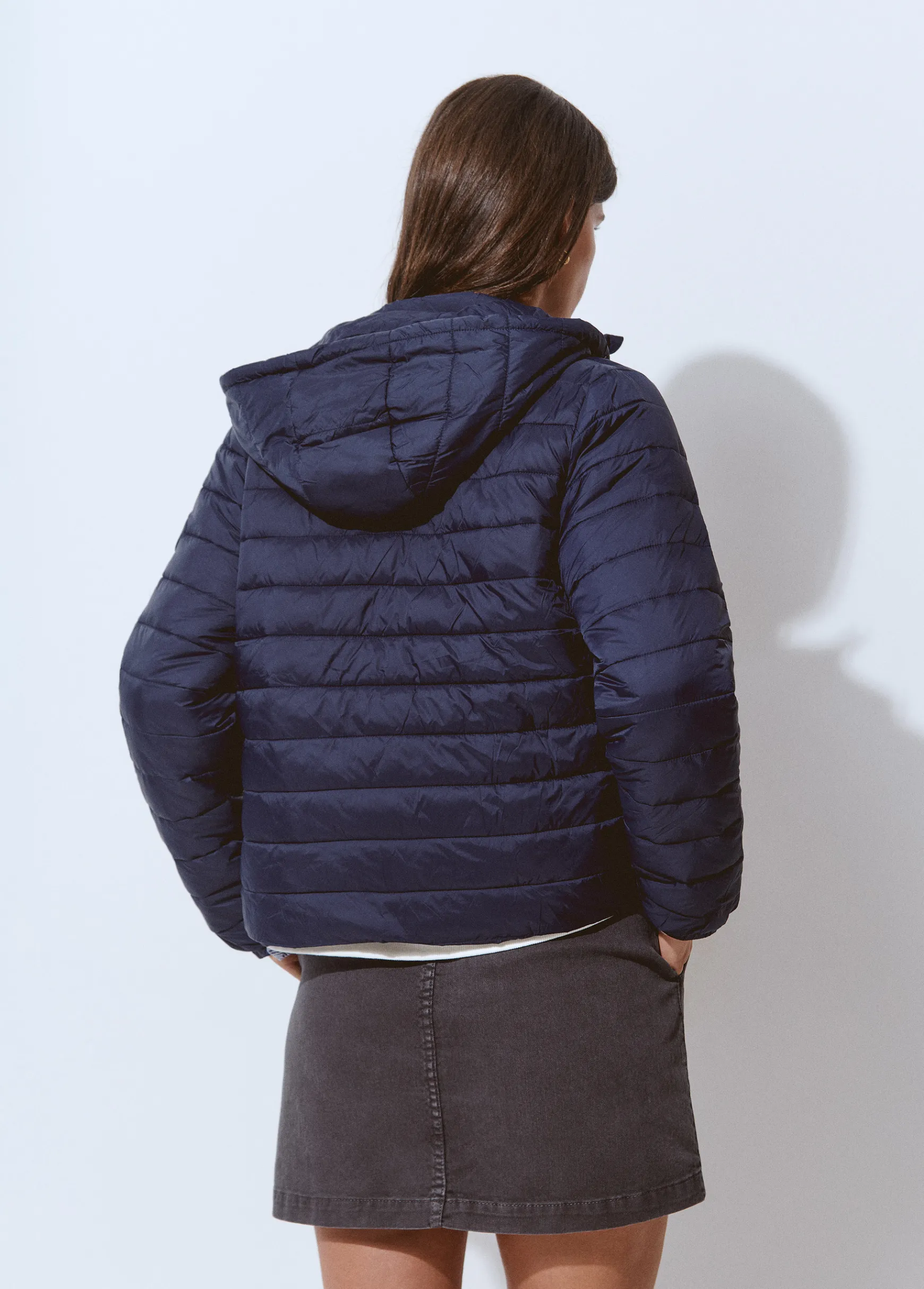 Chaqueta corta de manga larga con dos bolsillos laterales, capucha y cierre mediante cremallera.