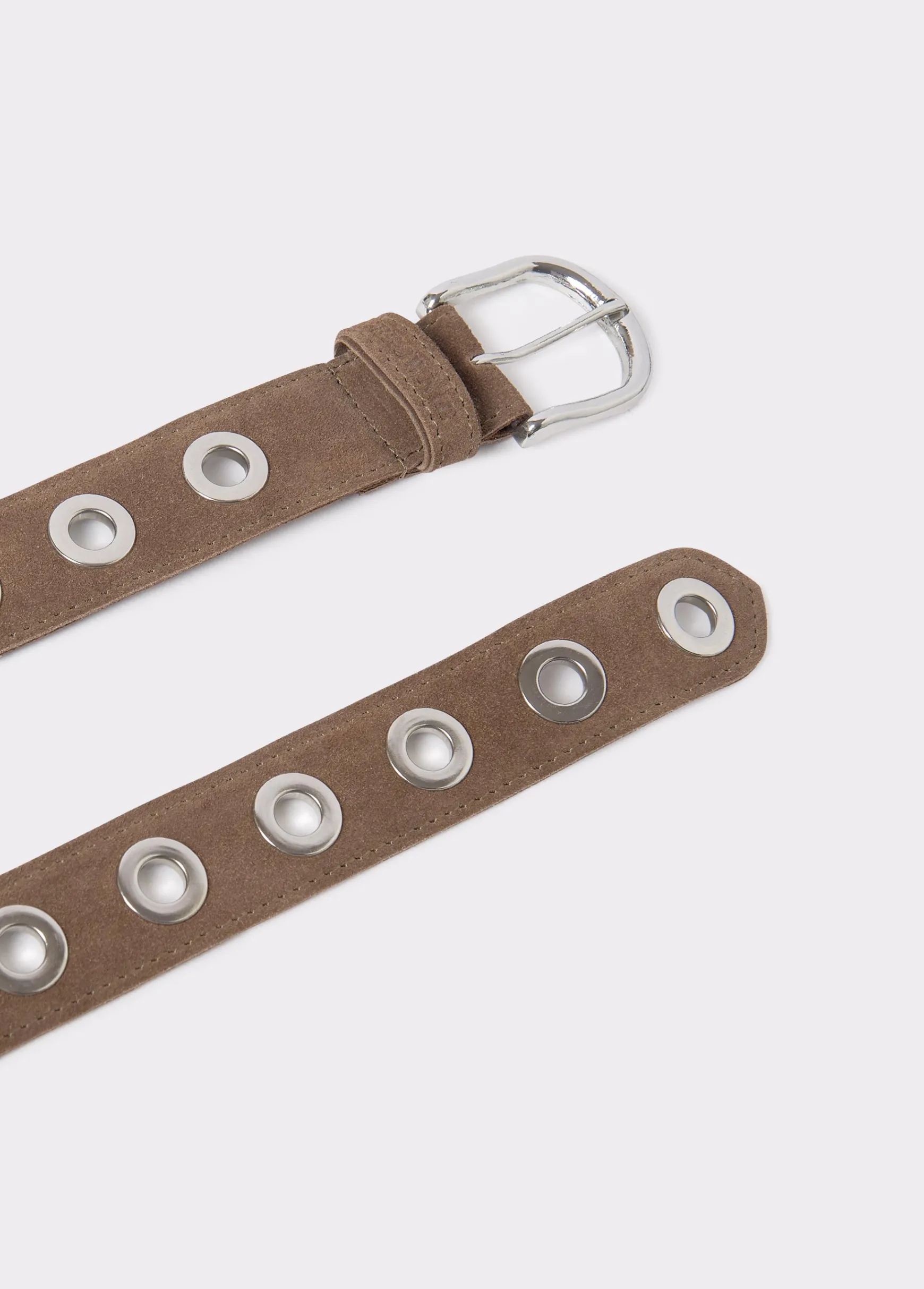 Cinturón de piel color marrón con hebilla en color plata y detalle de ojales.