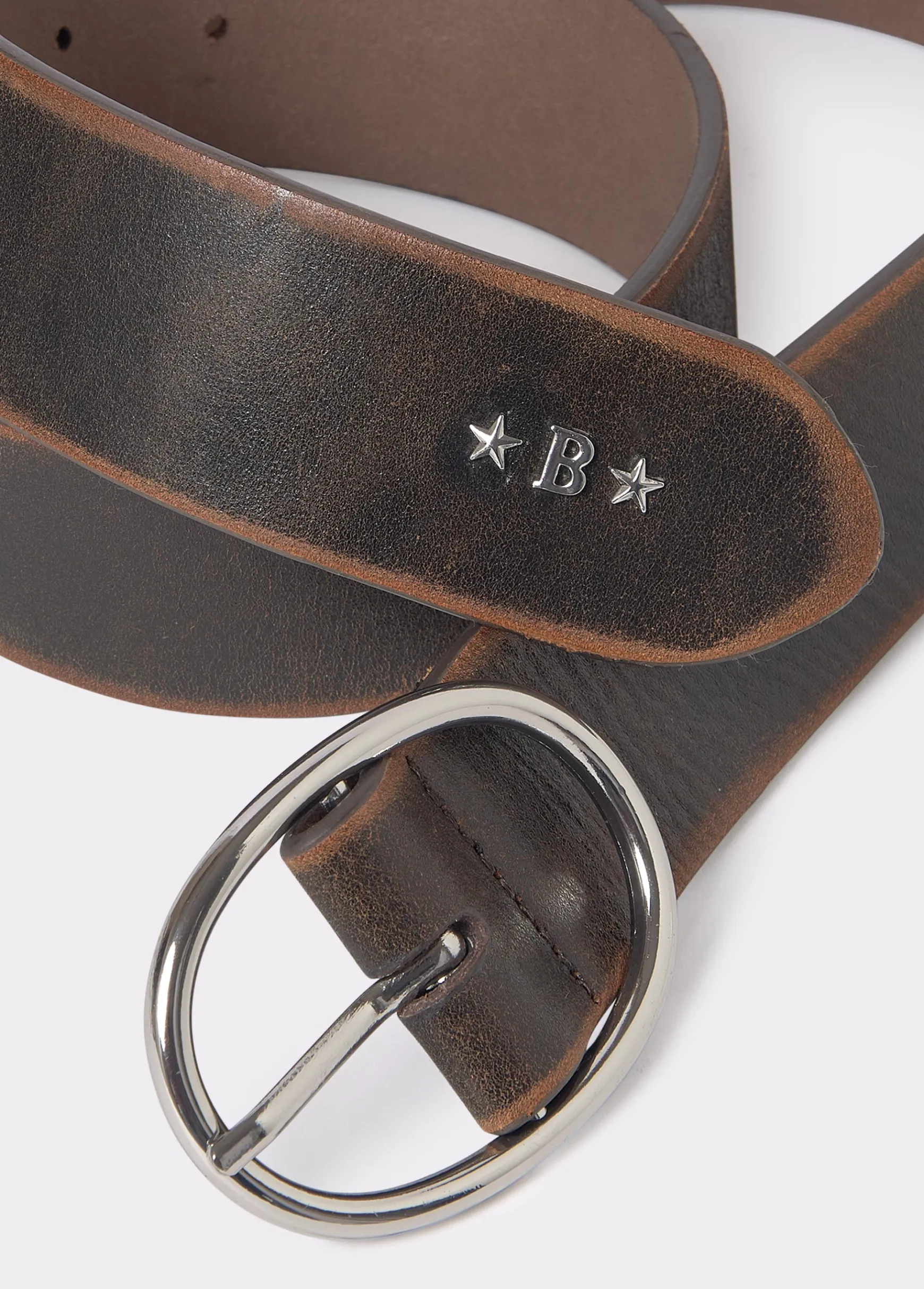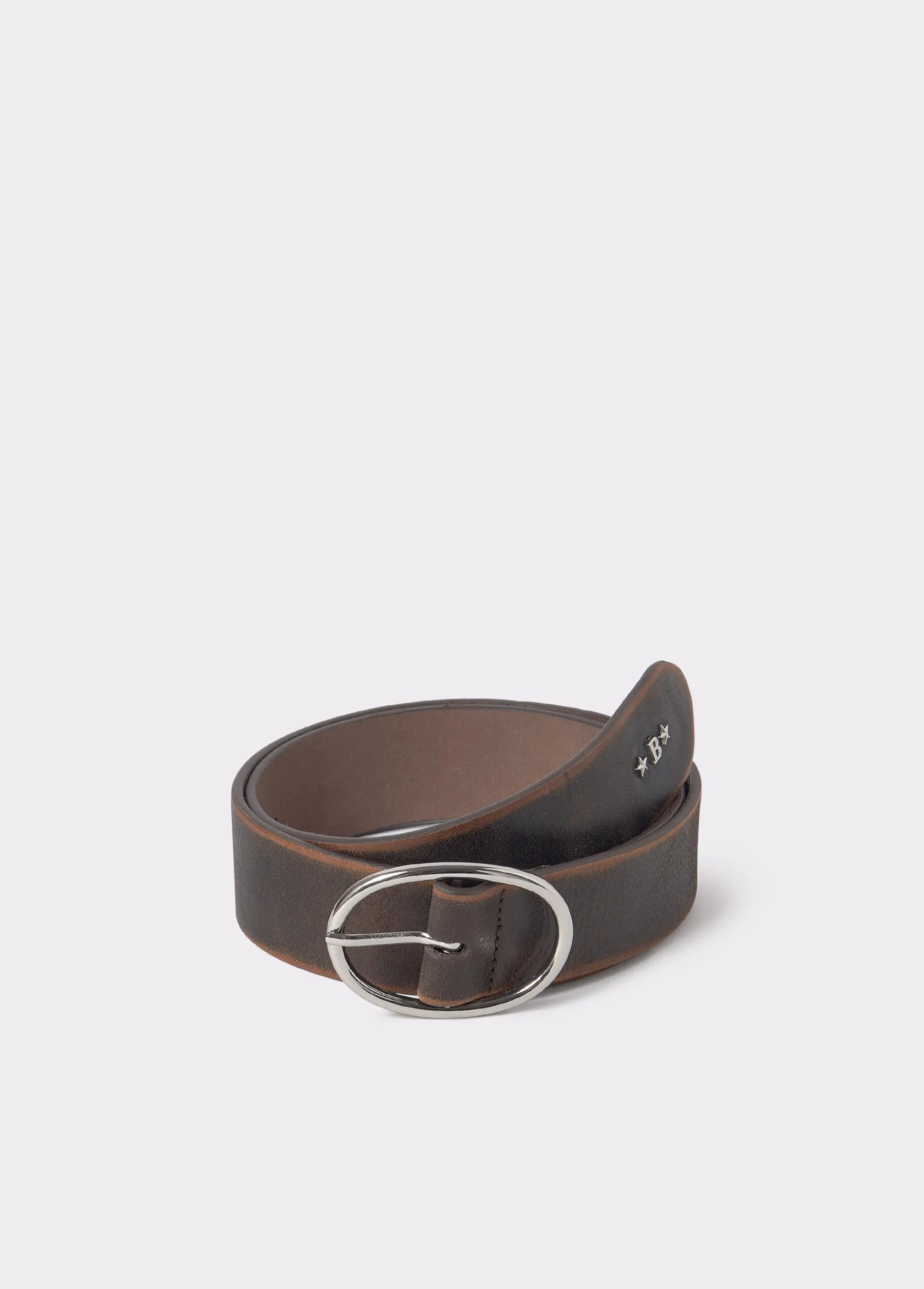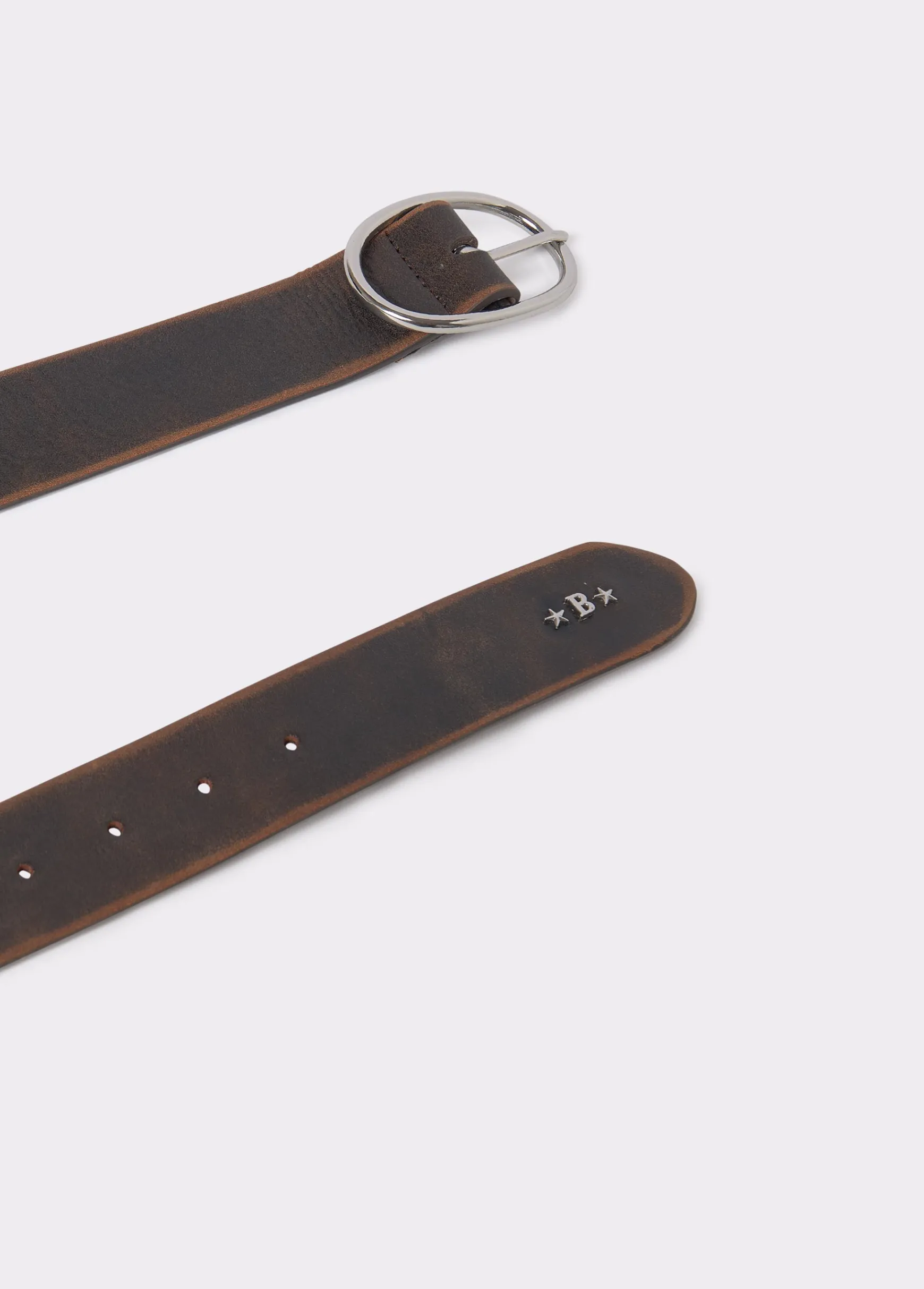 Cinturón de piel color marrón liso con hebilla en plateado. Disponible en 3 tallas.