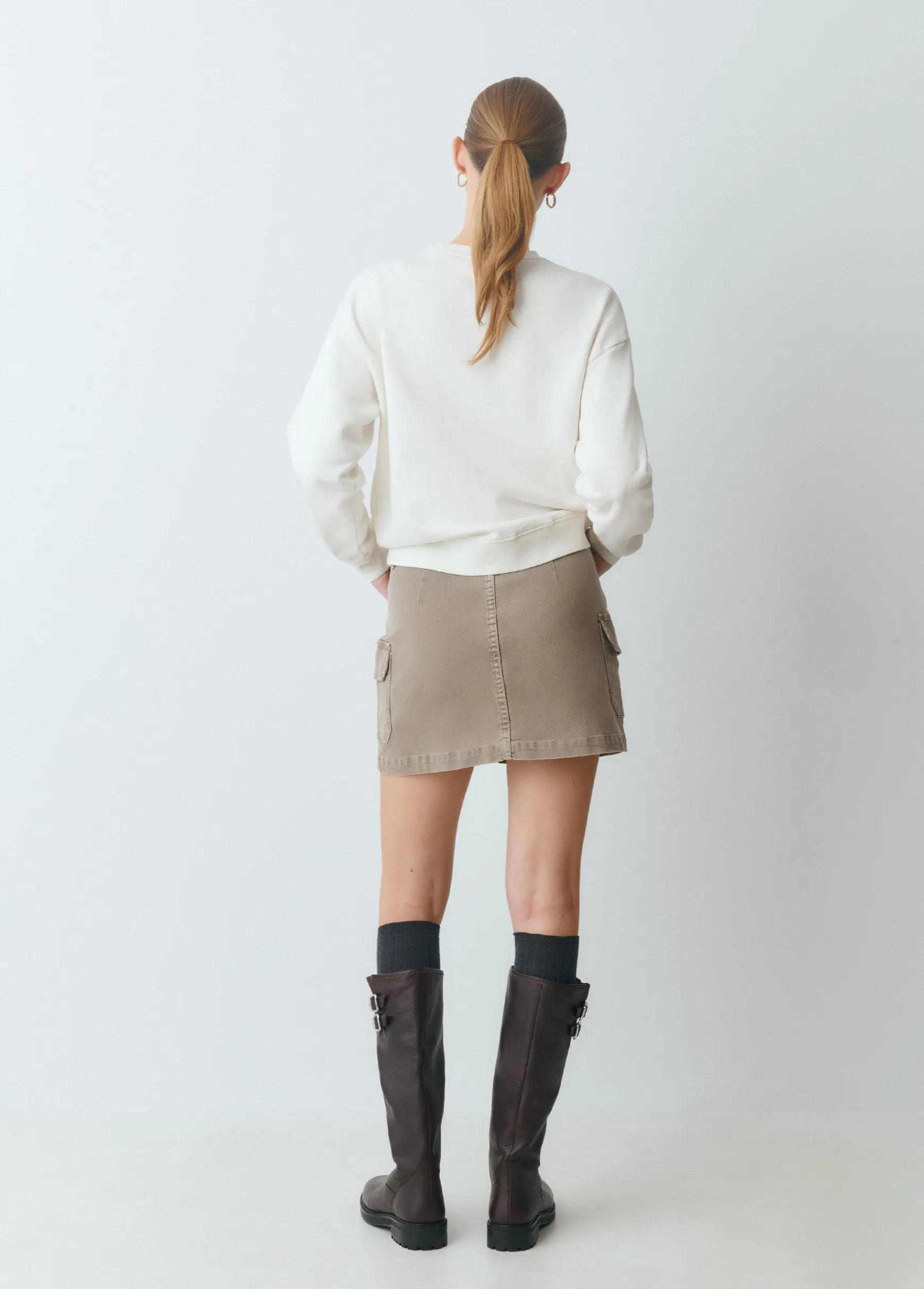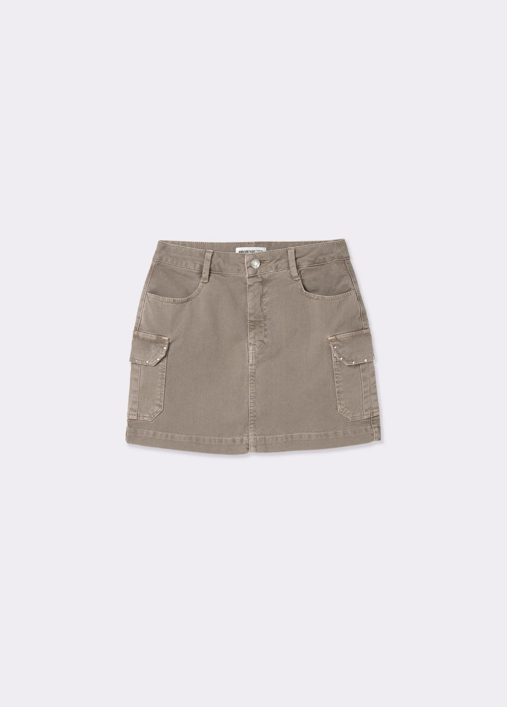 Falda corta estilo cargo con bolsillos en el frontal. Cierre mediante cremallera y botón.