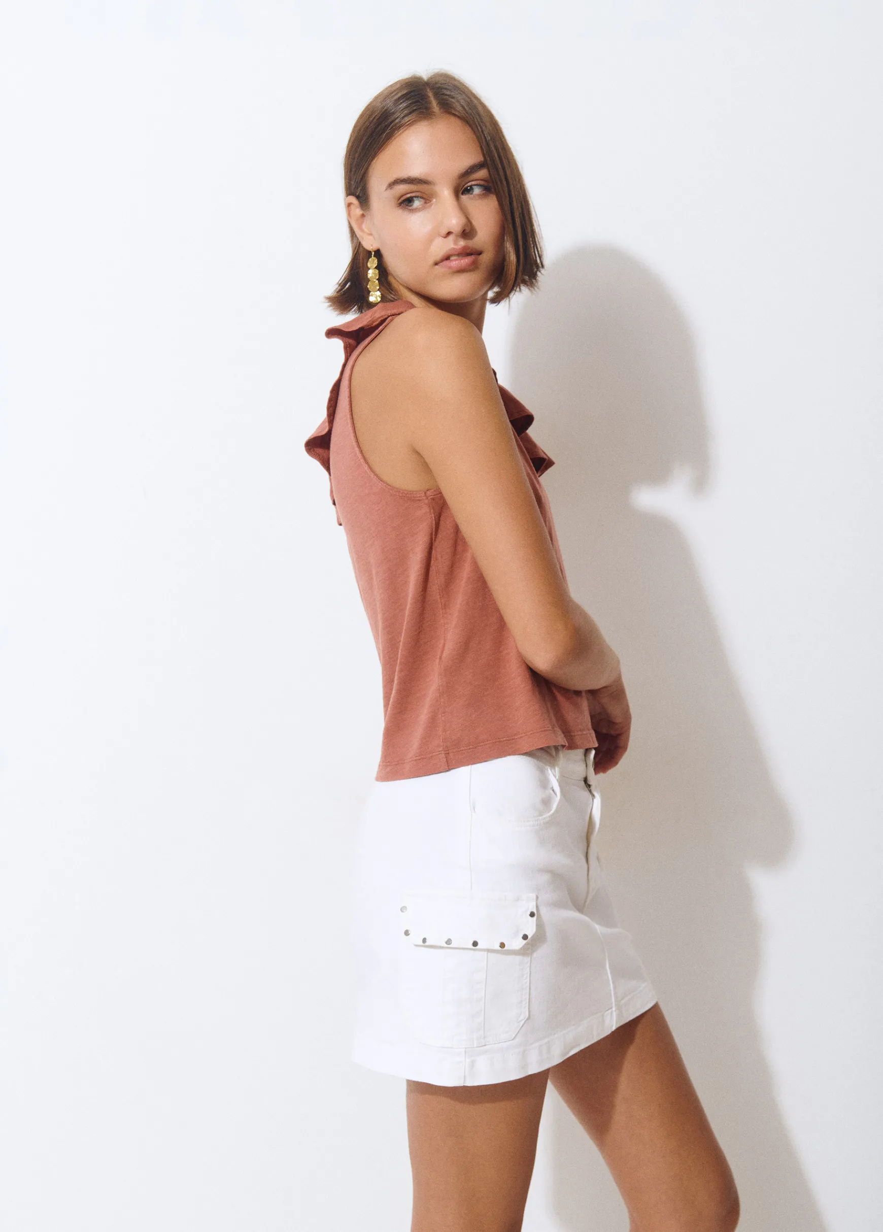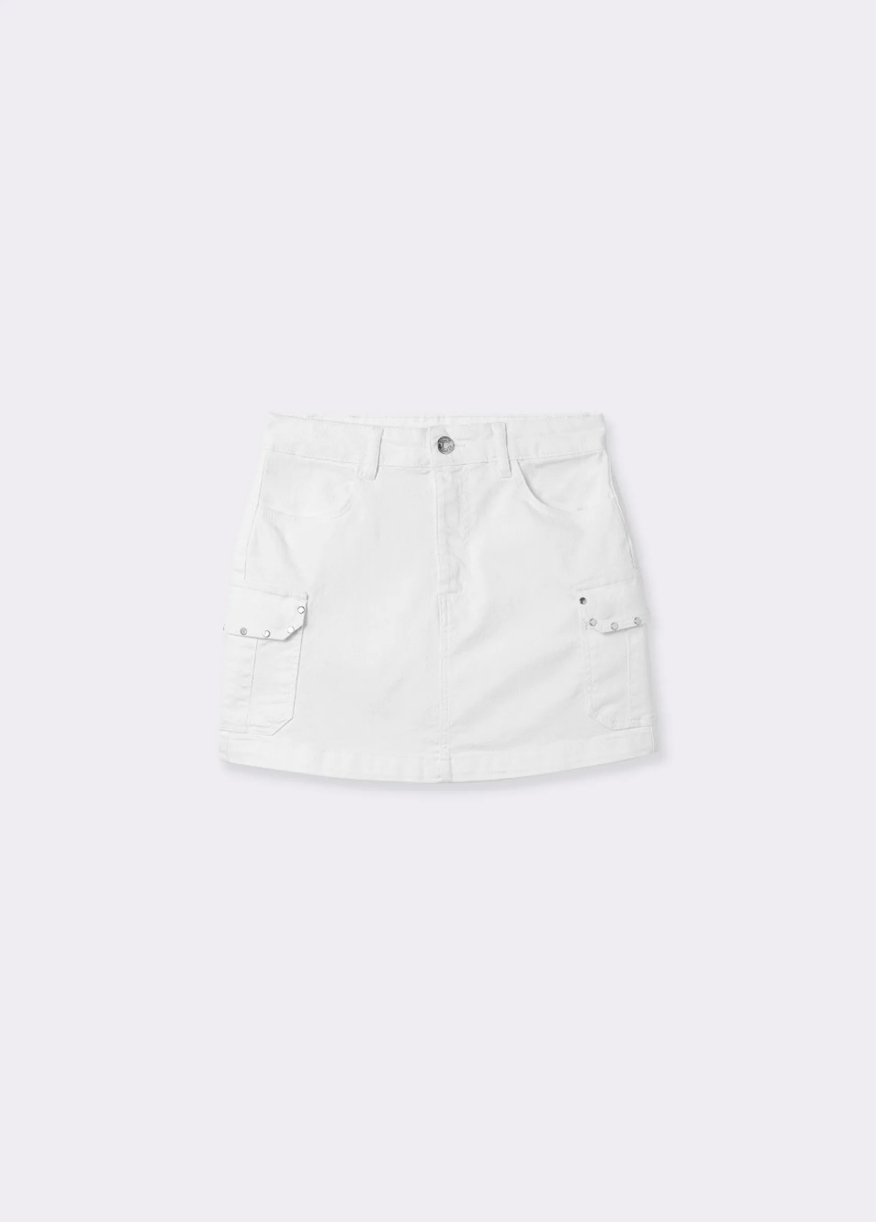 Falda corta estilo cargo con detalle de tachas en los bolsillos. Cierre mediante cremallera y botón.