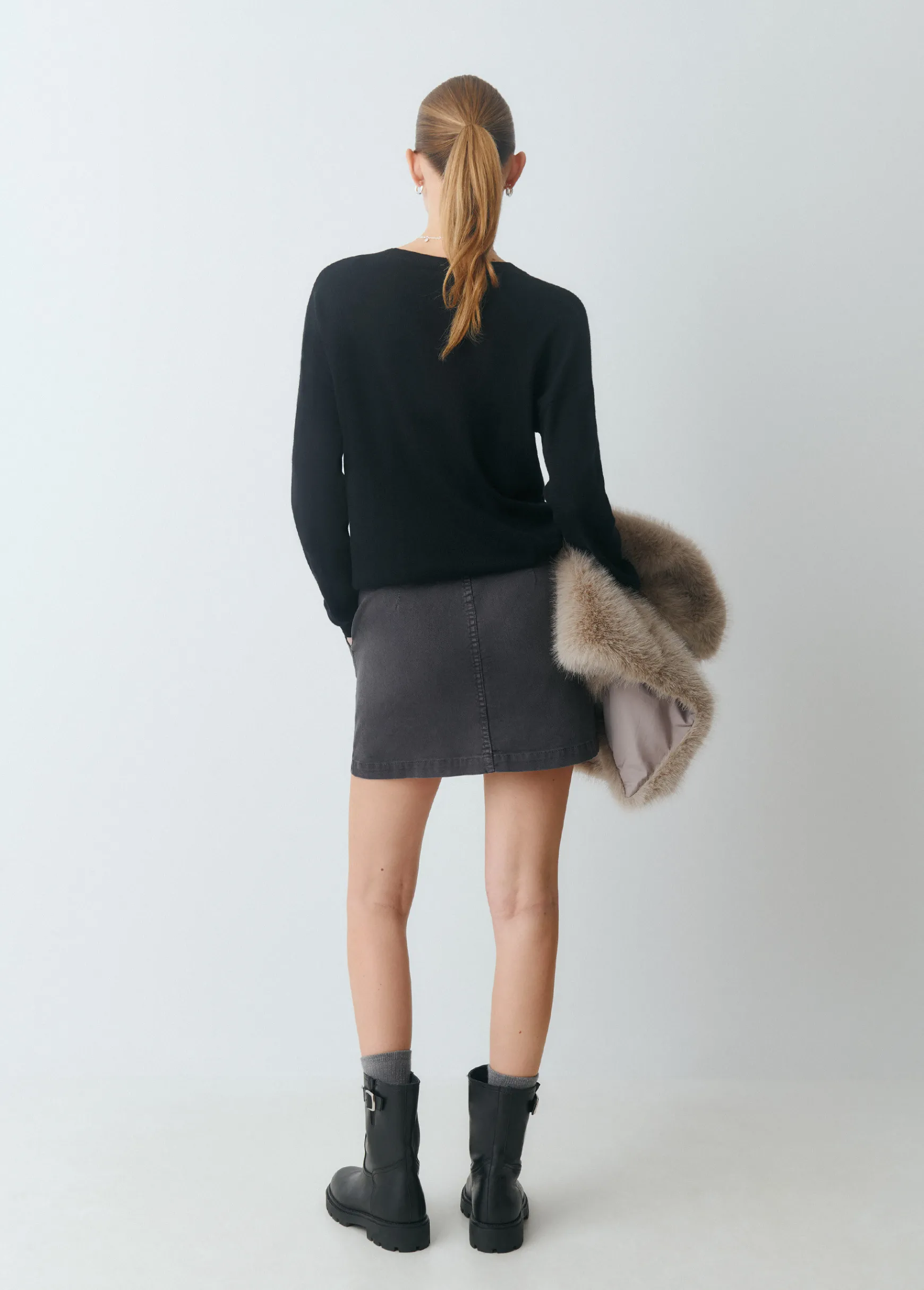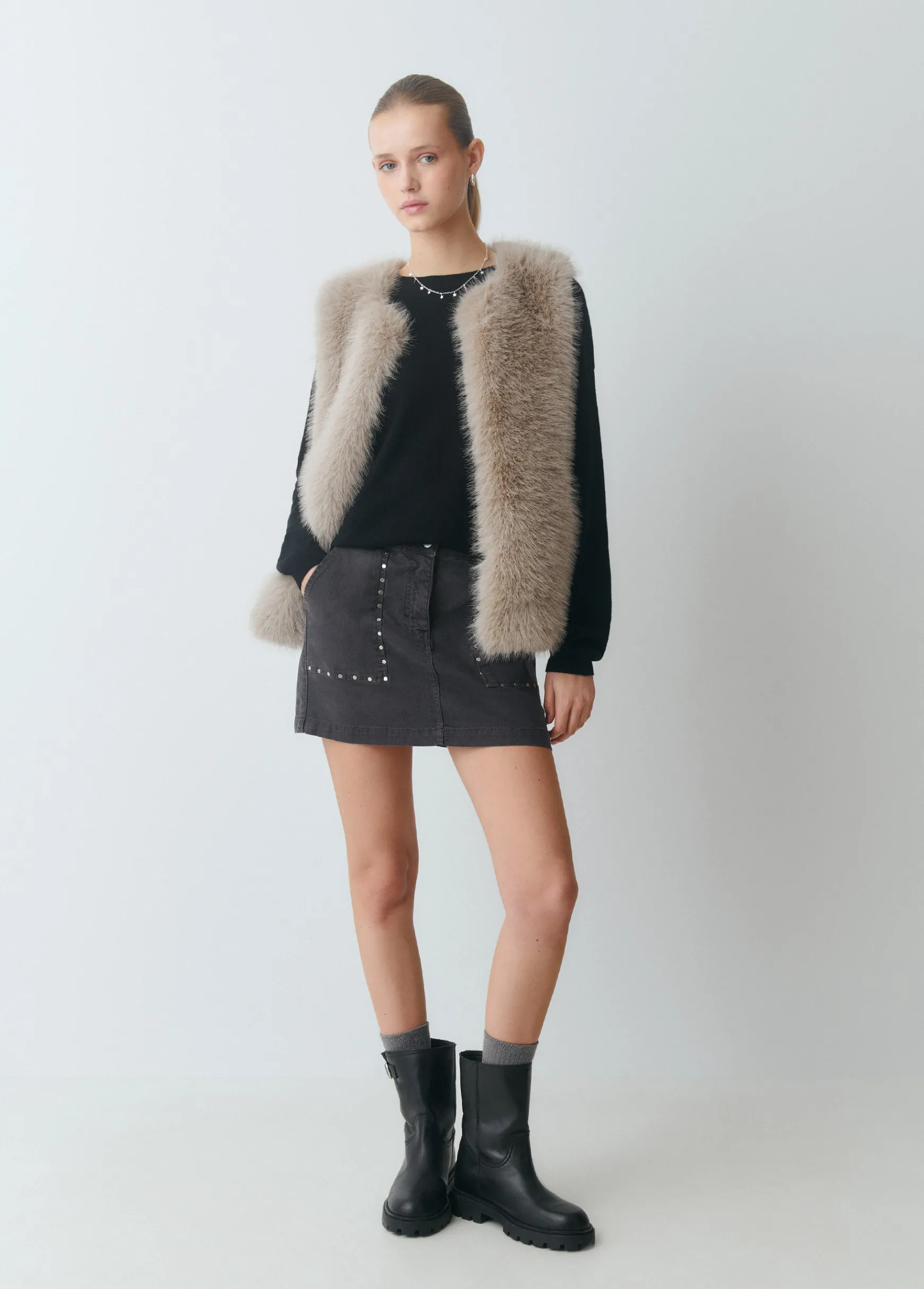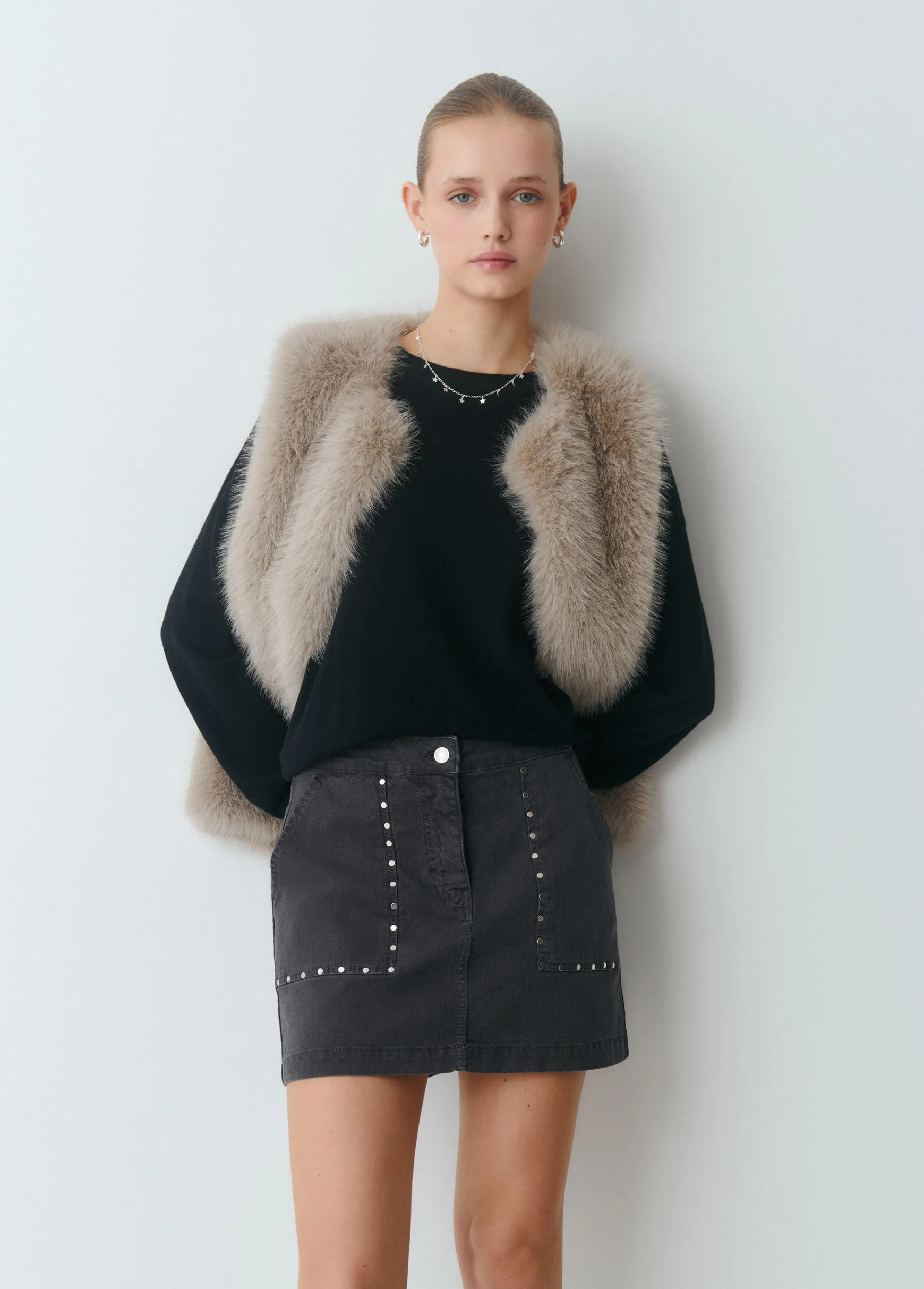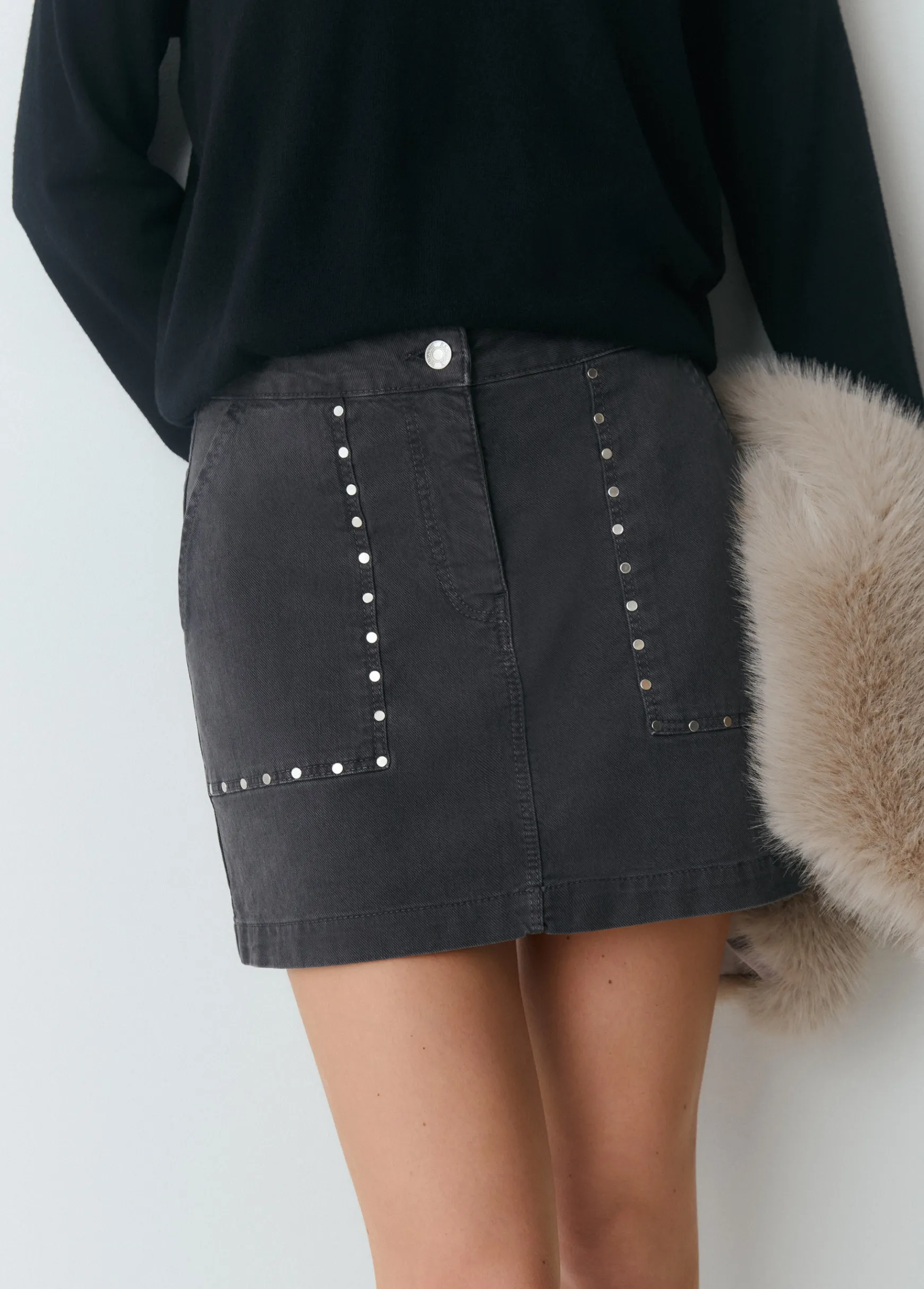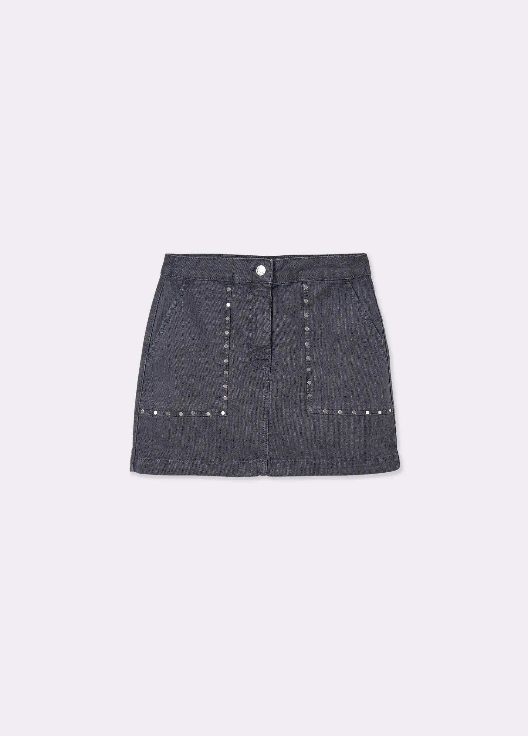 Falda corta con maxi bolsillos y detalle de tachas en plata. Cierre mediante cremallera y botón.