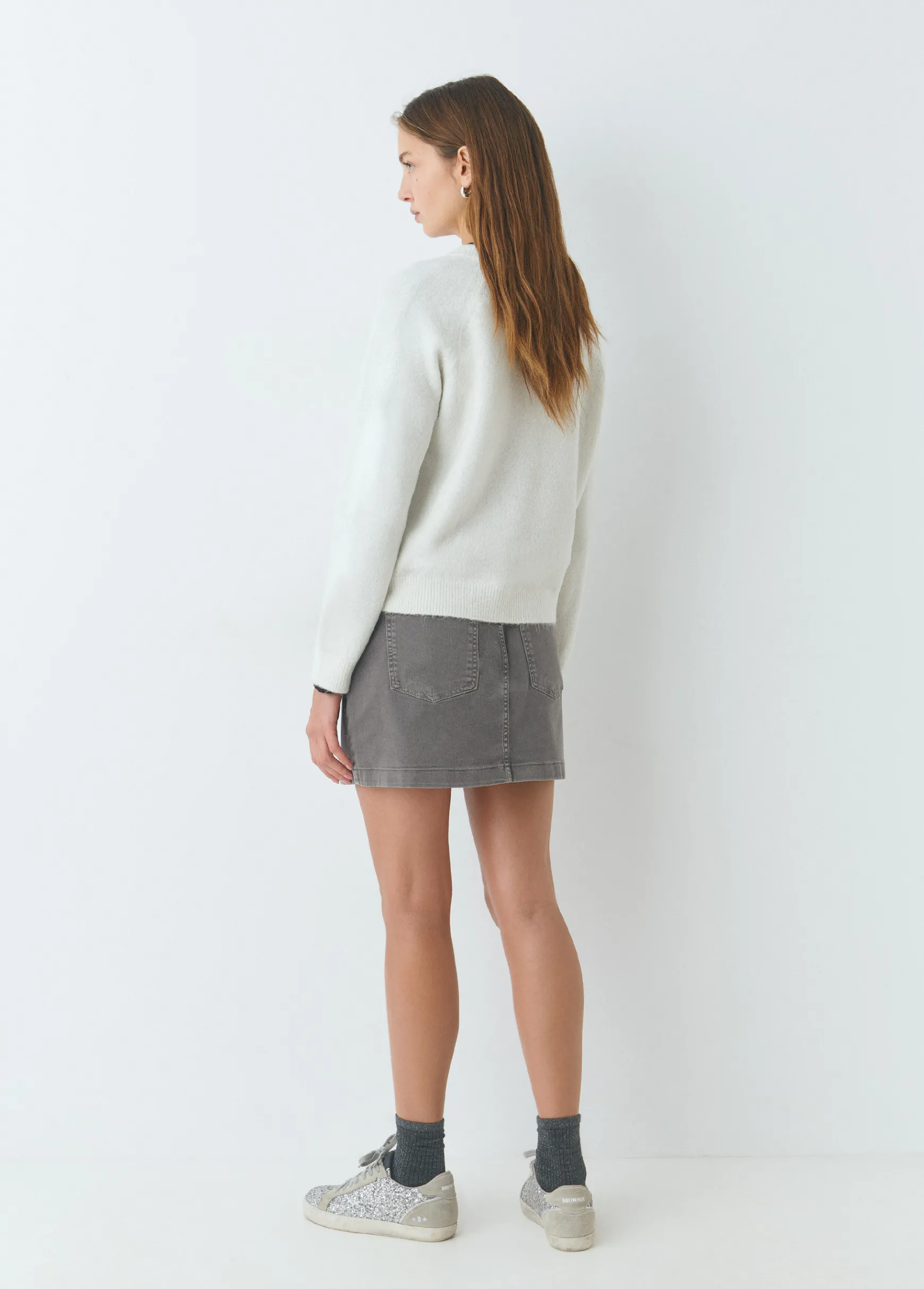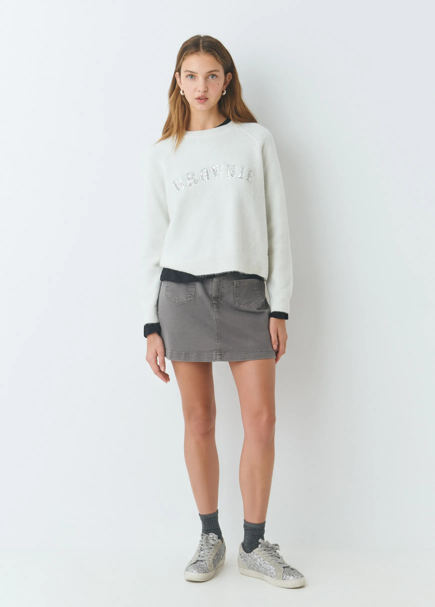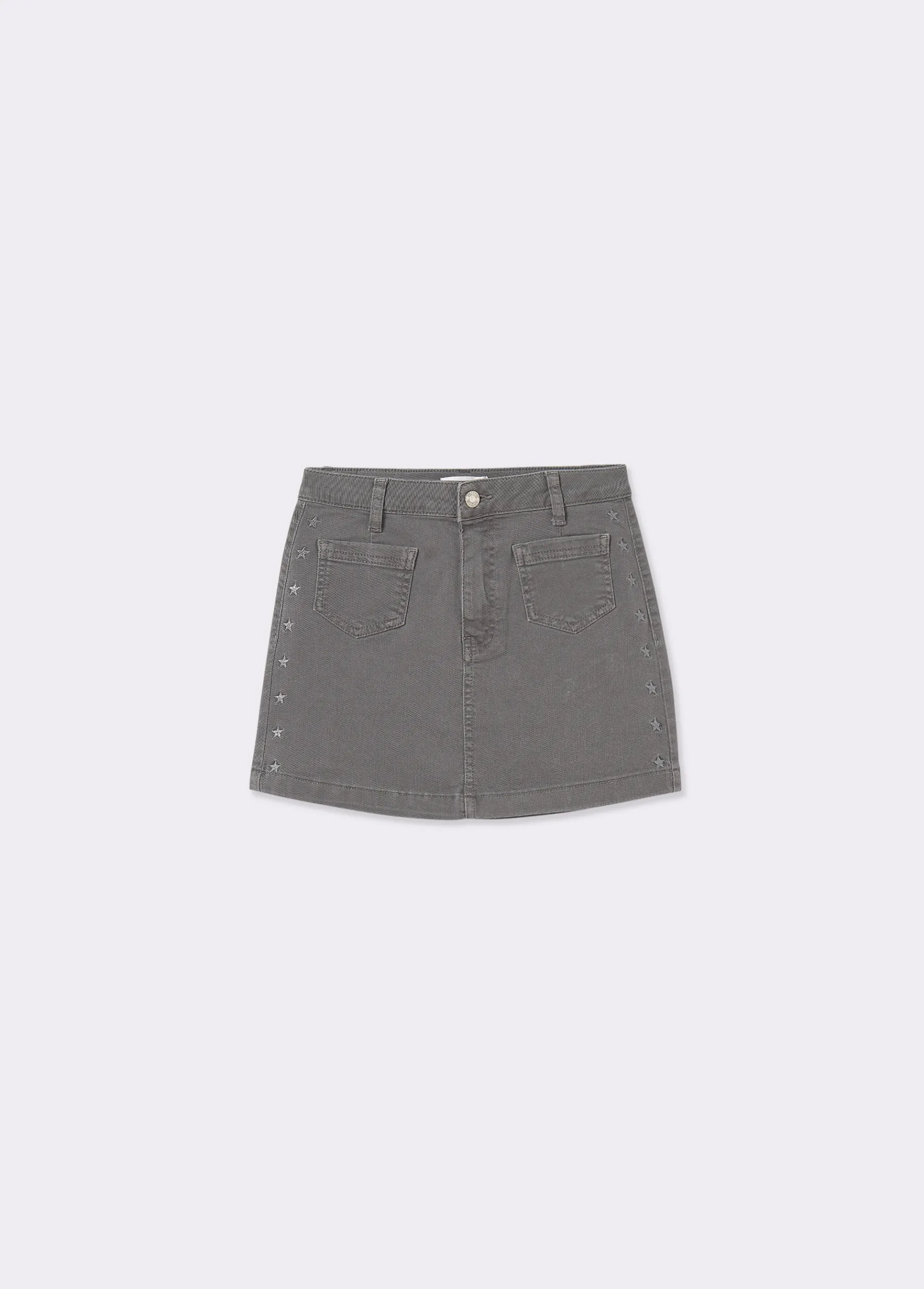Falda corta con bolsillos y detalle de estrellas bordadas en plata. Cierre mediante cremallera y botón.