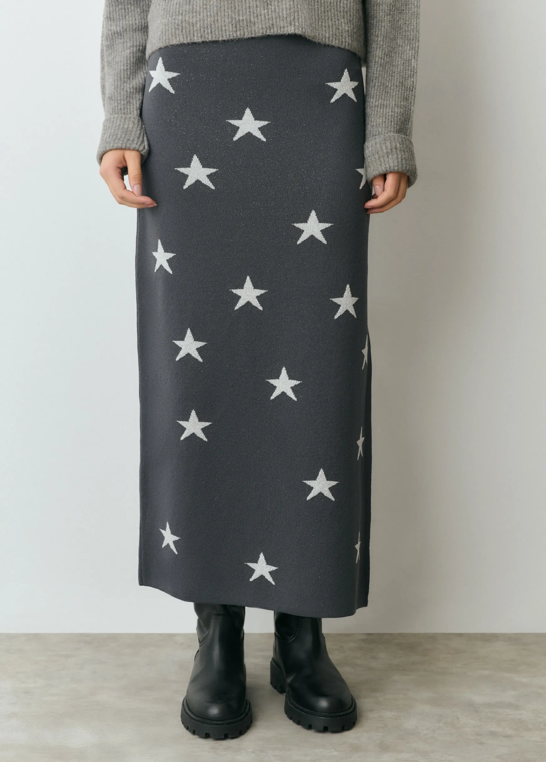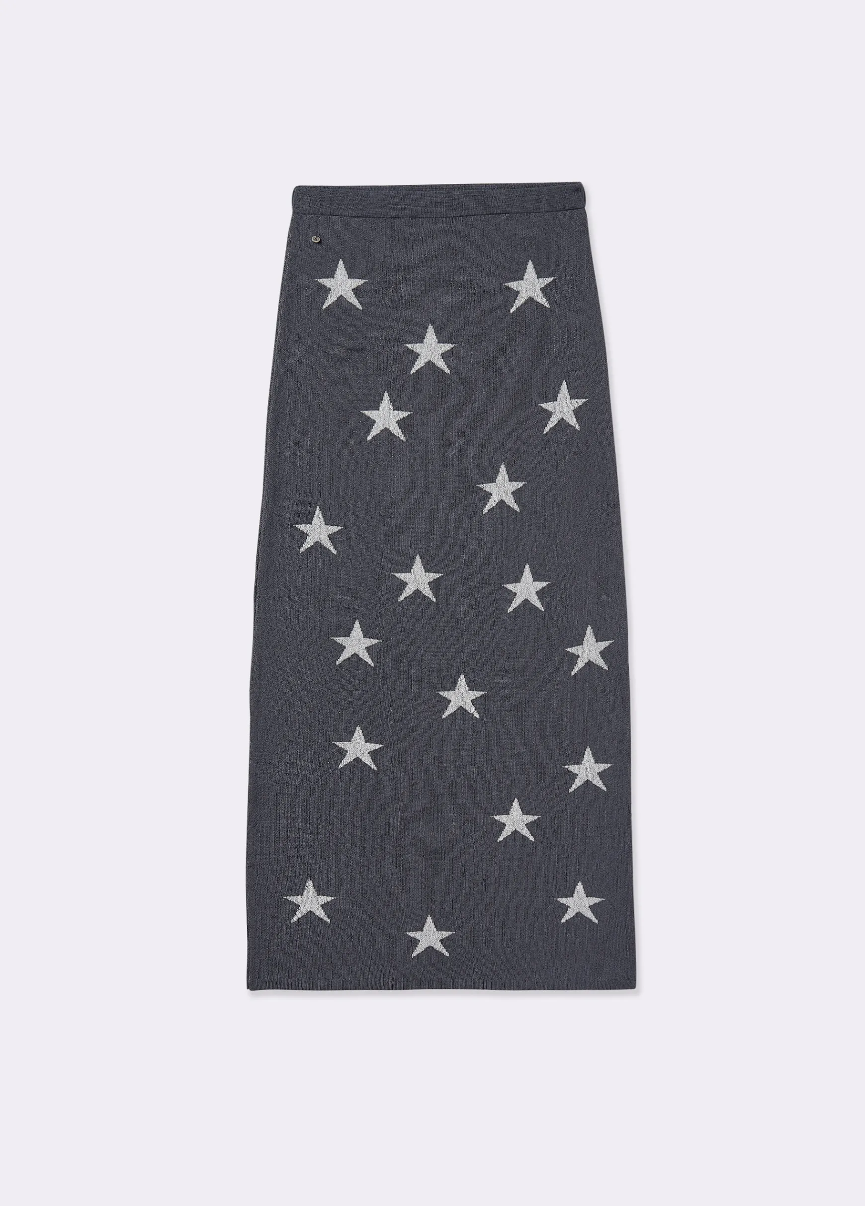 Falda larga de punto con estampado de estrellas, fruncido lateral y goma en la cintura.