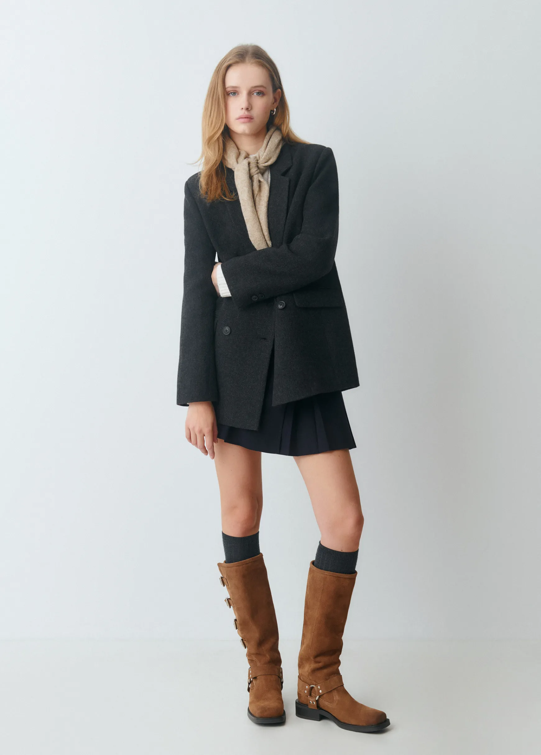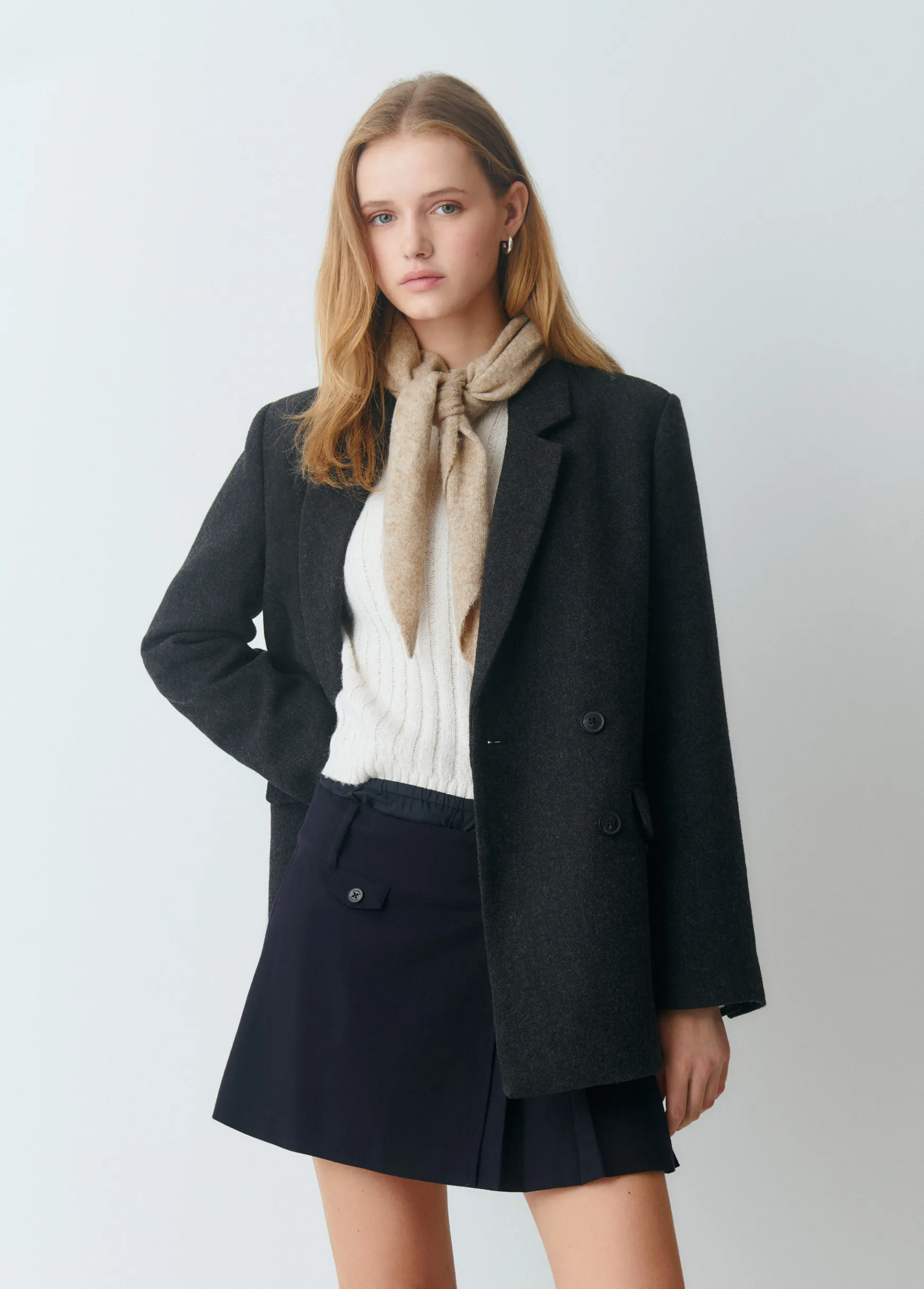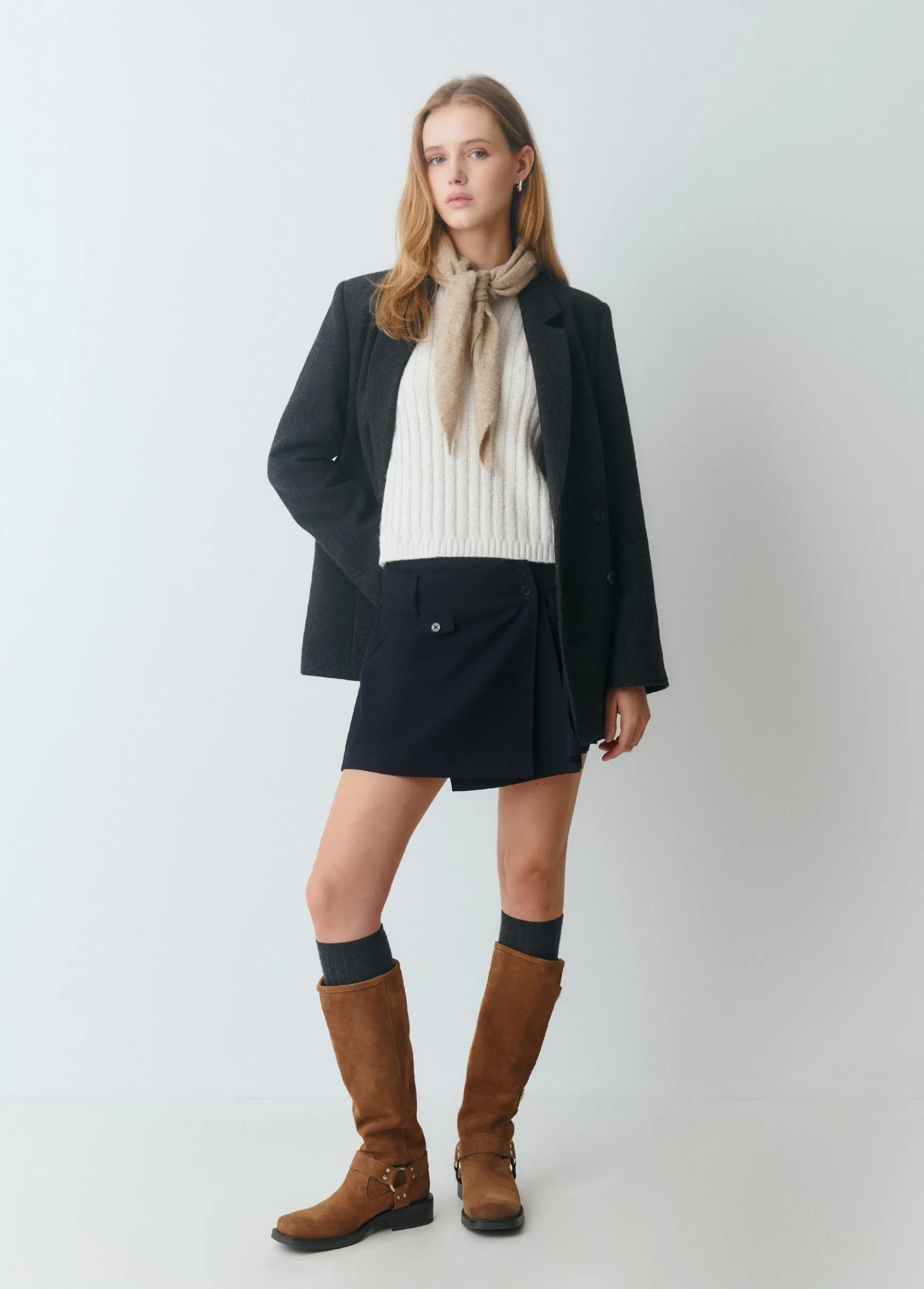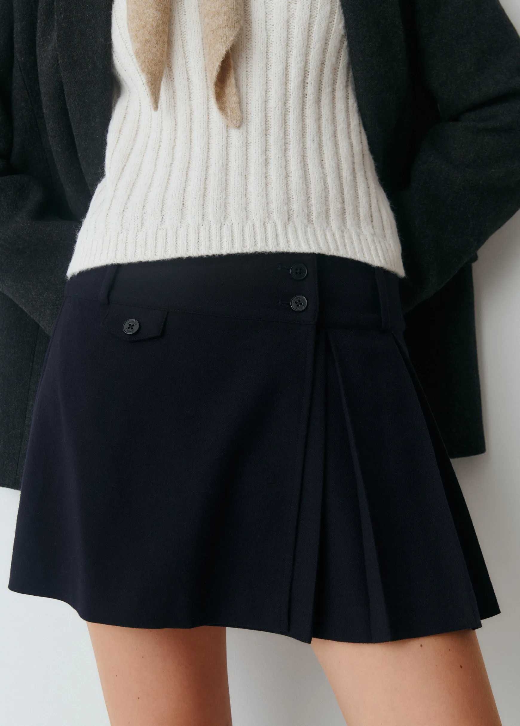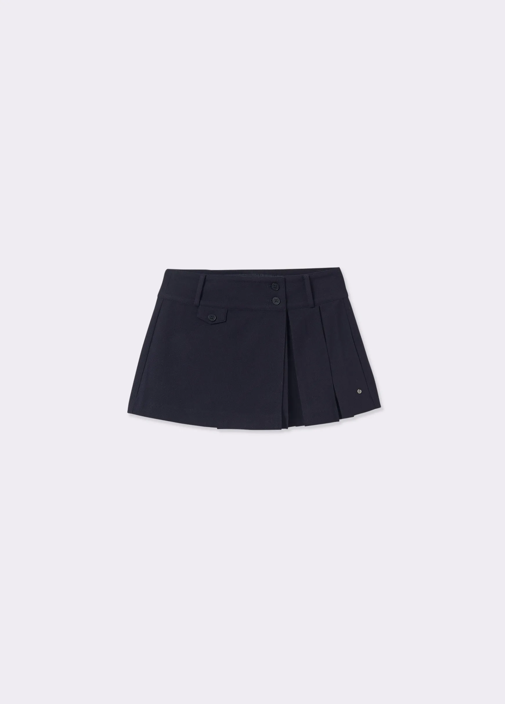 Falda corta de tablas con cierre mediante cremallera y botones en el frontal.