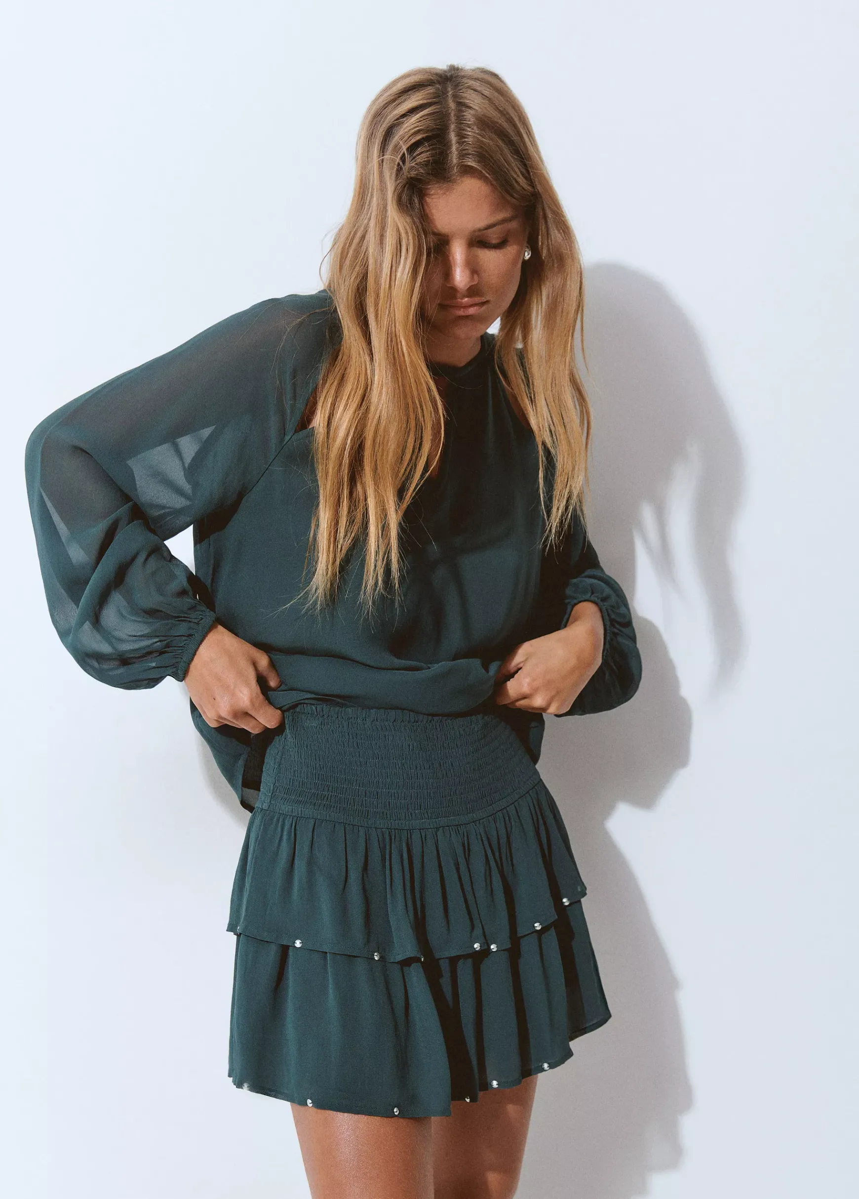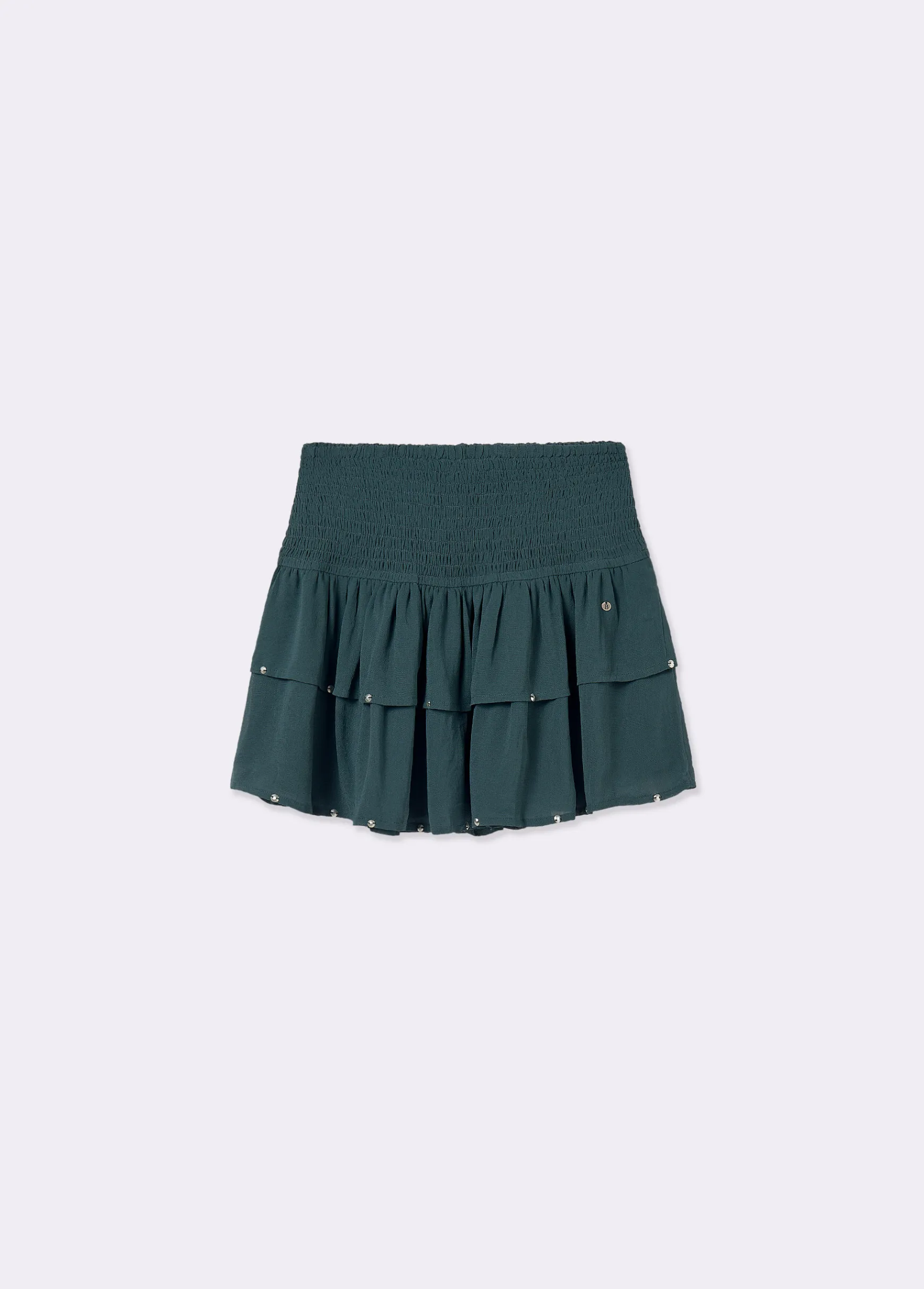Falda pantalón corta con smock, volantes en la parte inferior y detalle de tachas.