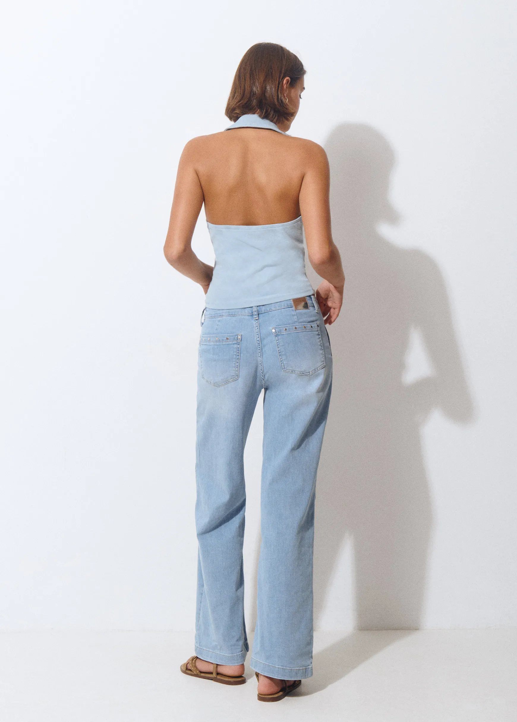 Vaquero tipo culotte con dos maxi bolsillos en el delantero con detalle de tachas. Cierre mediante cremallera y botón en el frontal.