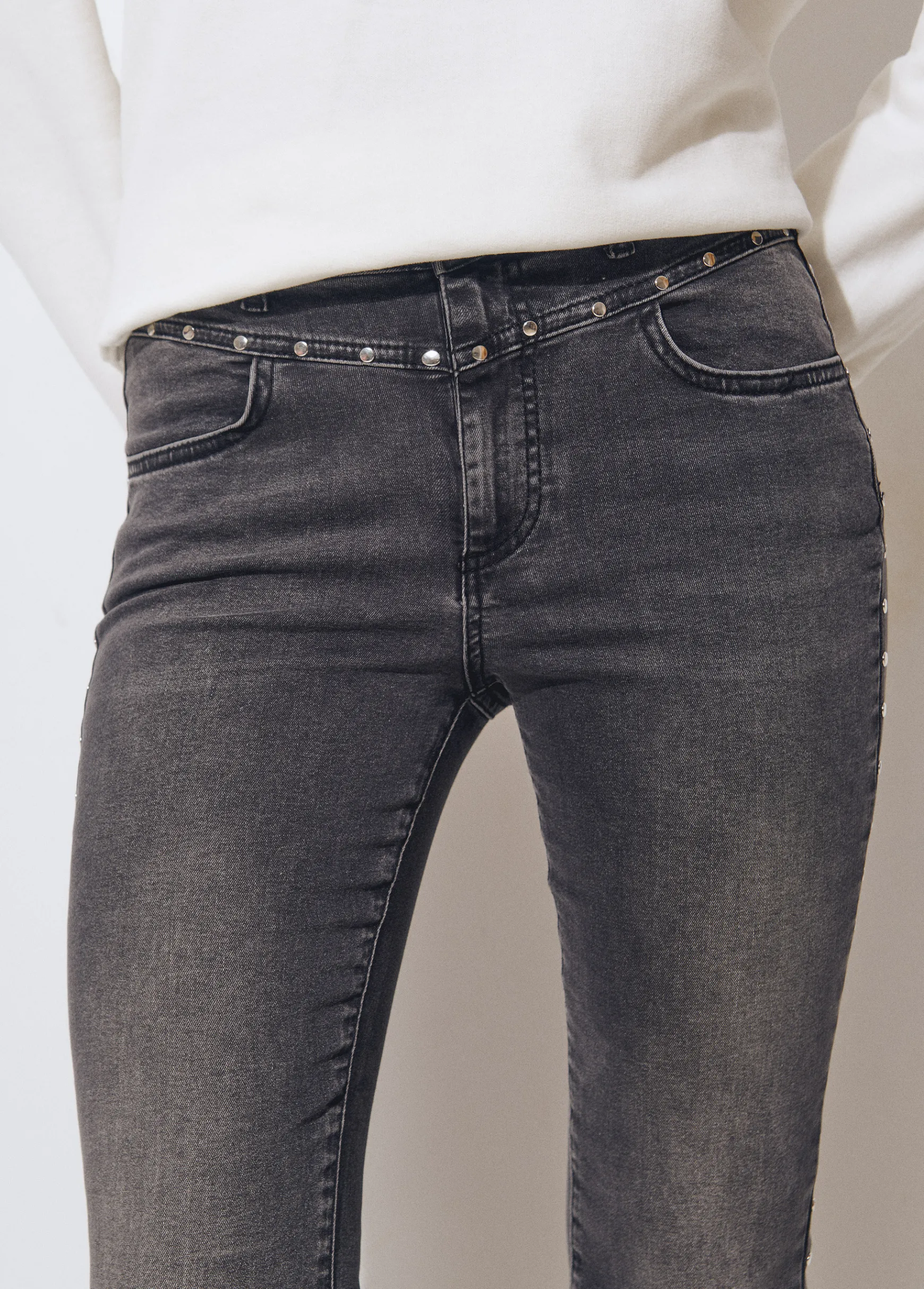 Vaqueros de campana cropped de tiro medio con detalle de tachas en plata. Cierre mediante cremallera y botón.