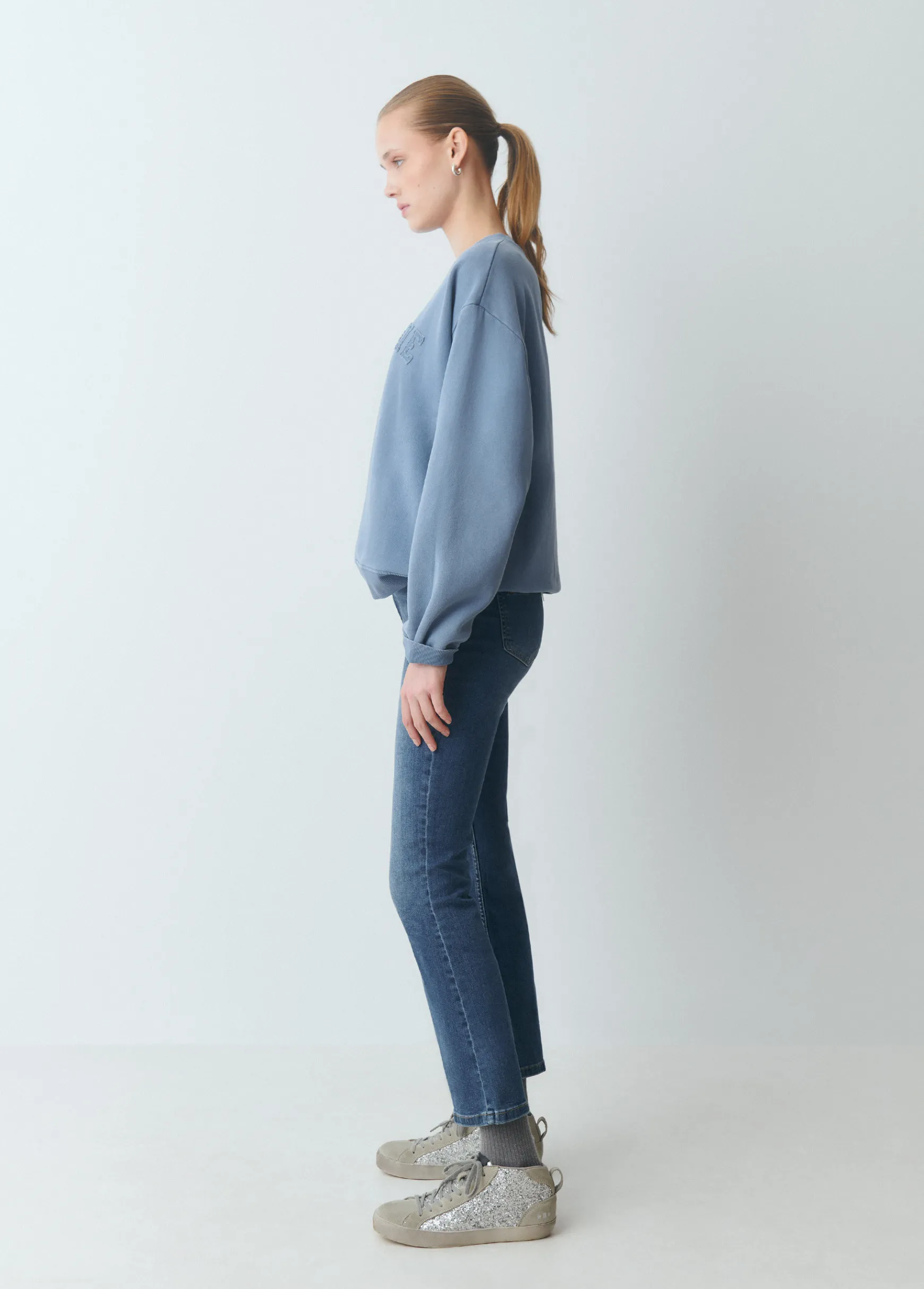 Tejano de campana tipo culotte de tiro medio, cinco bolsillos y cierre mediante cremallera y botón en el frontal.