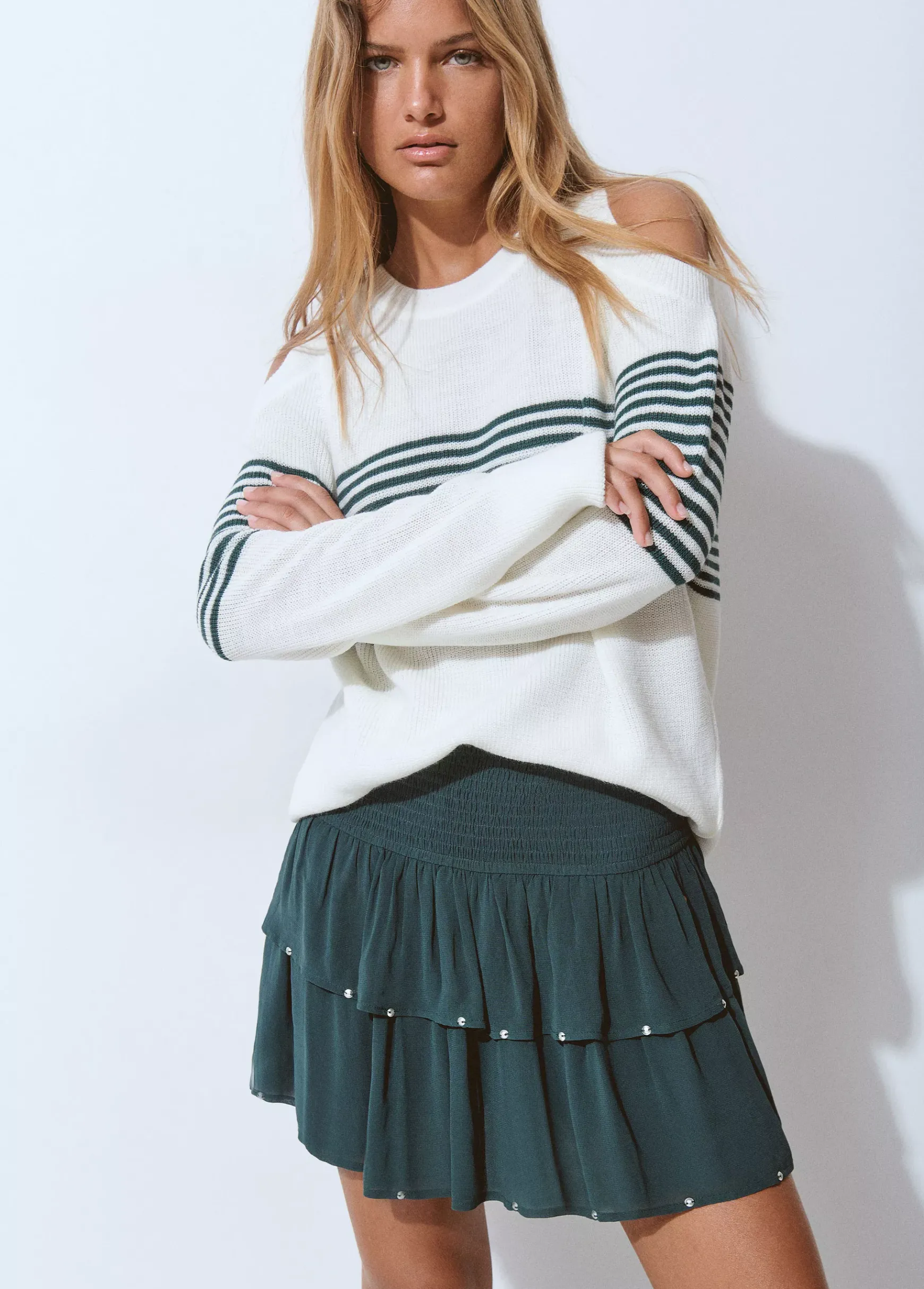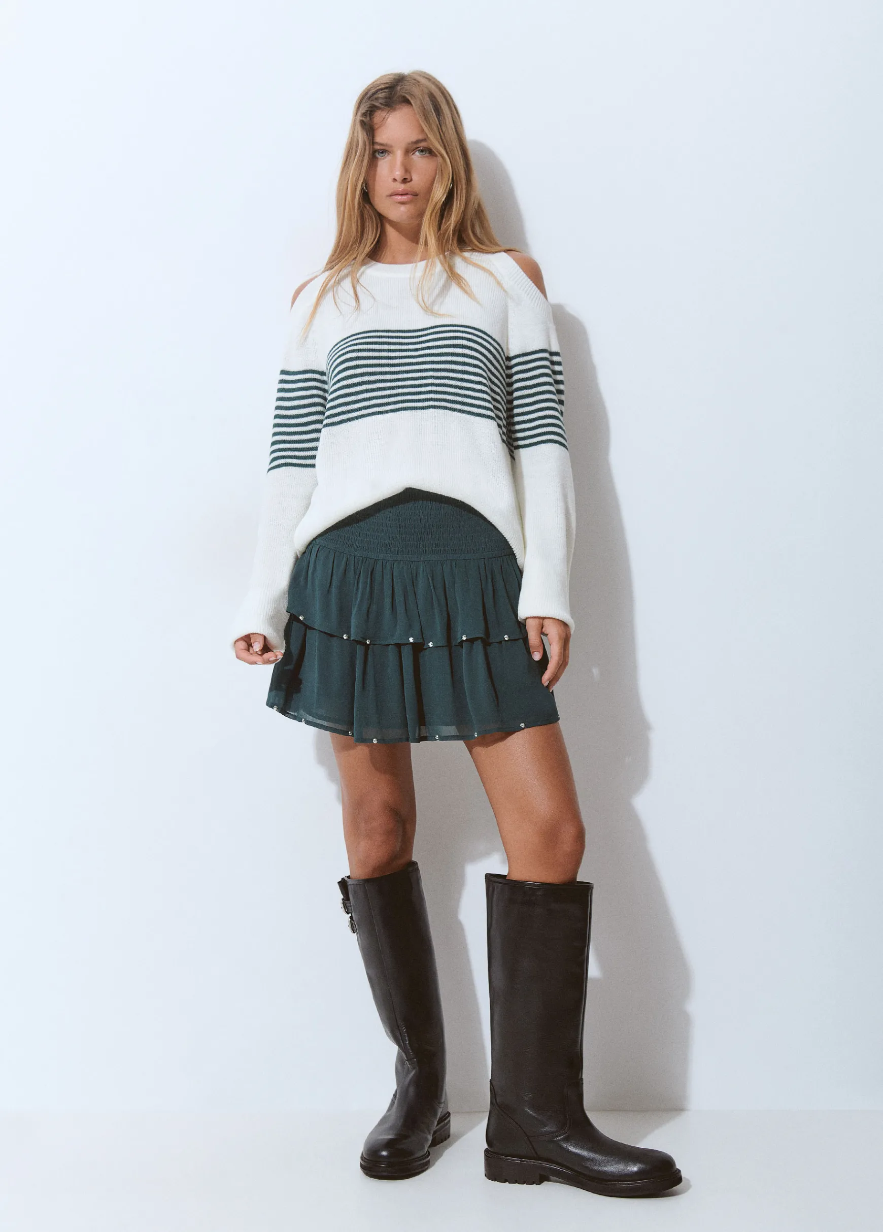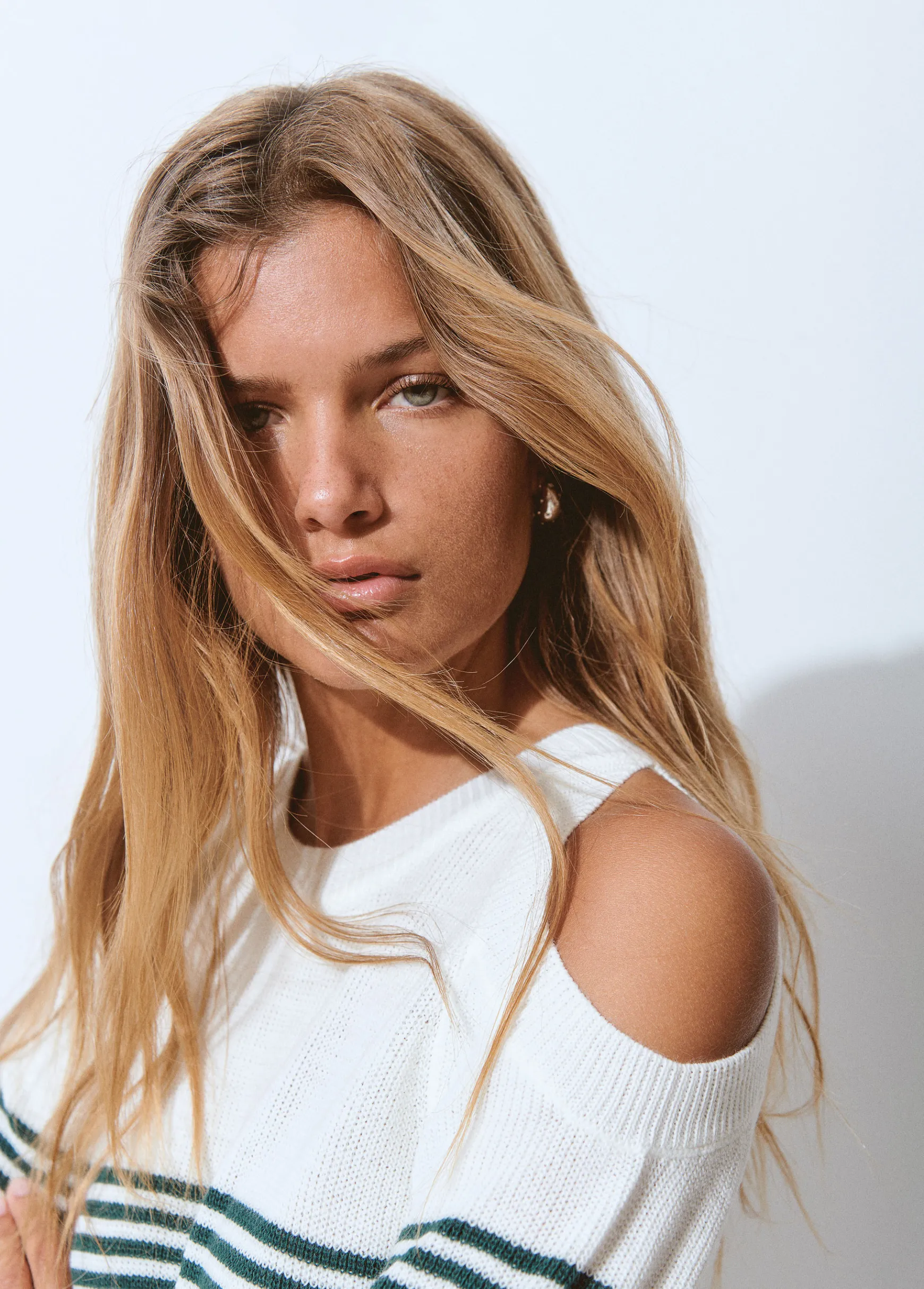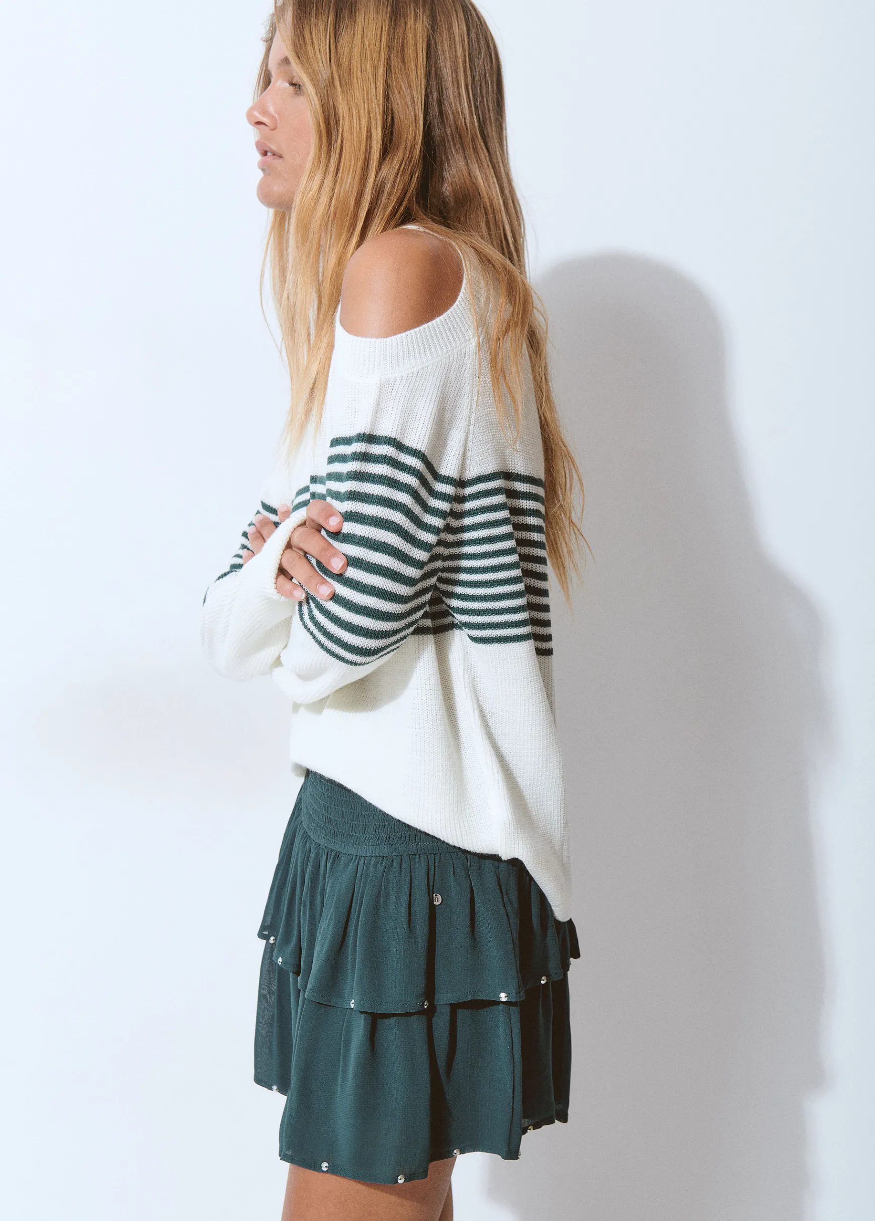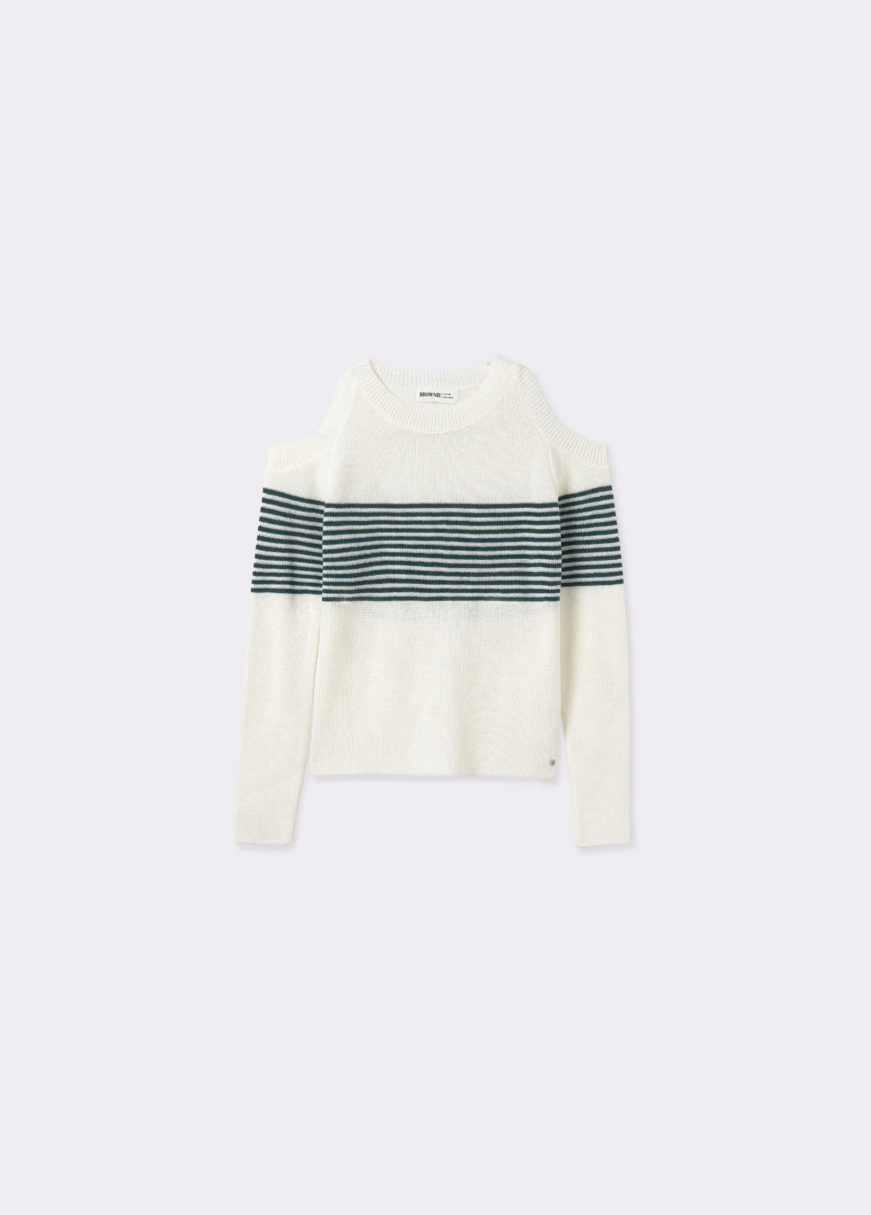 Jersey de rayas de manga larga, hombros descubiertos y cuello redondo.