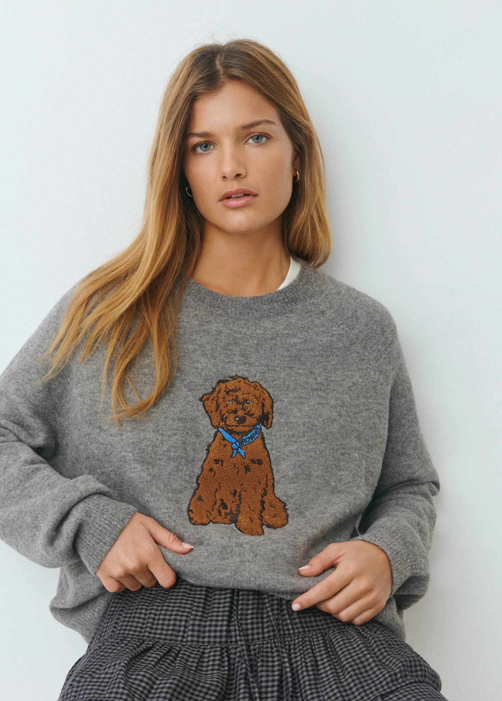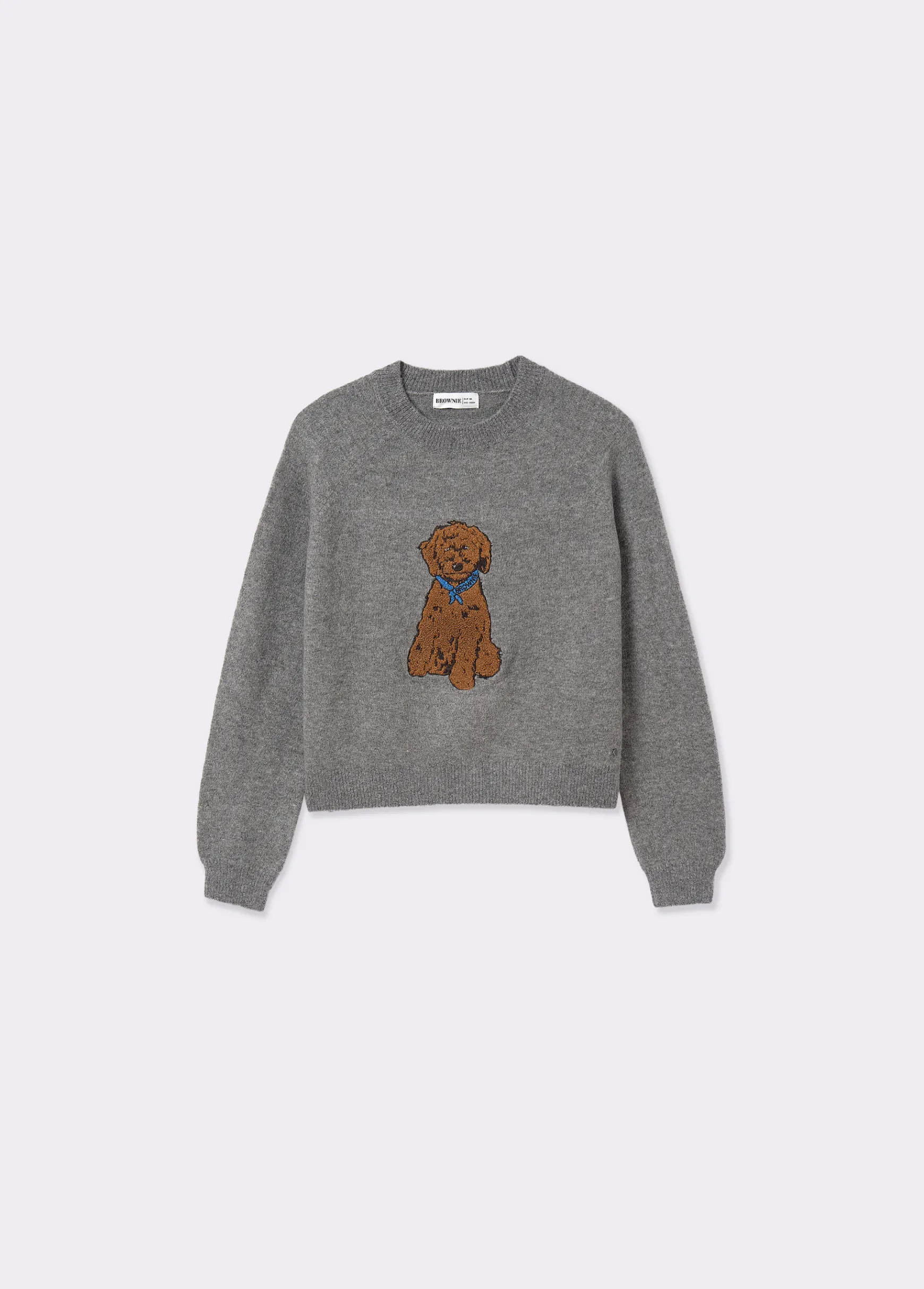 Jersey de manga larga, cuello redondo y perrito bordado en la parte frontal.