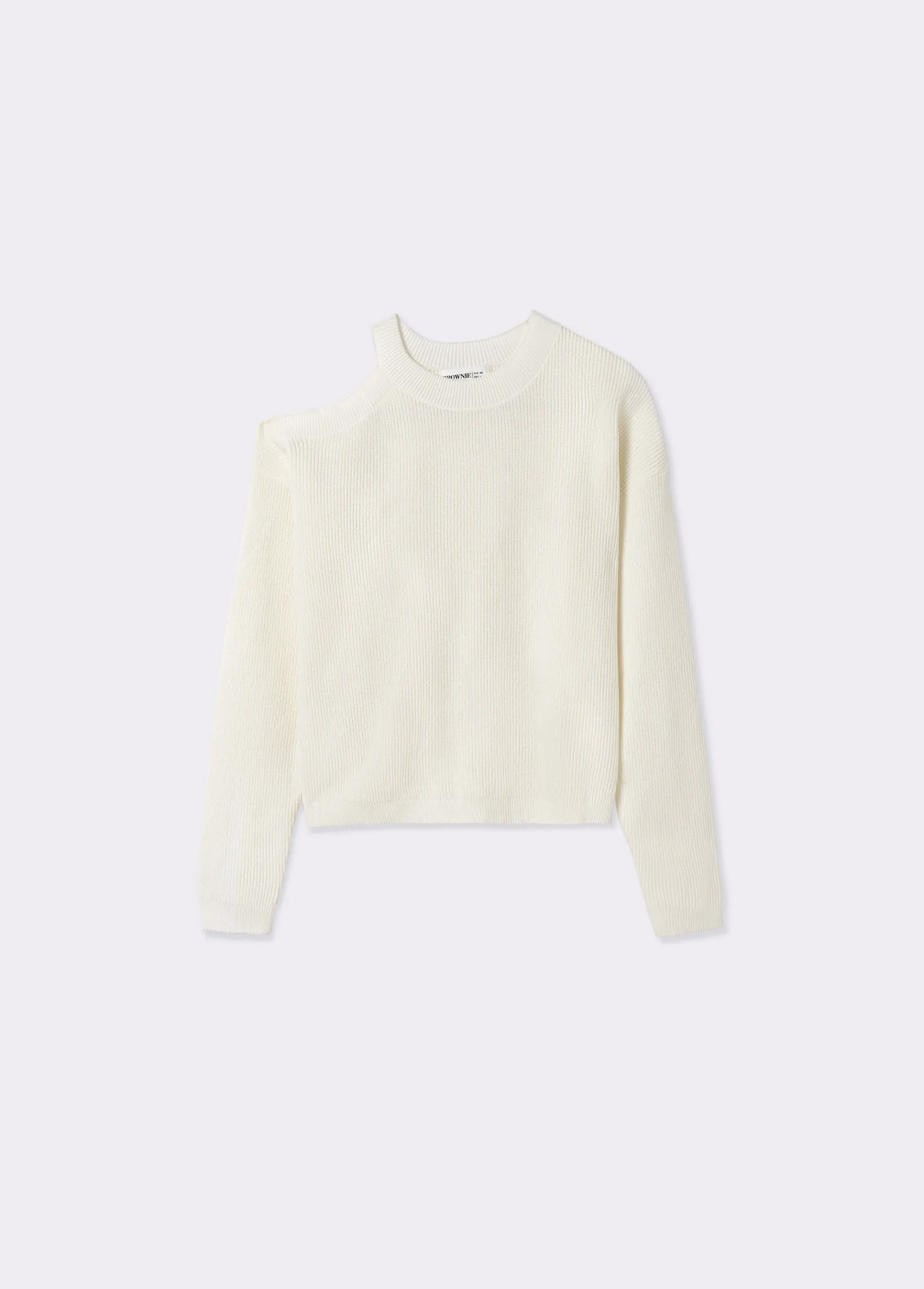 Jersey de chenilla de manga larga con hombro descubierto y cuello redondo.