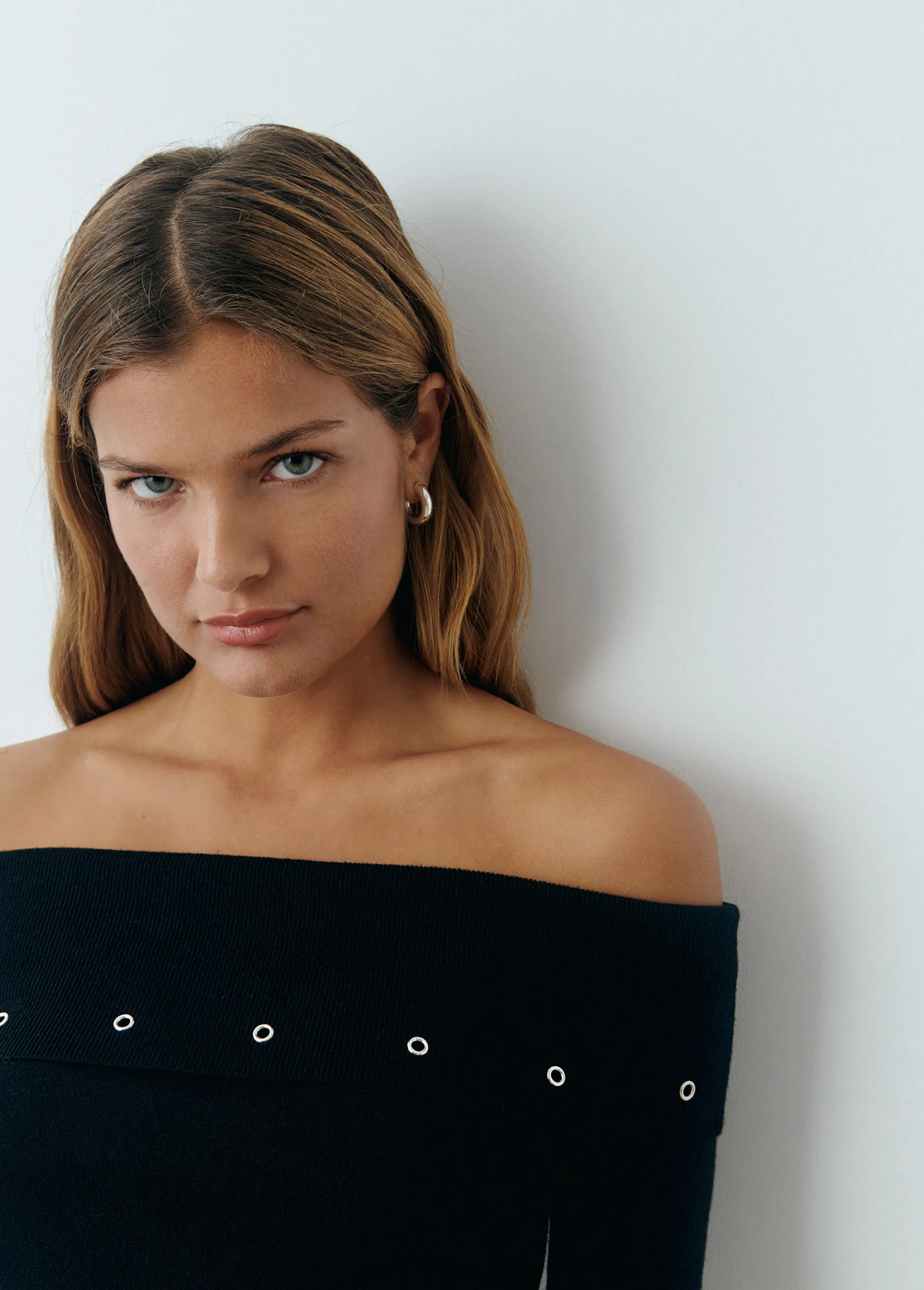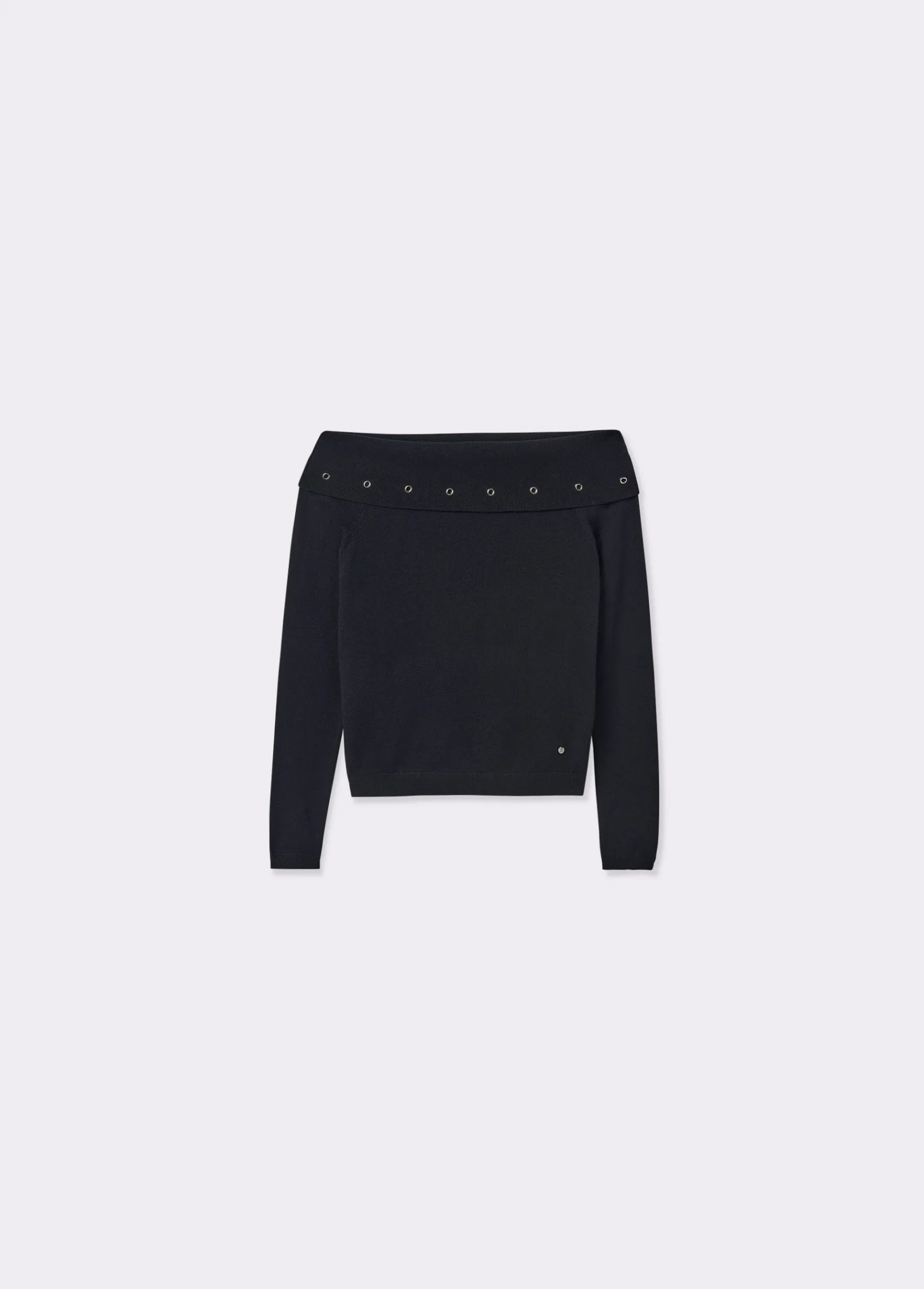 Jersey de manga larga y cuello de barco con detalle de eyelets.