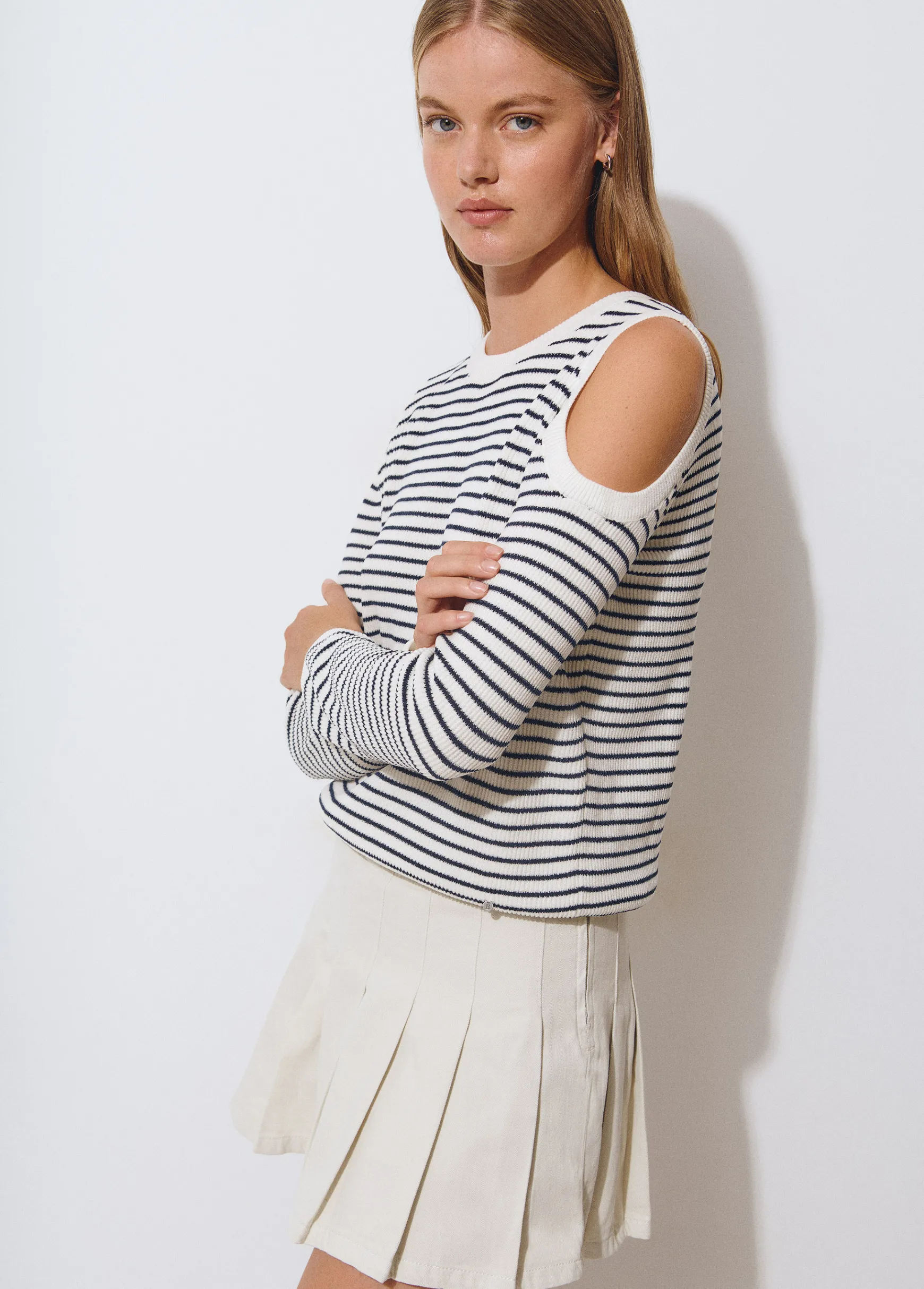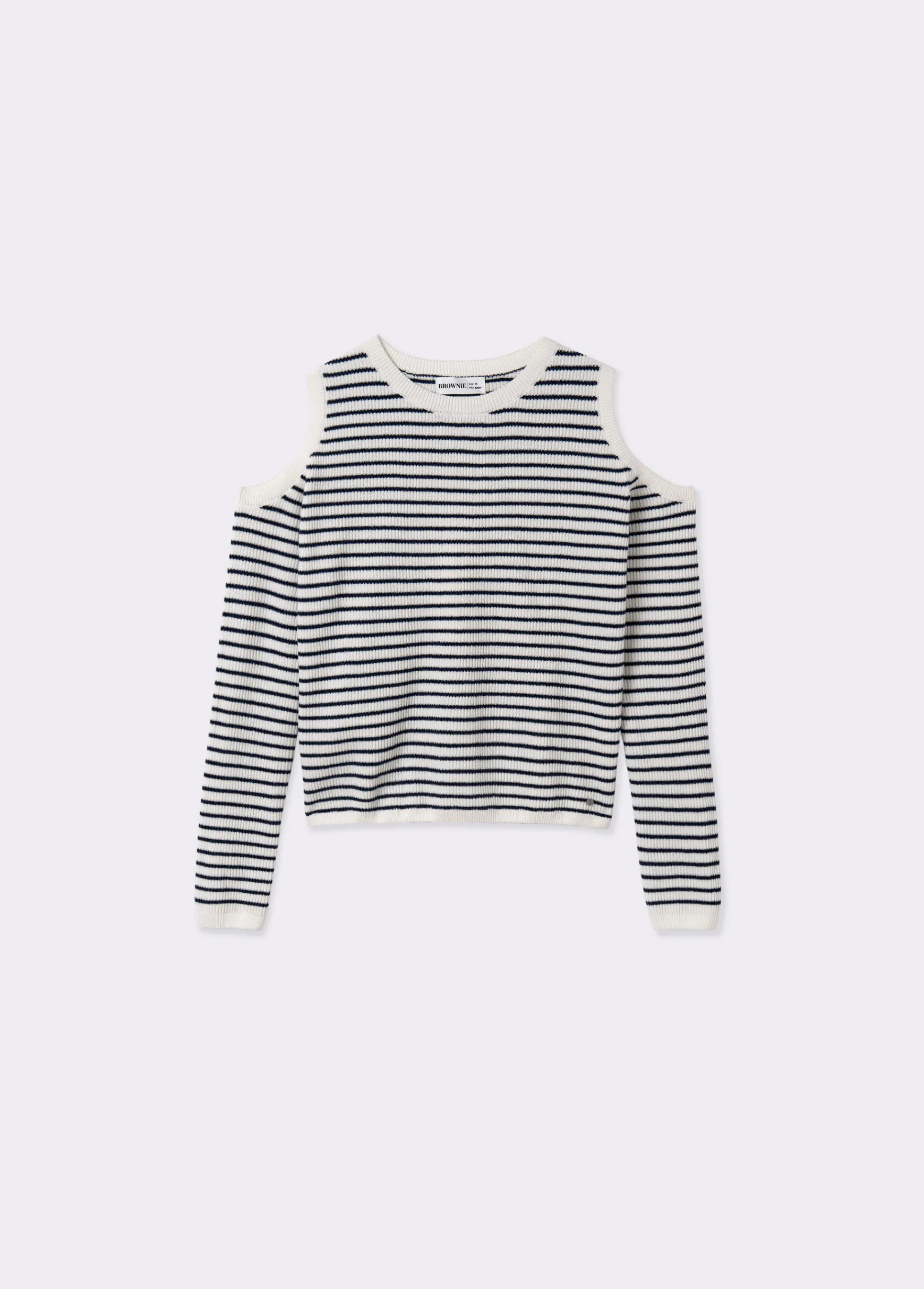 Jersey de chenilla de manga larga de rayas, hombros descubiertos y cuello redondo.