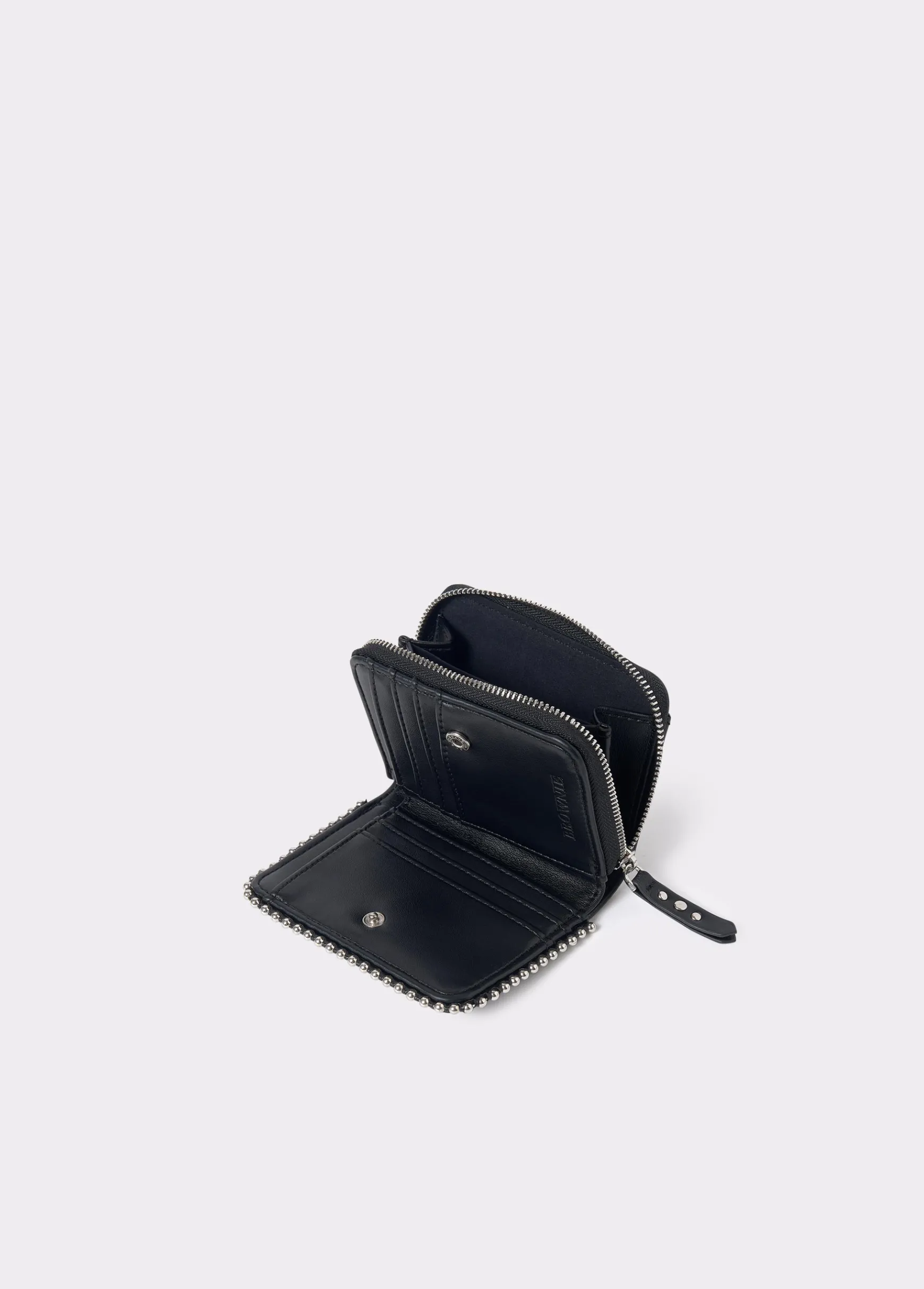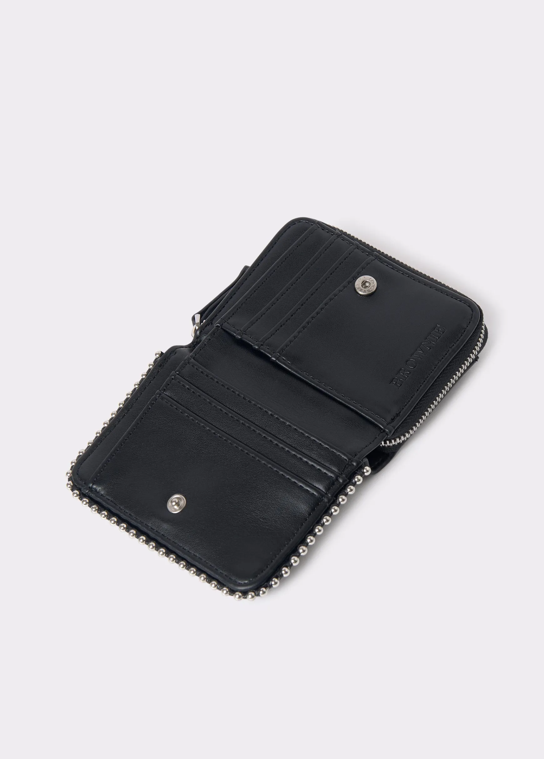Monedero redondeado en color negro liso con bolitas y cremallera para guardar monedas.