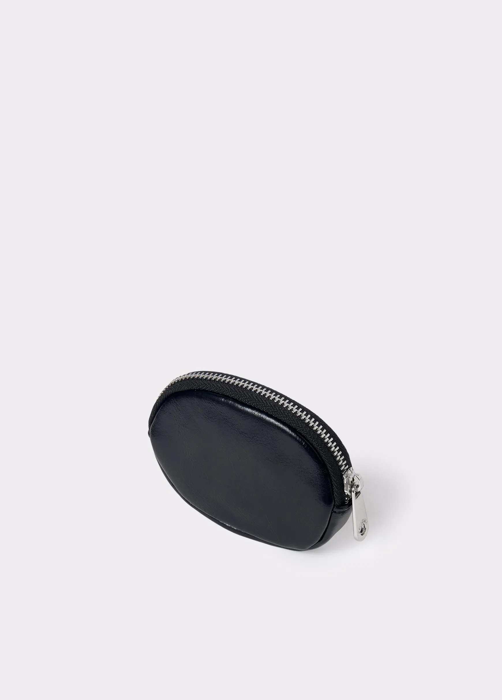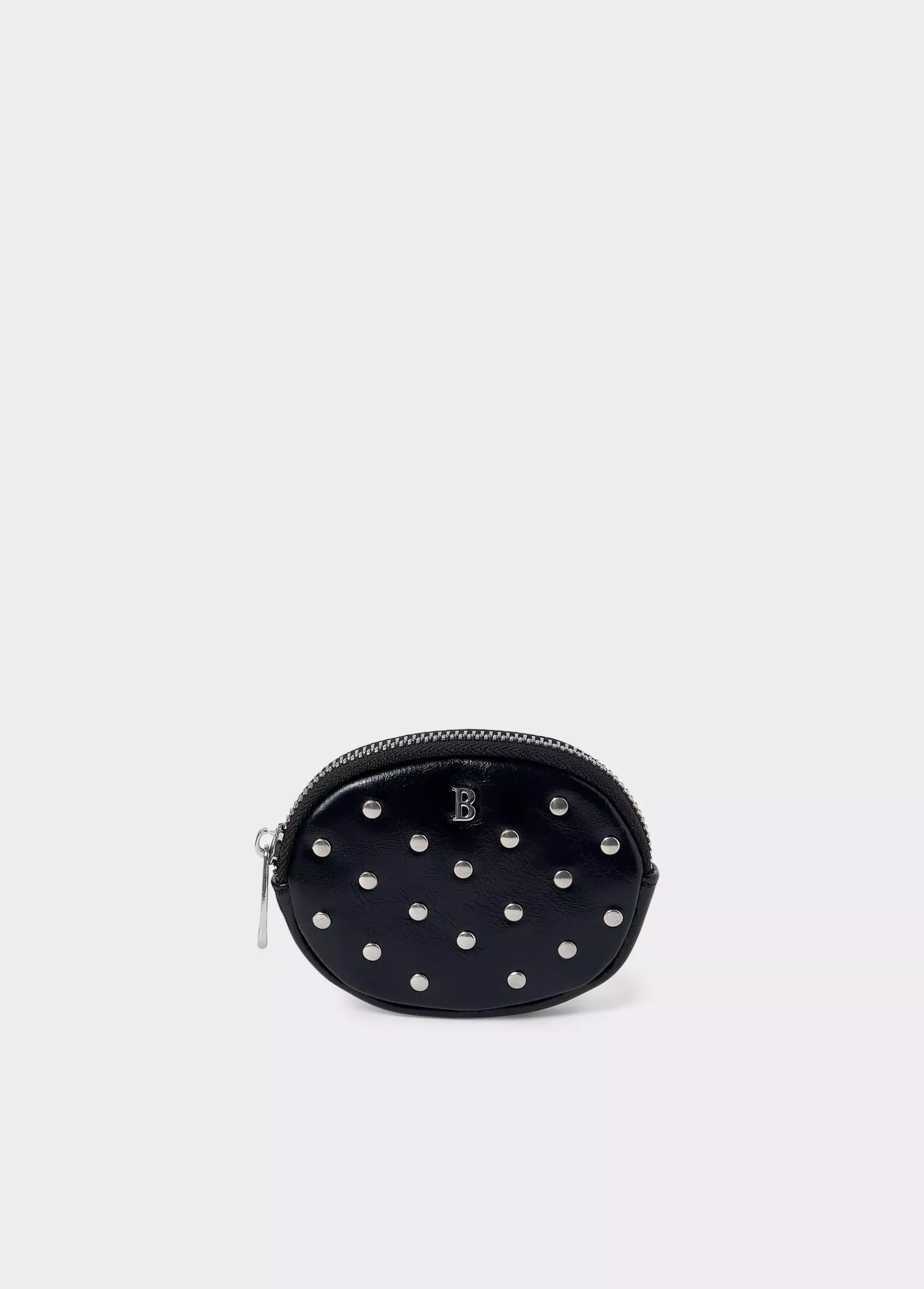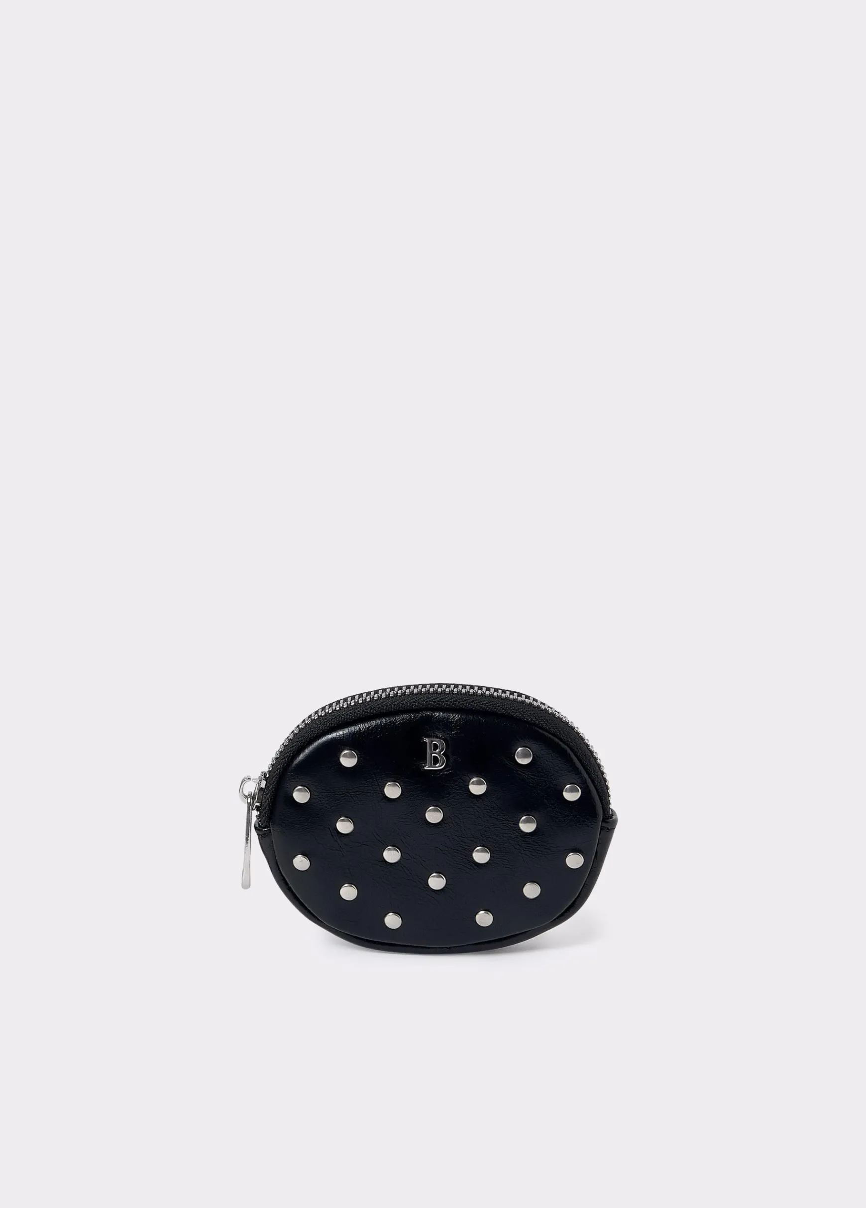Monedero redondeado de color negro con tachas plateadas y cremallera para guardar monedas.