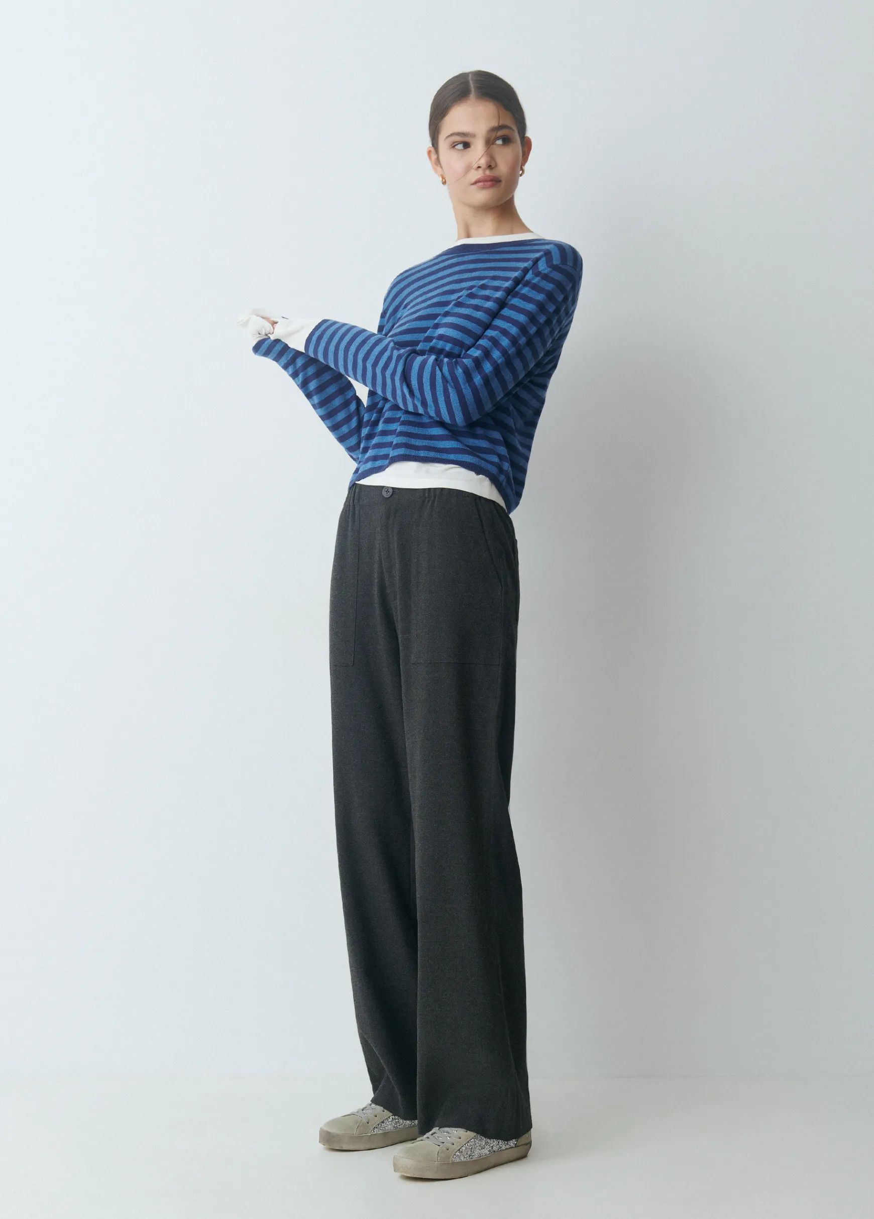 Pantalón recto con goma en la cintura y bolsillos. Cierre mediante cremallera y botón en el frontal.