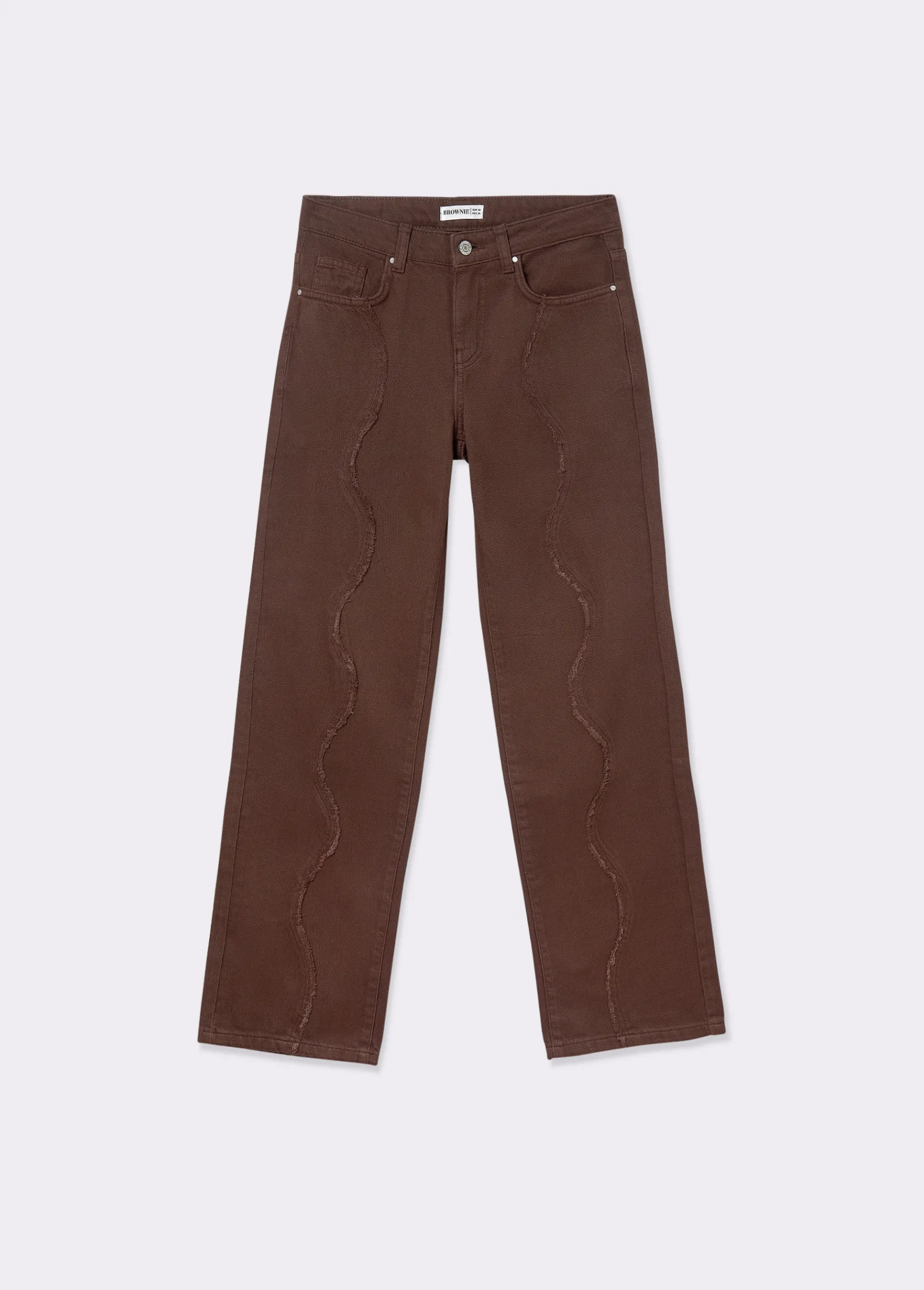 Pantalón recto con detalle de ondas en la parte frontal. Cierre mediante cremallera y botón.