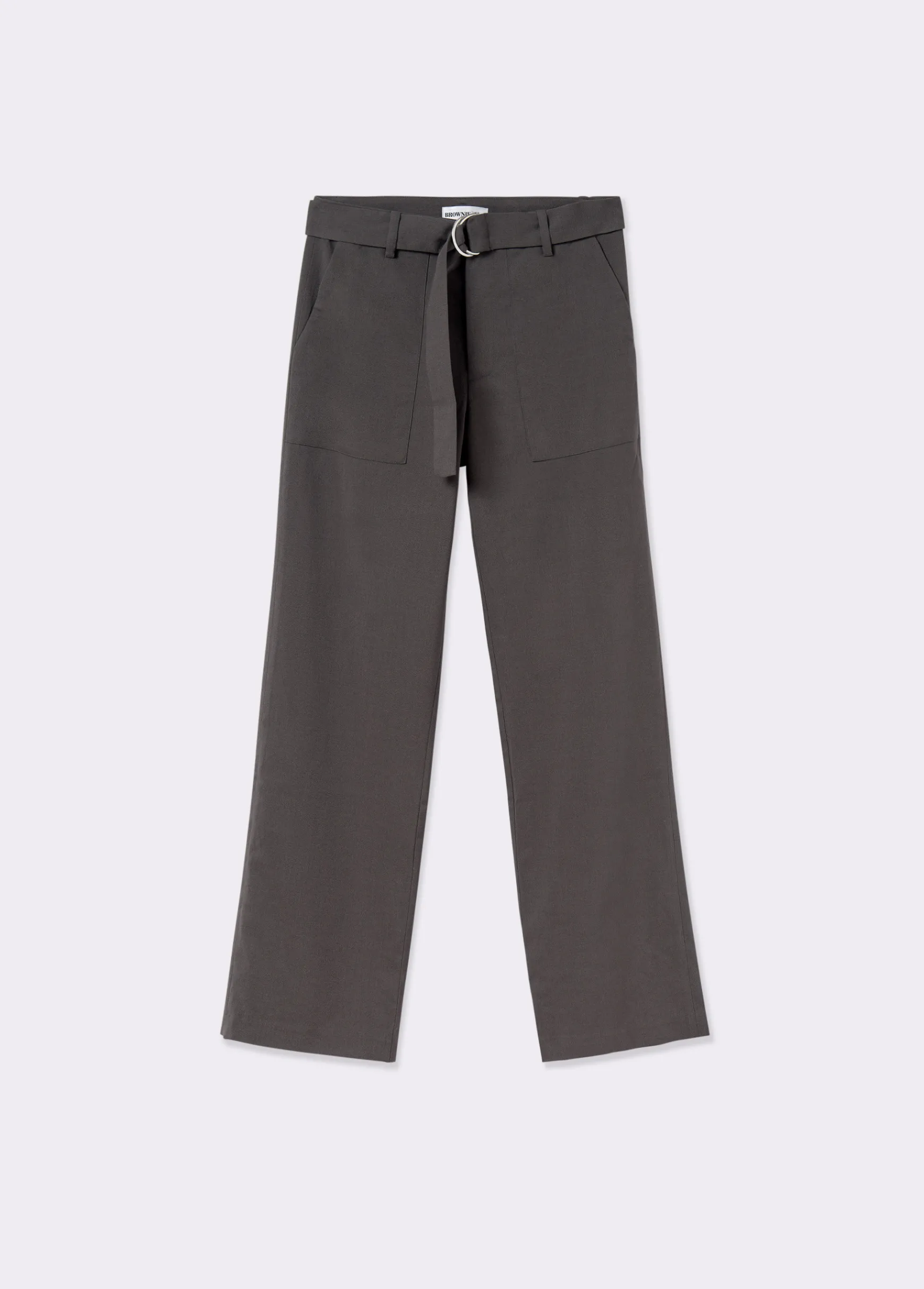 Pantalón recto con detalle de cinturón y bolsillos. Cierre mediante cremallera y botón.