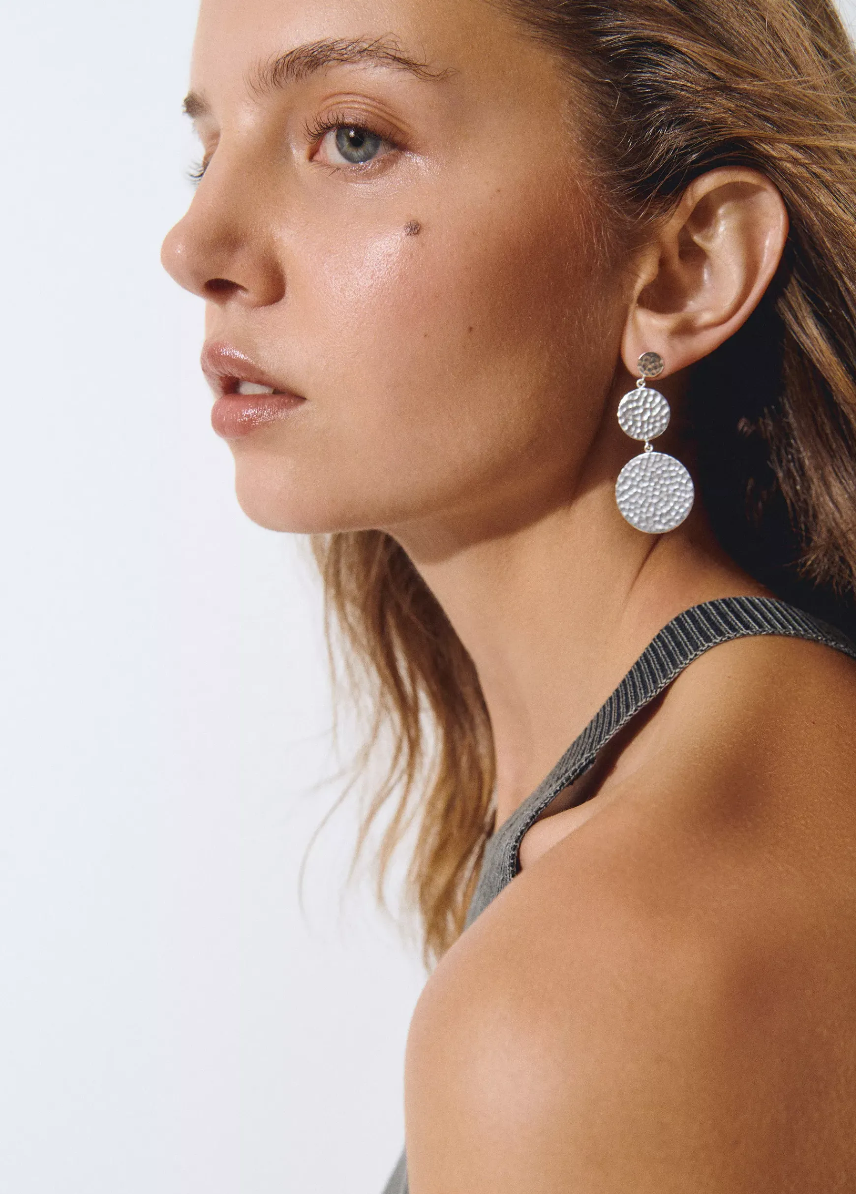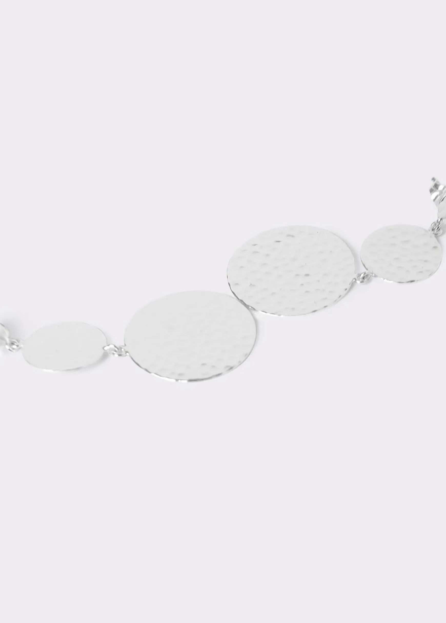 Pendientes largos plateados con forma de tres discos. Cierre de presión.