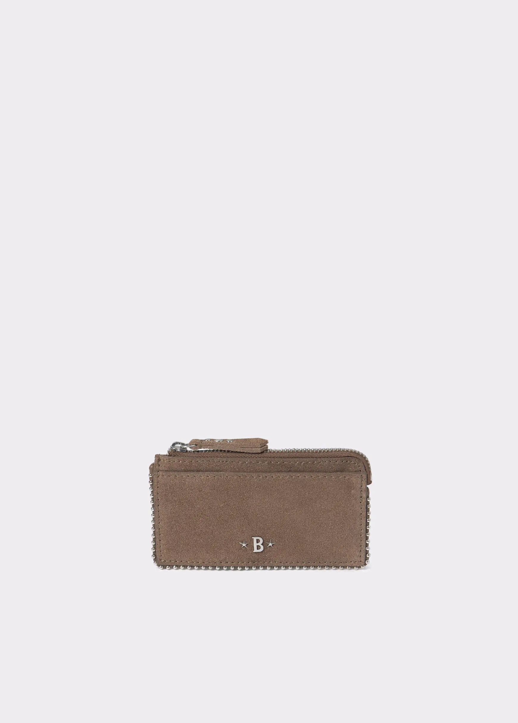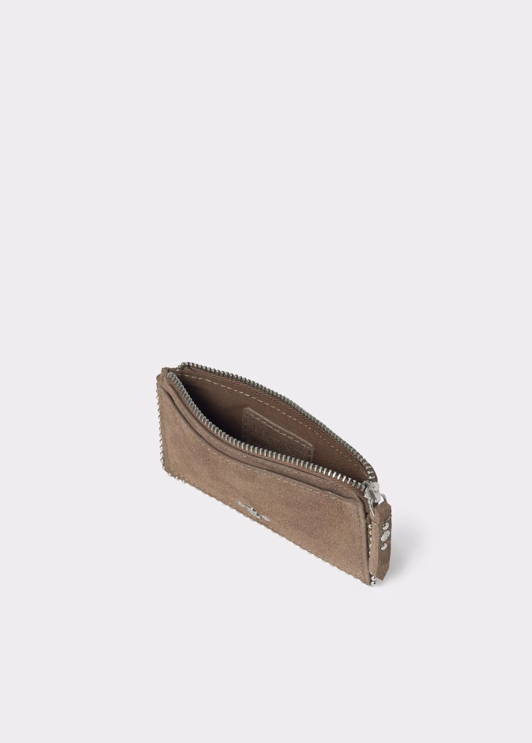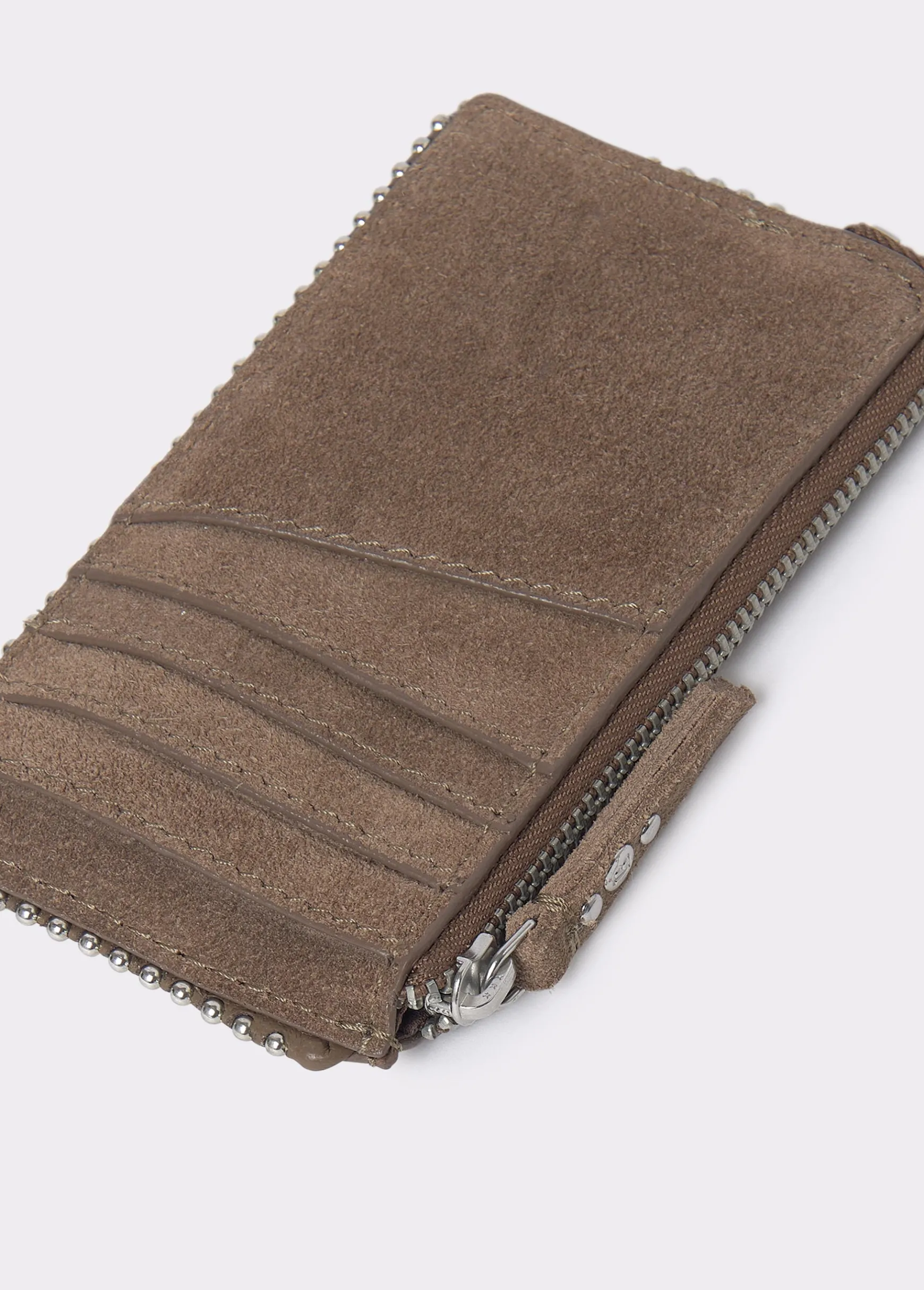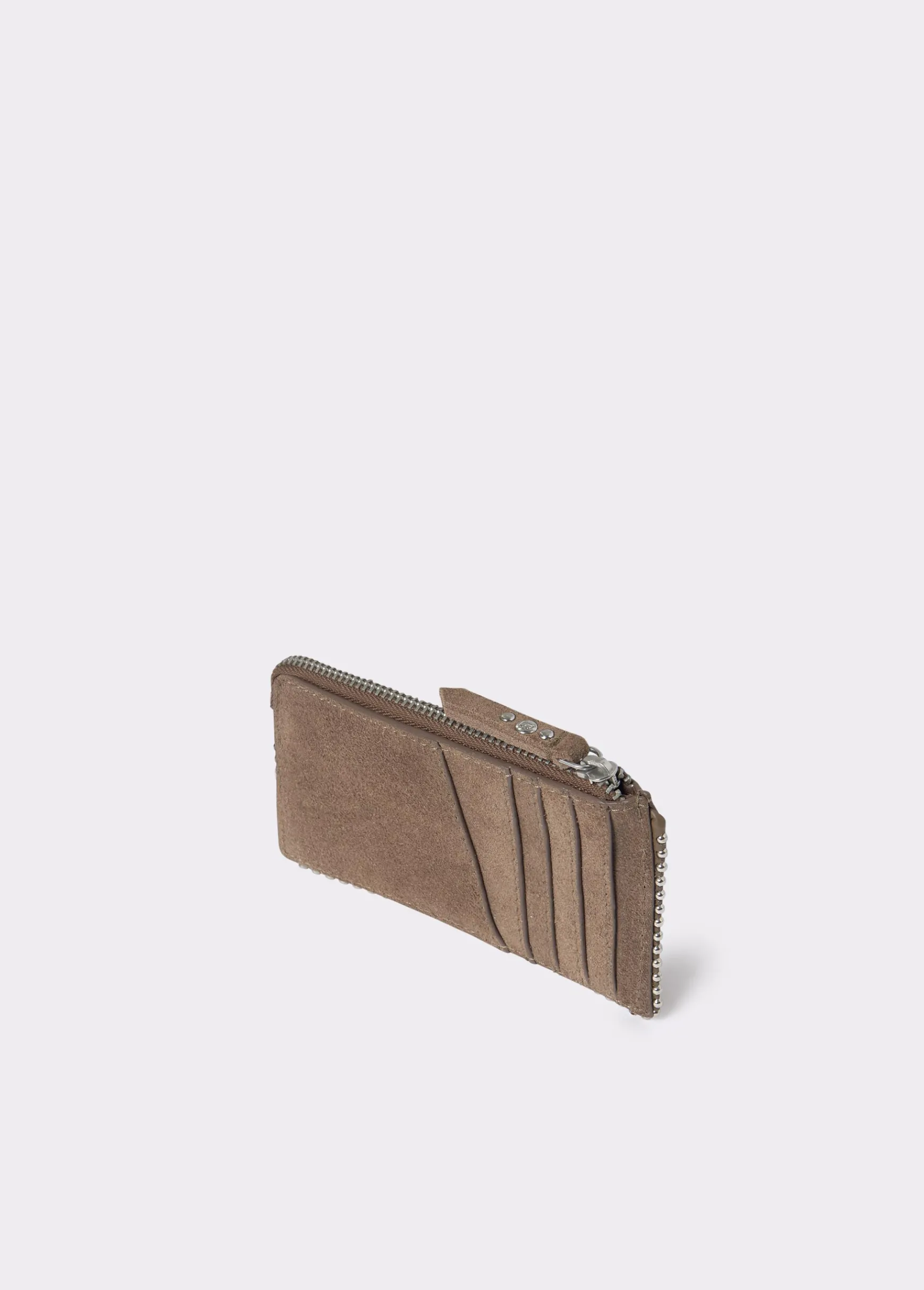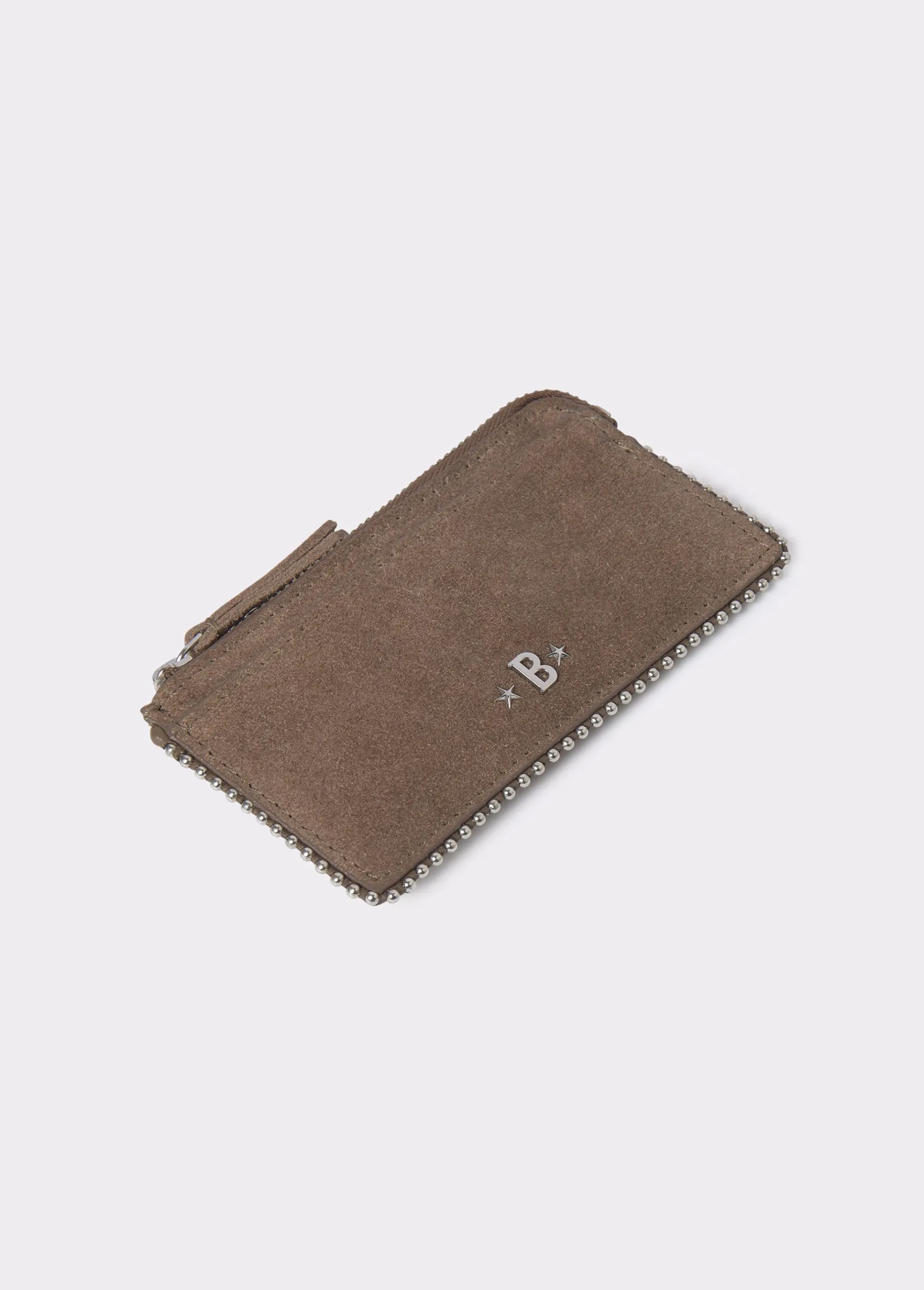 Tarjetero de piel de color taupe oscuro con detalle de bolitas en plata. Dispone de cremallera y de ranuras para tarjetas.