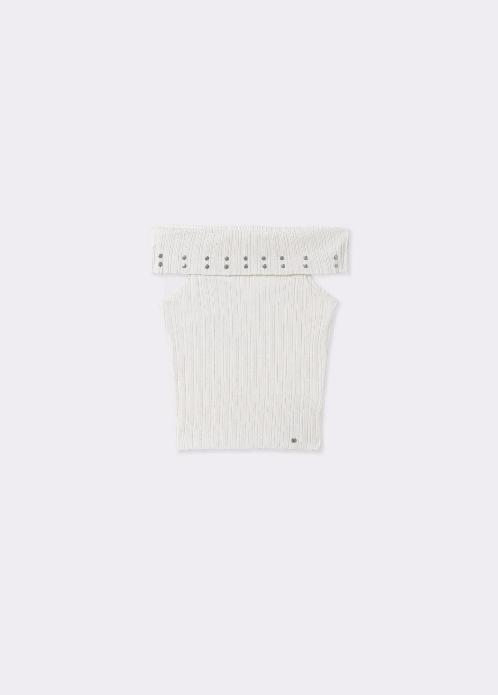 Top liso de manga corta con cuello de barco y detalle de tachas.